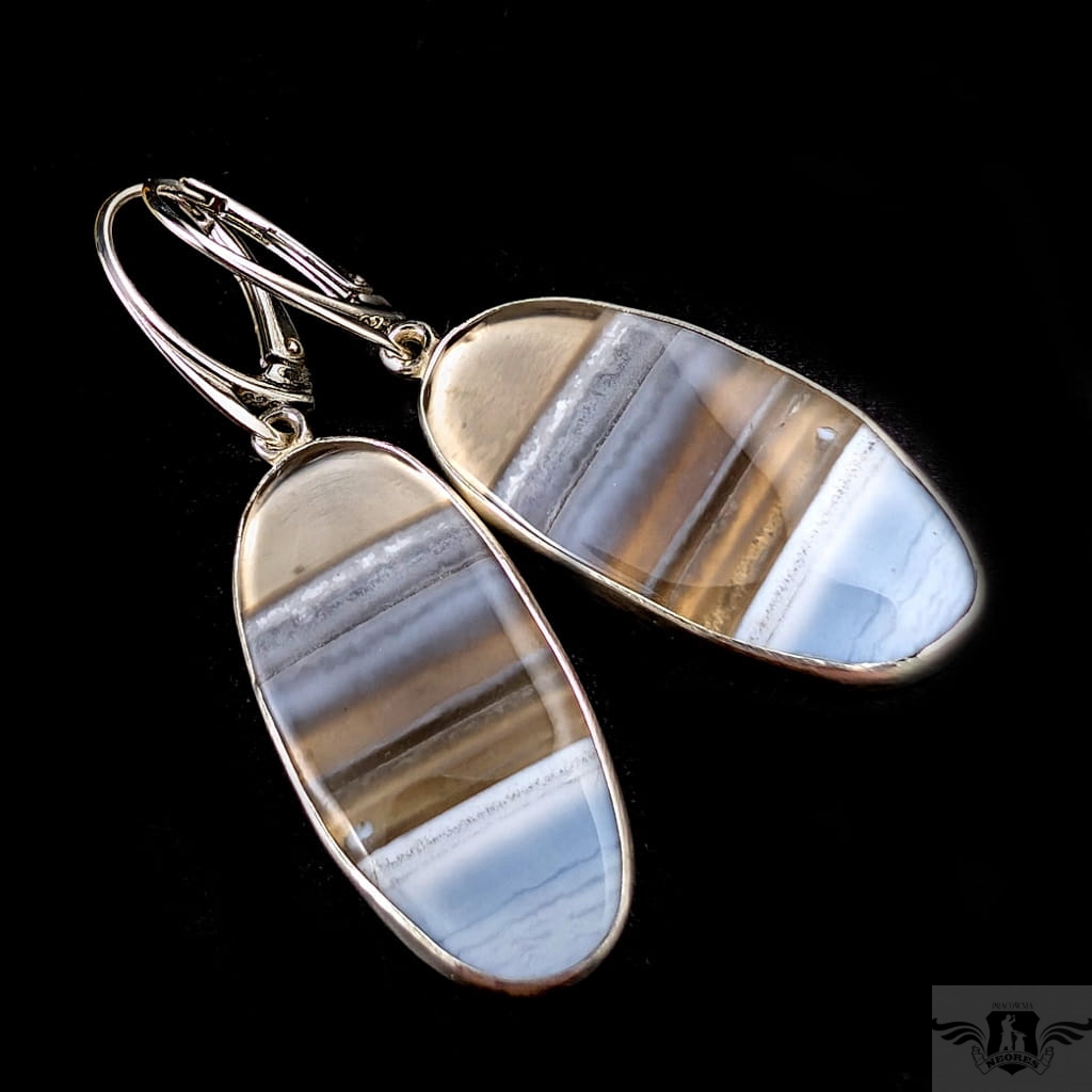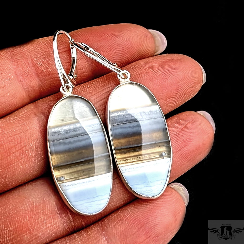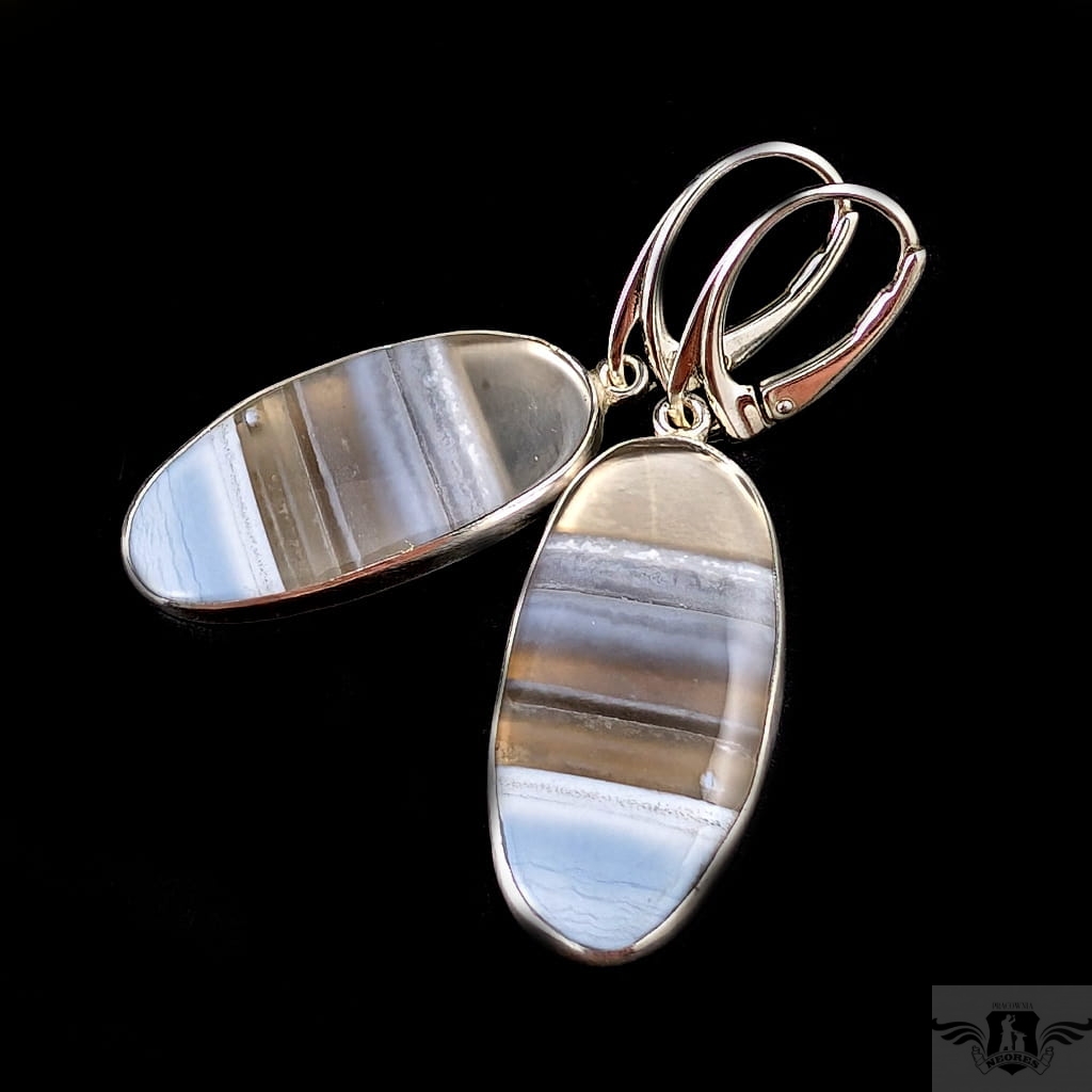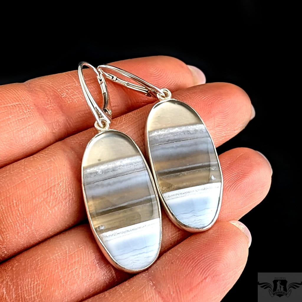 Kolczyki wykonane własnoręcznie ze srebra 925 oraz pięknych nieszlachetnych Piękne pasma minerałów. Wymiary elementów oprawy kamienia 30 x 15 mm. Zapinane na klasyczne bigle angielskie. Długość całości z biglami 47 mm. Waga jednego kolczyka 5 gramów Kolczyki zostaną zapakowane w ozdobne pudełeczko.