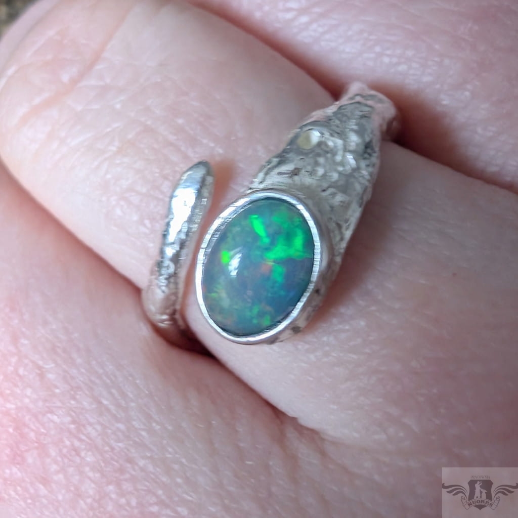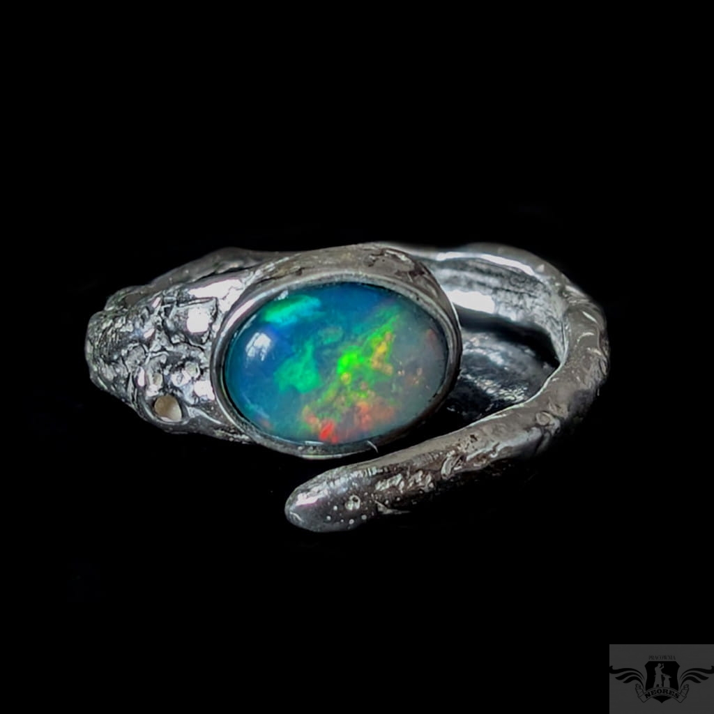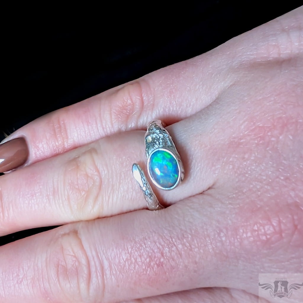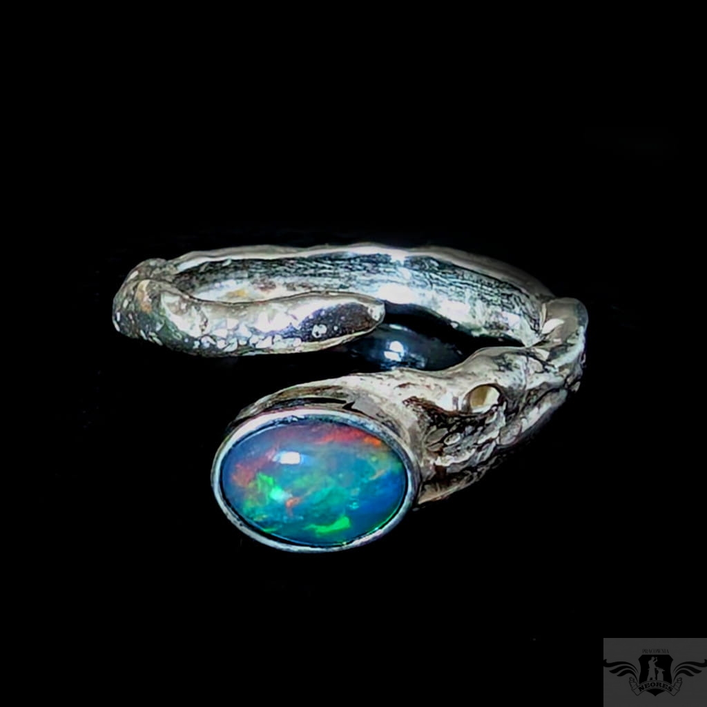 Pierścionek wykonany ze srebra próby 925. Rozmiar pierścionka dzięki otwartej podstawie regulowany, mogę dopasować na dowolny rozmiar w zakresie 9-24 Ozdobą pierścionka jest multibarwny, piękny opal z Etiopii. Wymiary oprawy kamienia 9 x 7 mm, szerokość maksymalna obrączki 6 mm, min. 4 mm. Waga 4 g. Pierścień zostanie zapakowany w ozdobne pudełeczko.
