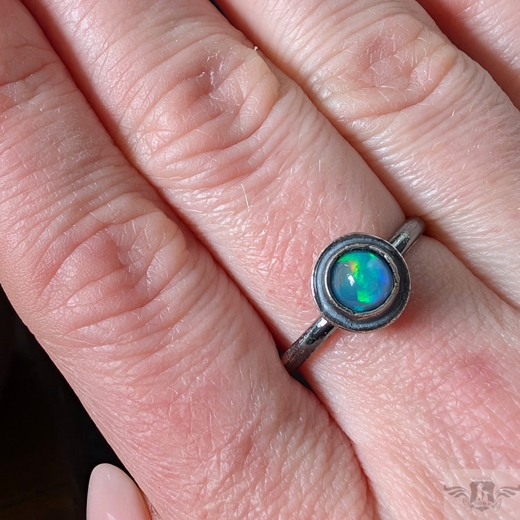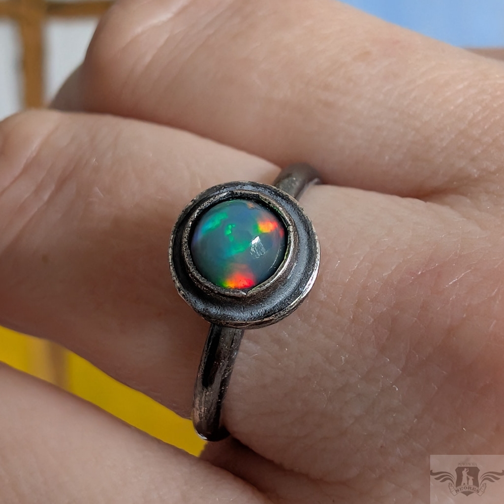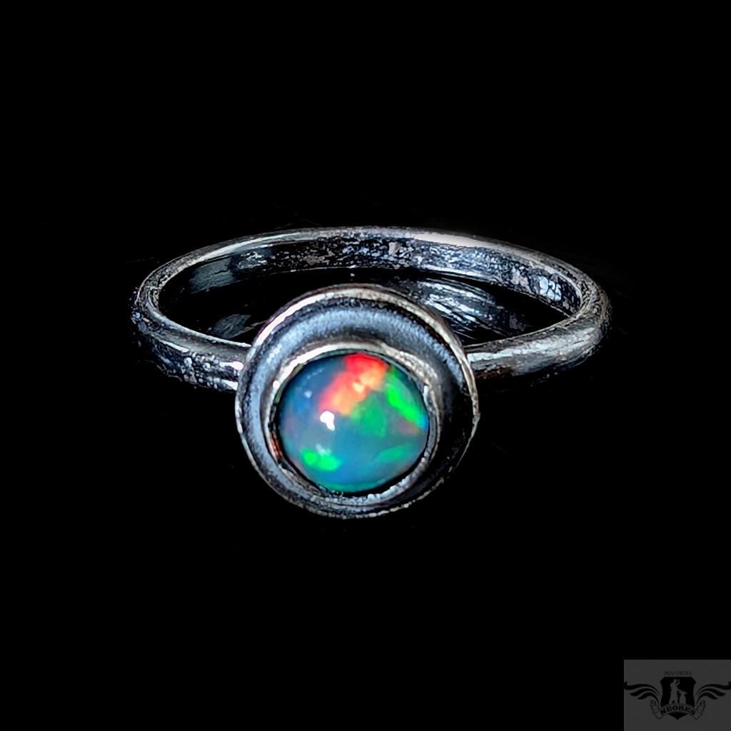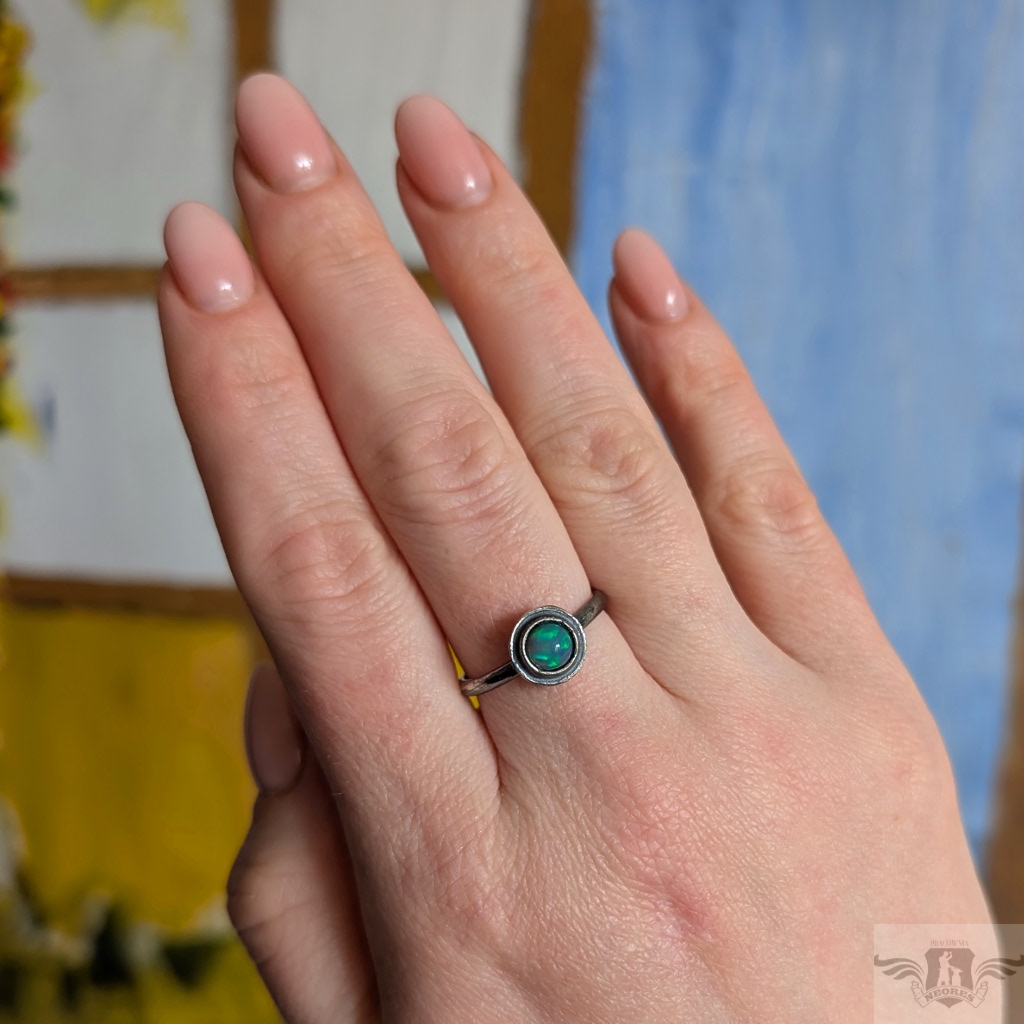 Pierścień z oprawionym opalem etiopskim o niebieskiej tafli z zieloną poświatą. Srebro pr.925, oksydowane. Srednica oprawy 9 mm. Waga 2,5 g. Rozmiar jubilerski 18. Obrączka ma 2 mm szerokości. Zapakowany w ozdobne pudełeczko.