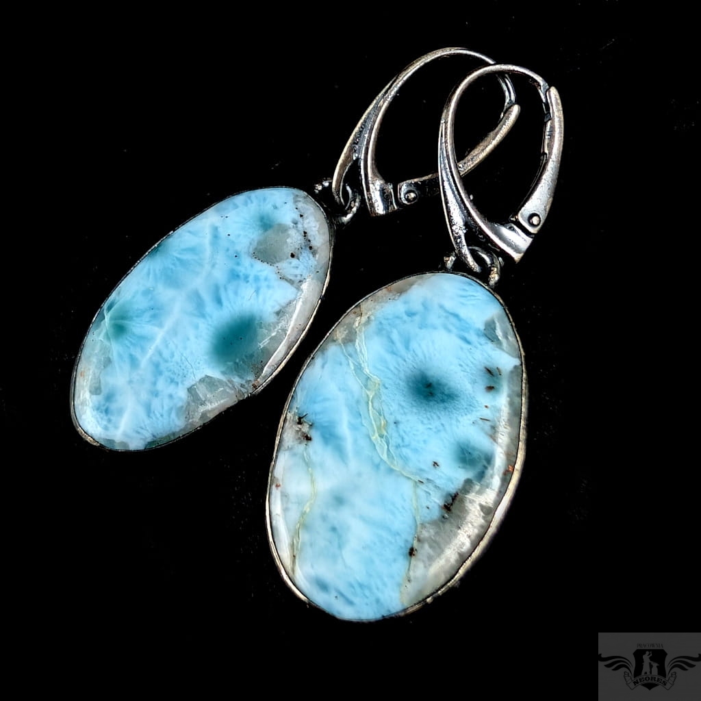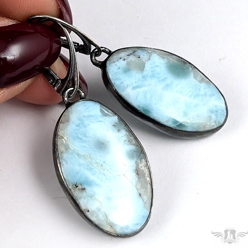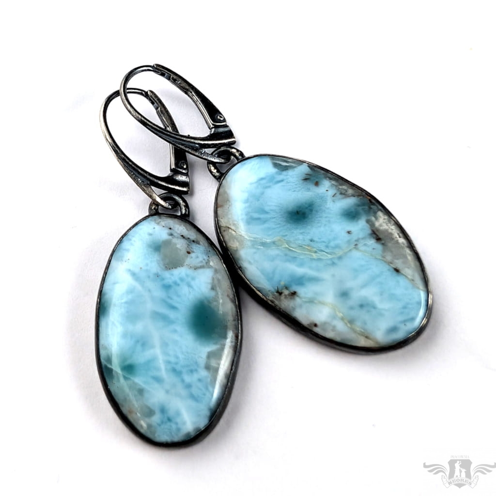 Kolczyki wykonane z oksydowanego srebra próby 925 oraz pięknych larimarów o niesamowicie urokliwym malunku. Długość całkowita z biglami 47mm, wymiary elementów z kamieniami 27 x17 mm. Waga jednego kolczyka 5,2 grama Kolczyki zostaną zapakowane w ozdobne pudełeczko.