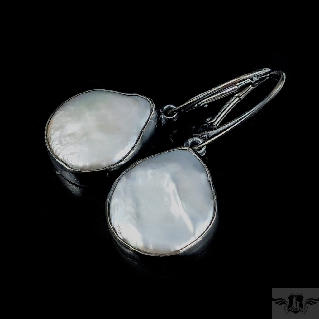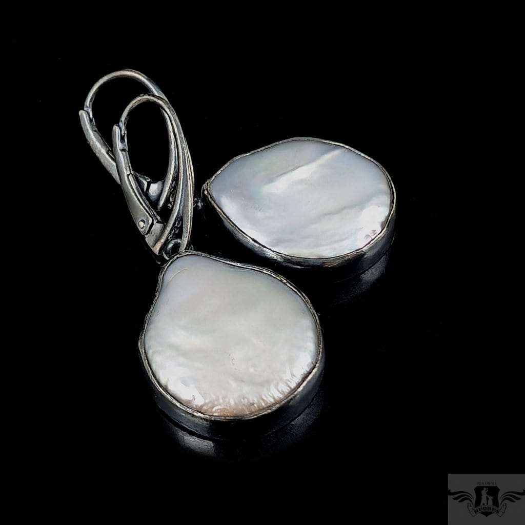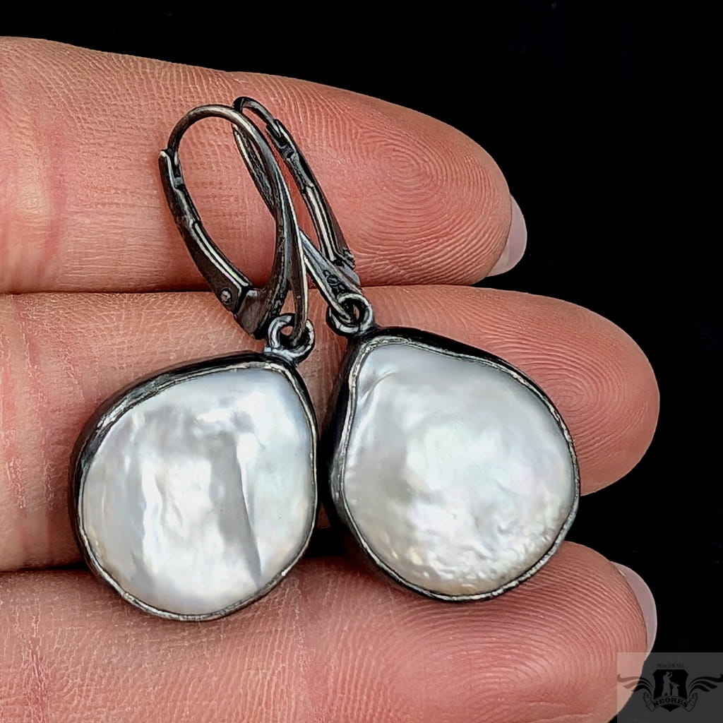 Kolczyki wykonane z oksydowanego srebra próby 925 z wkomponowanymi pięknymi perłami hodowlanymi. Ponadczasowa elegancja, klasyka z nutą awangardy. Wymiary 18 x 17 mm, długość z biglami 37 mm. Waga jednego kolczyka 4,5 grama. Kolczyki zostaną zapakowane w ozdobne pudełeczko.