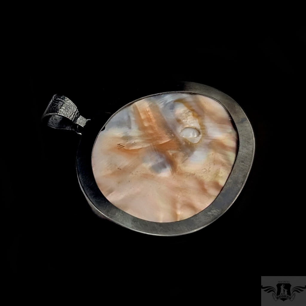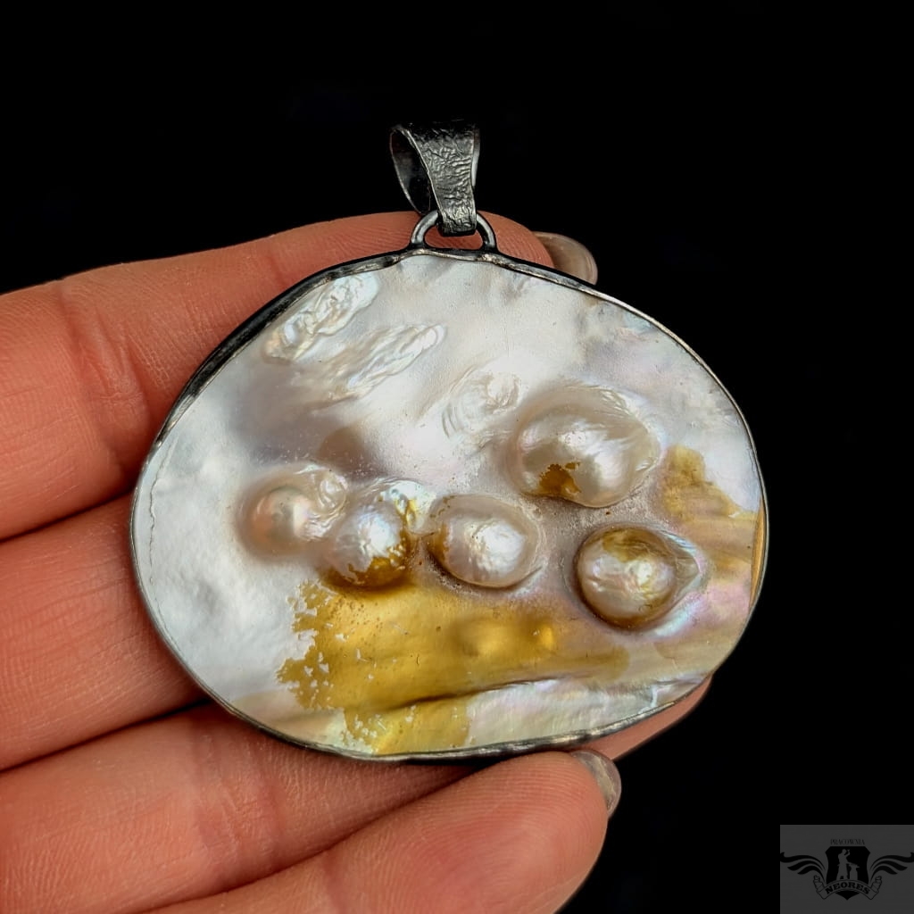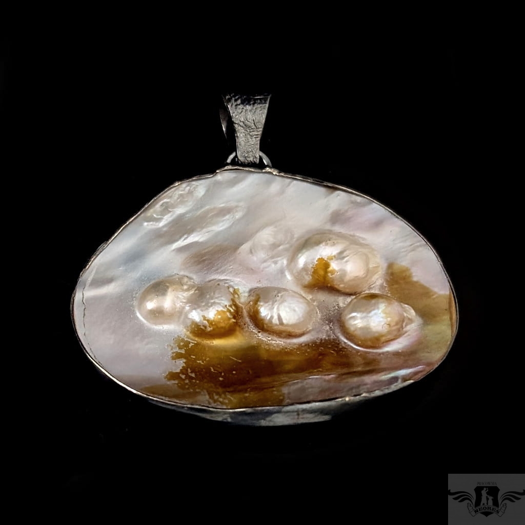 Wisior wykonany z oksydowanego srebra próby 925 z oprawioną muszlą, którą narastają perły. Przepiękne zjawisko. Ponadczasowa elegancja, klasyka z nutą awangardy. Wymiary 53 x 40 mm, długość max 55 mm. Waga 14 g. Polecam, piękna, ponadczasowa biżuteria.