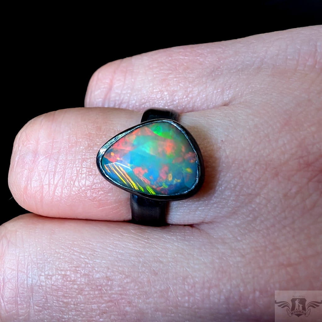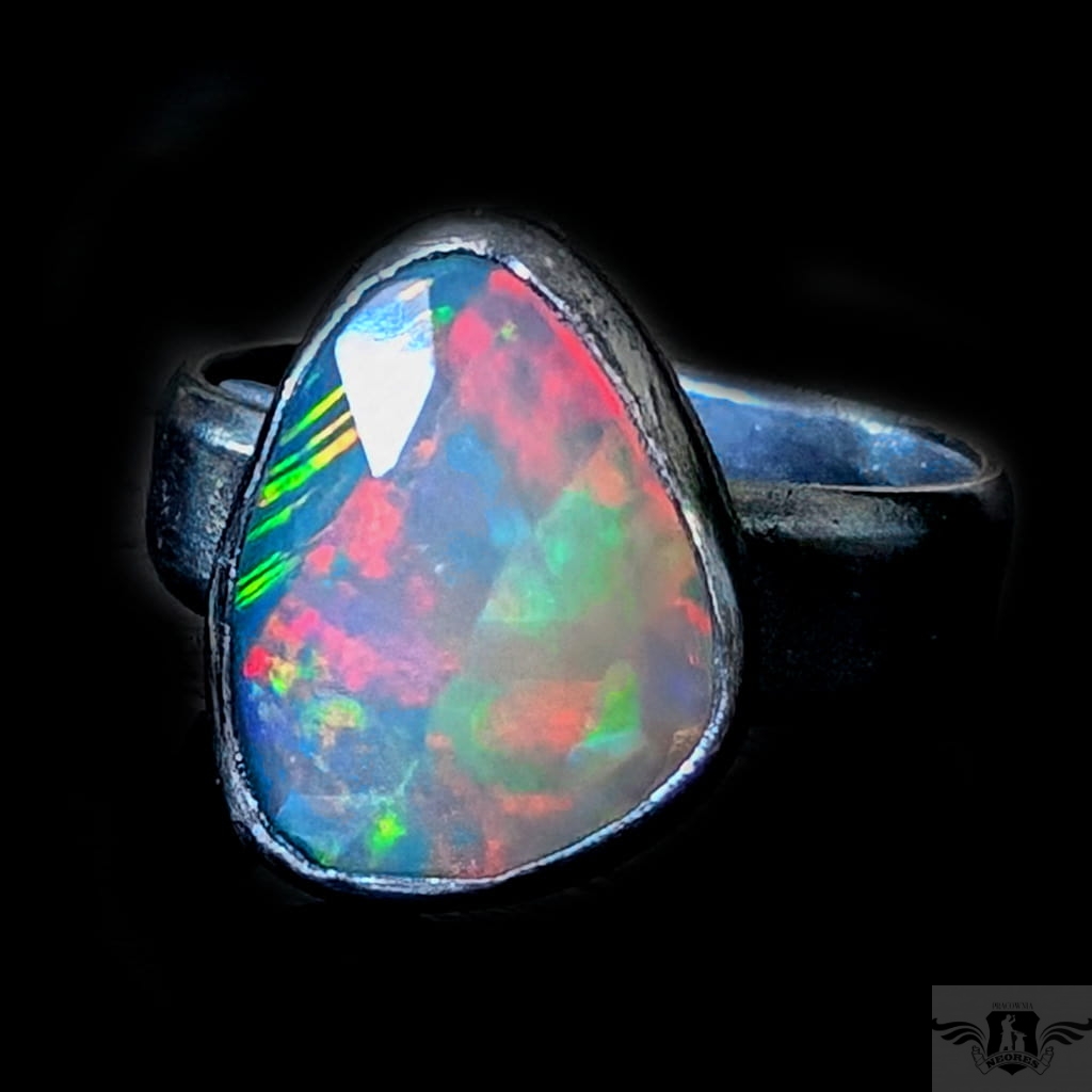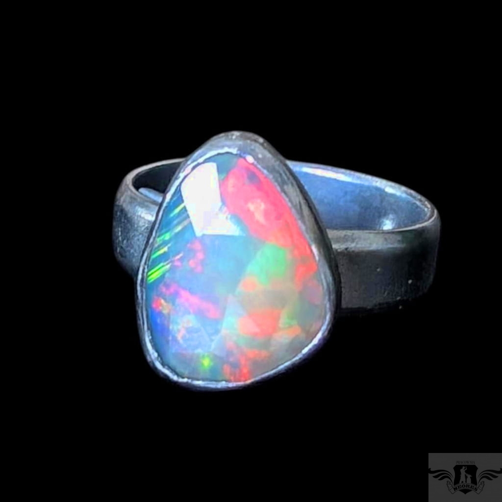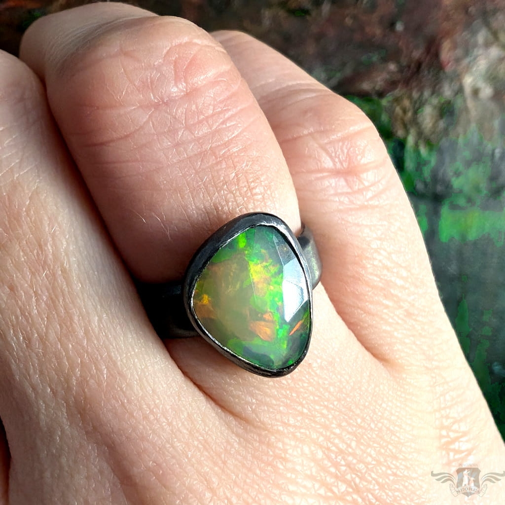 Piękny, surowy pierścień z oprawionym własnoręcznie szlachetnym opalem etiopskim o niezwykle kolorowej tafli dodatkowo spotęgowanej fasetowaniem na całej powierzchni. Kamień o wspaniałej opalizacji barw. Piękno nie do oddania na zdjęciu. Srebro pr.925, oksydowane. Wymiary 15 x 11 mm. Waga 4,7 g. Obrączka regulowana w szerokim zakresie, proszę o kontakt po zakupie, to dopasuję na konkretny rozmiar. Obrączka ma 5 mm szerokości.