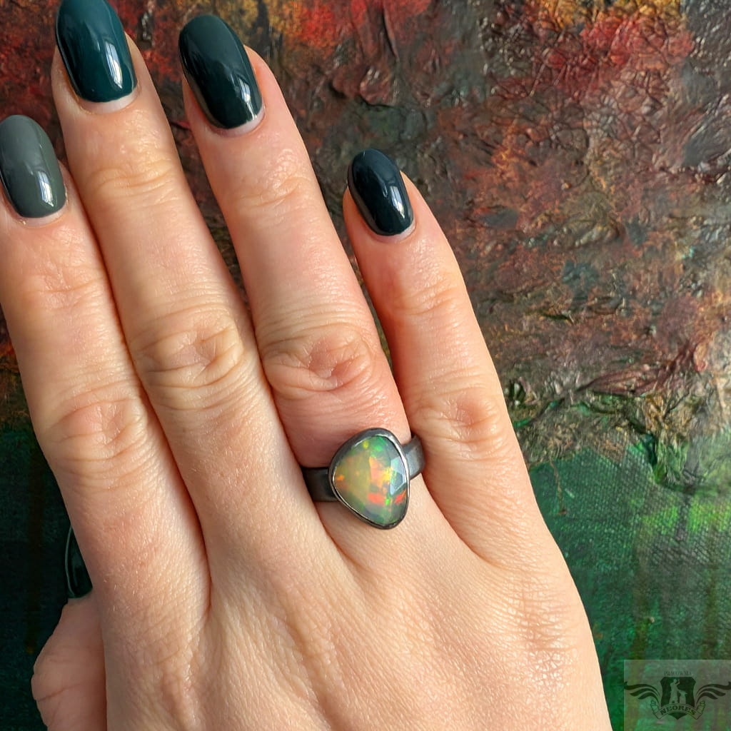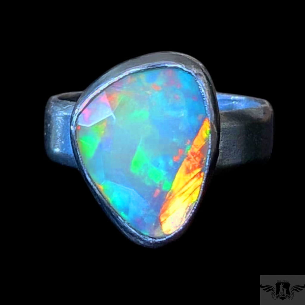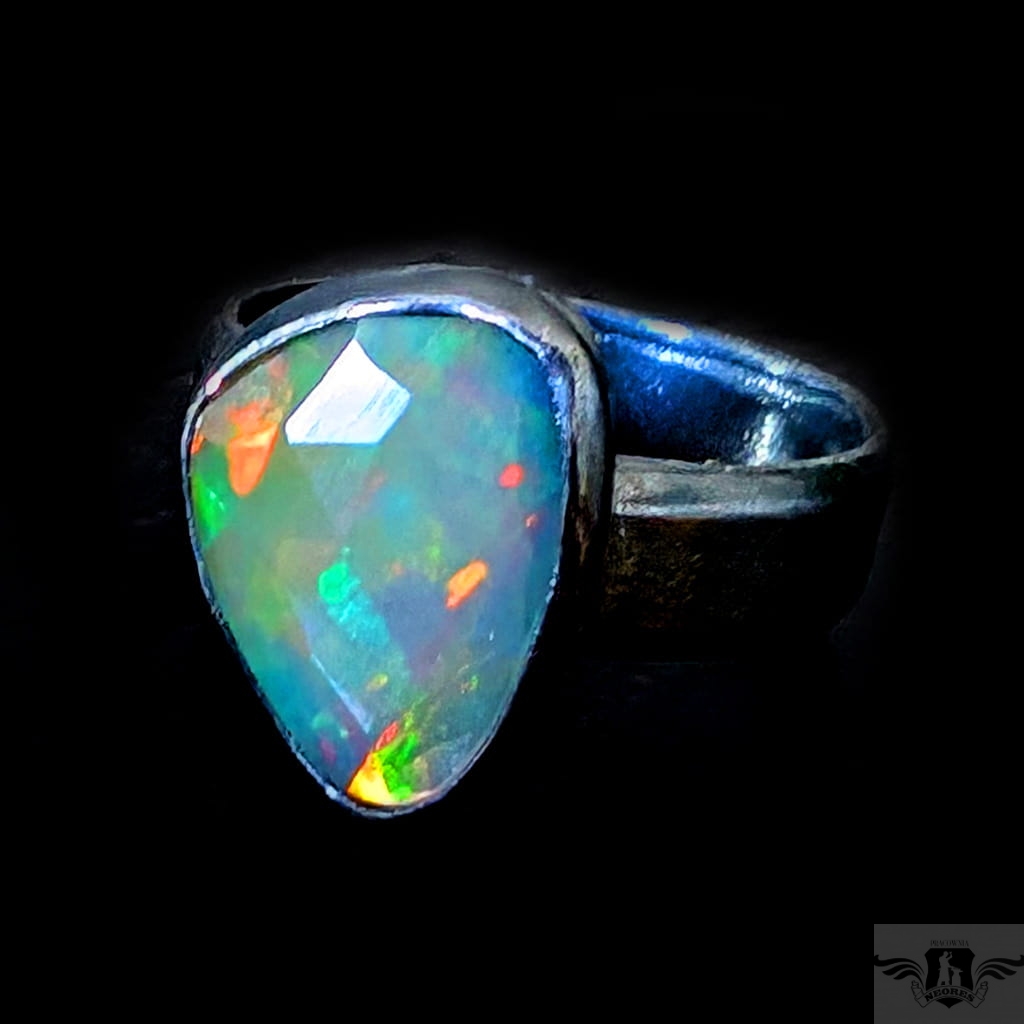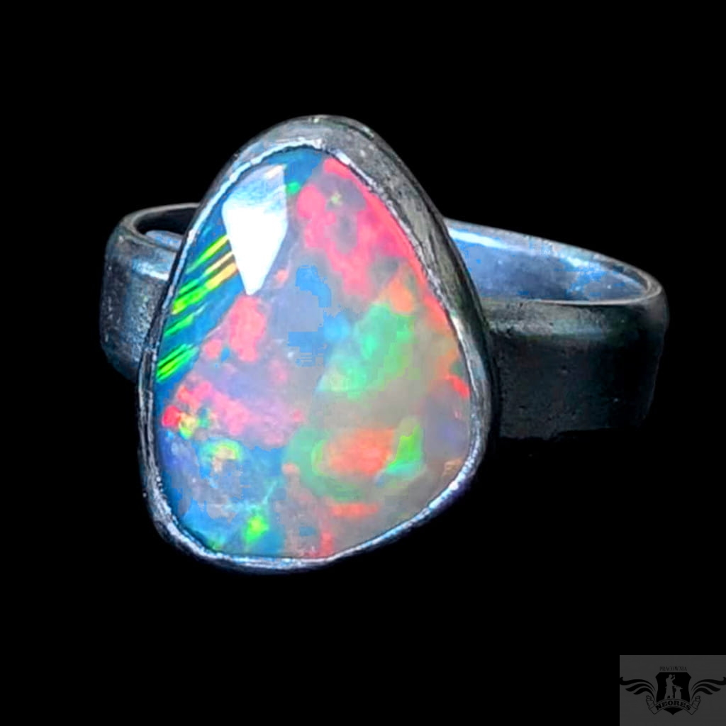 Piękny, surowy pierścień z oprawionym własnoręcznie szlachetnym opalem etiopskim o niezwykle kolorowej tafli dodatkowo spotęgowanej fasetowaniem na całej powierzchni. Kamień o wspaniałej opalizacji barw. Piękno nie do oddania na zdjęciu. Srebro pr.925, oksydowane. Wymiary 15 x 11 mm. Waga 4,7 g. Obrączka regulowana w szerokim zakresie, proszę o kontakt po zakupie, to dopasuję na konkretny rozmiar. Obrączka ma 5 mm szerokości.