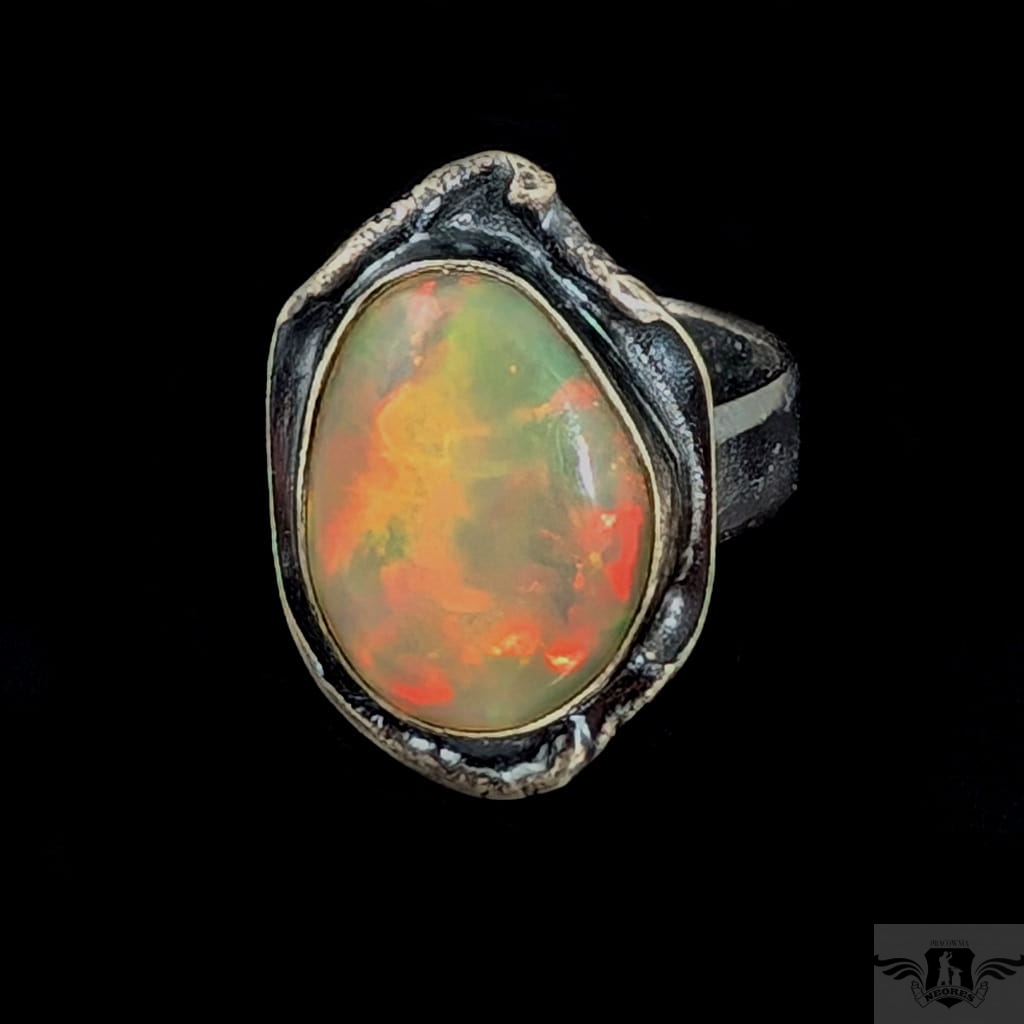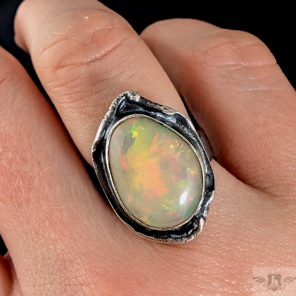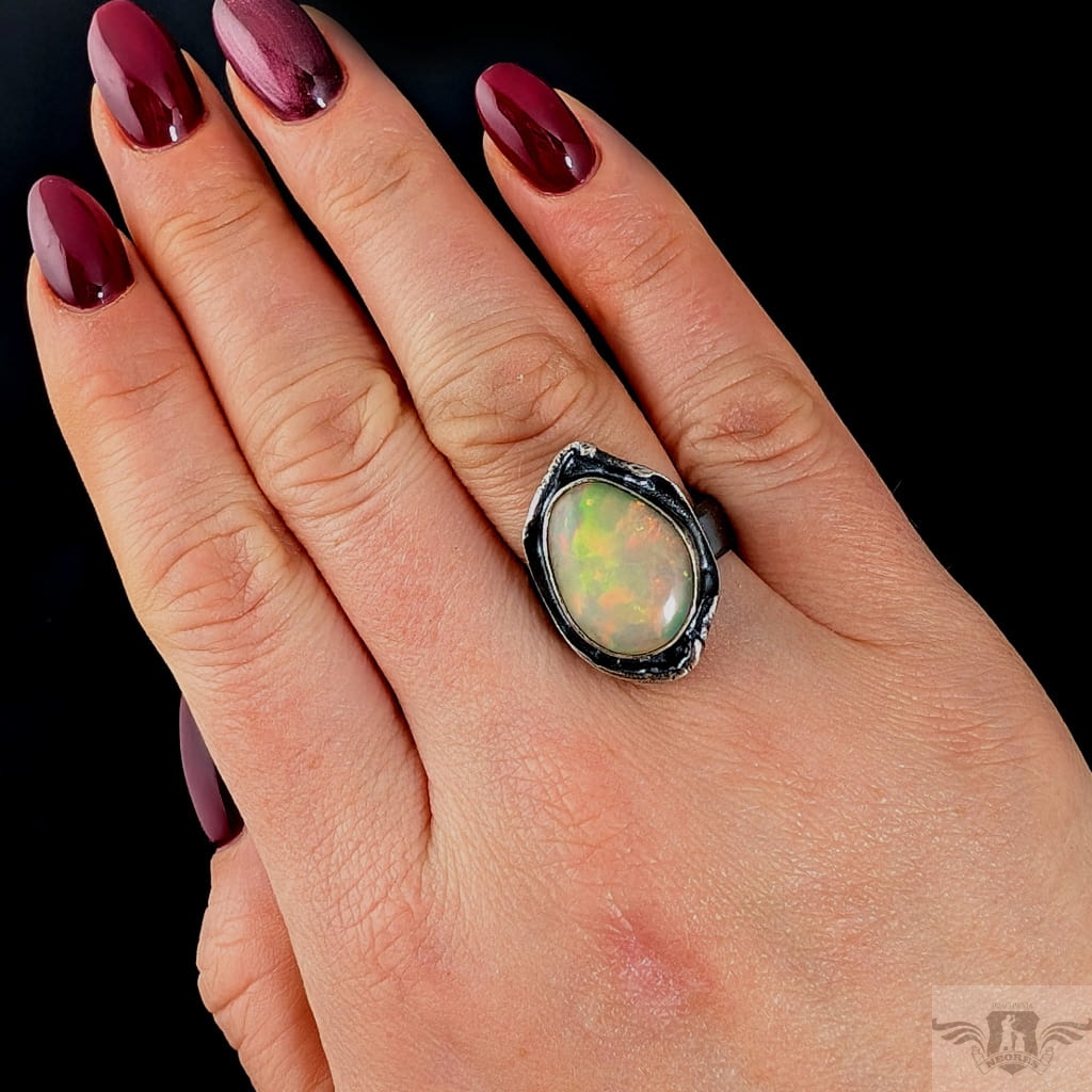 Pierścień z oprawionym opalem etiopskim o niezwykle kolorowej tafli. Kamień o wspaniałej opalizacji barw. Srebro pr.925, oksydowane. Wymiary oprawy 23 x 16 mm. Waga 7,3 g. Obrączka regulowana w szerokim zakresie (10-24), proszę napisać po zakupie, to dopasuję na konkretny rozmiar. Obrączka ma 5 mm szerokości. Zapakowany w ozdobne pudełeczko.