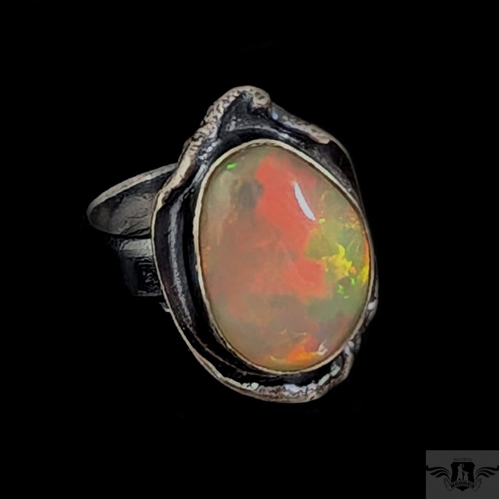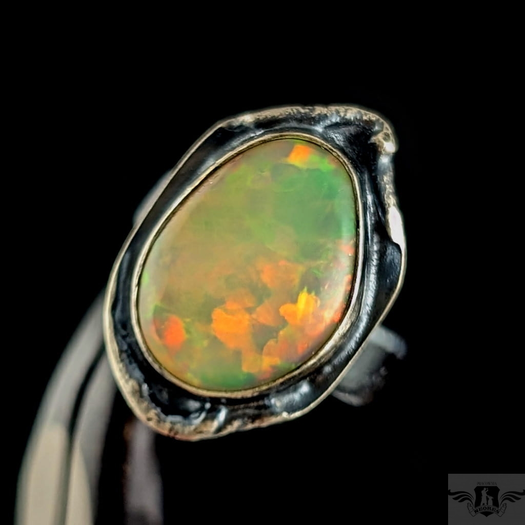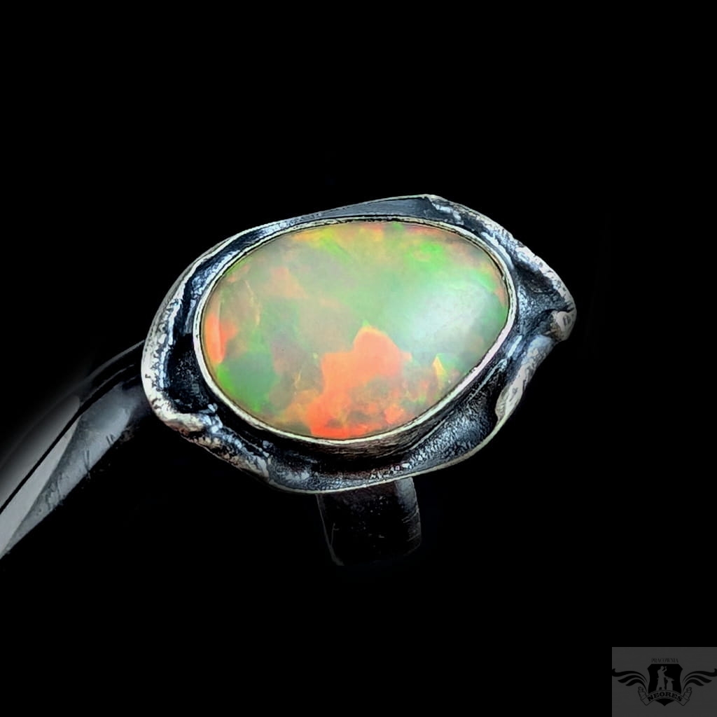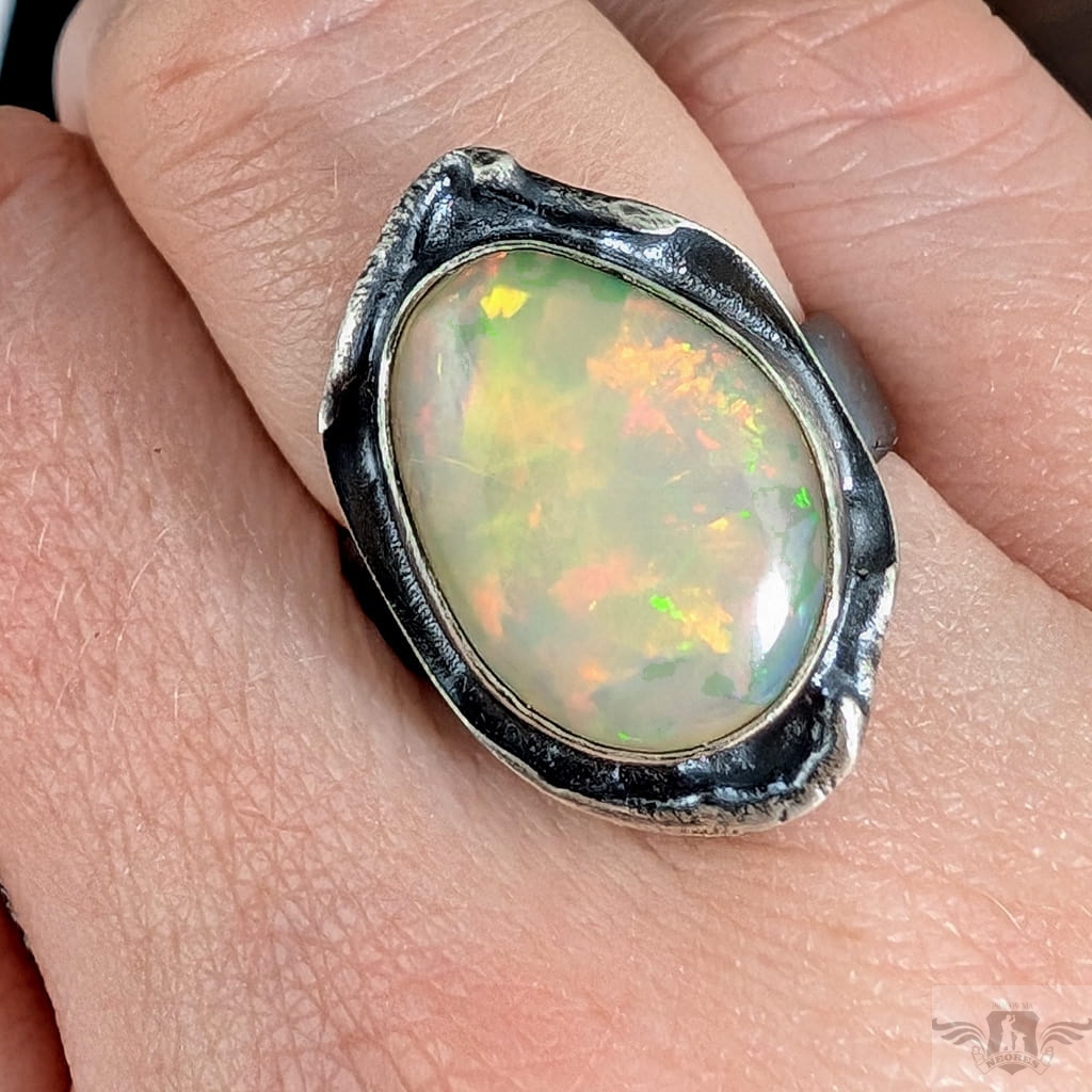 Pierścień z oprawionym opalem etiopskim o niezwykle kolorowej tafli. Kamień o wspaniałej opalizacji barw. Srebro pr.925, oksydowane. Wymiary oprawy 23 x 16 mm. Waga 7,3 g. Obrączka regulowana w szerokim zakresie (10-24), proszę napisać po zakupie, to dopasuję na konkretny rozmiar. Obrączka ma 5 mm szerokości. Zapakowany w ozdobne pudełeczko.