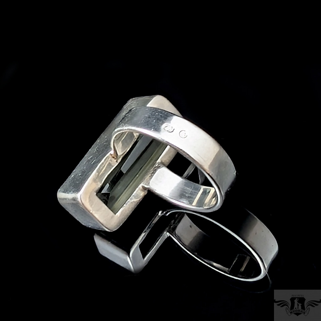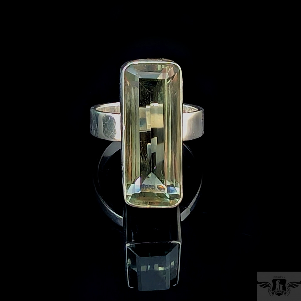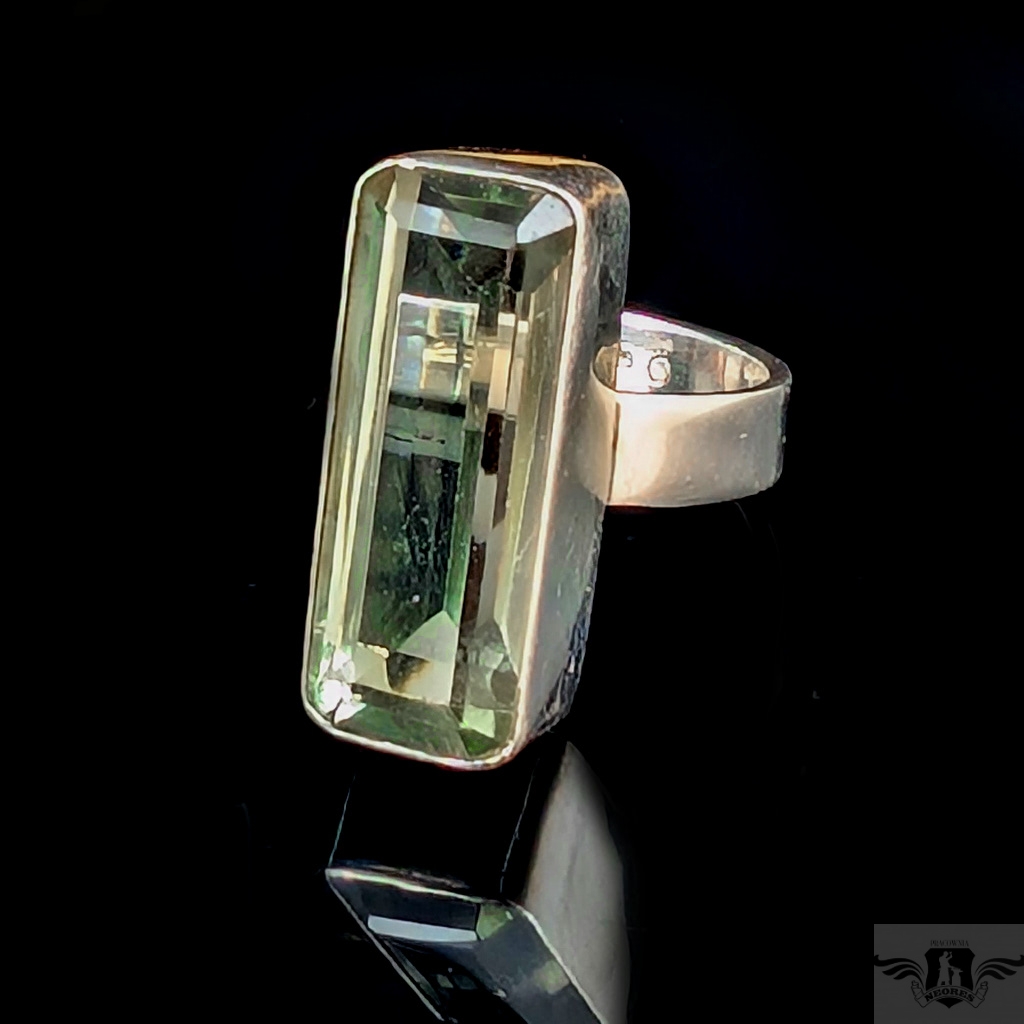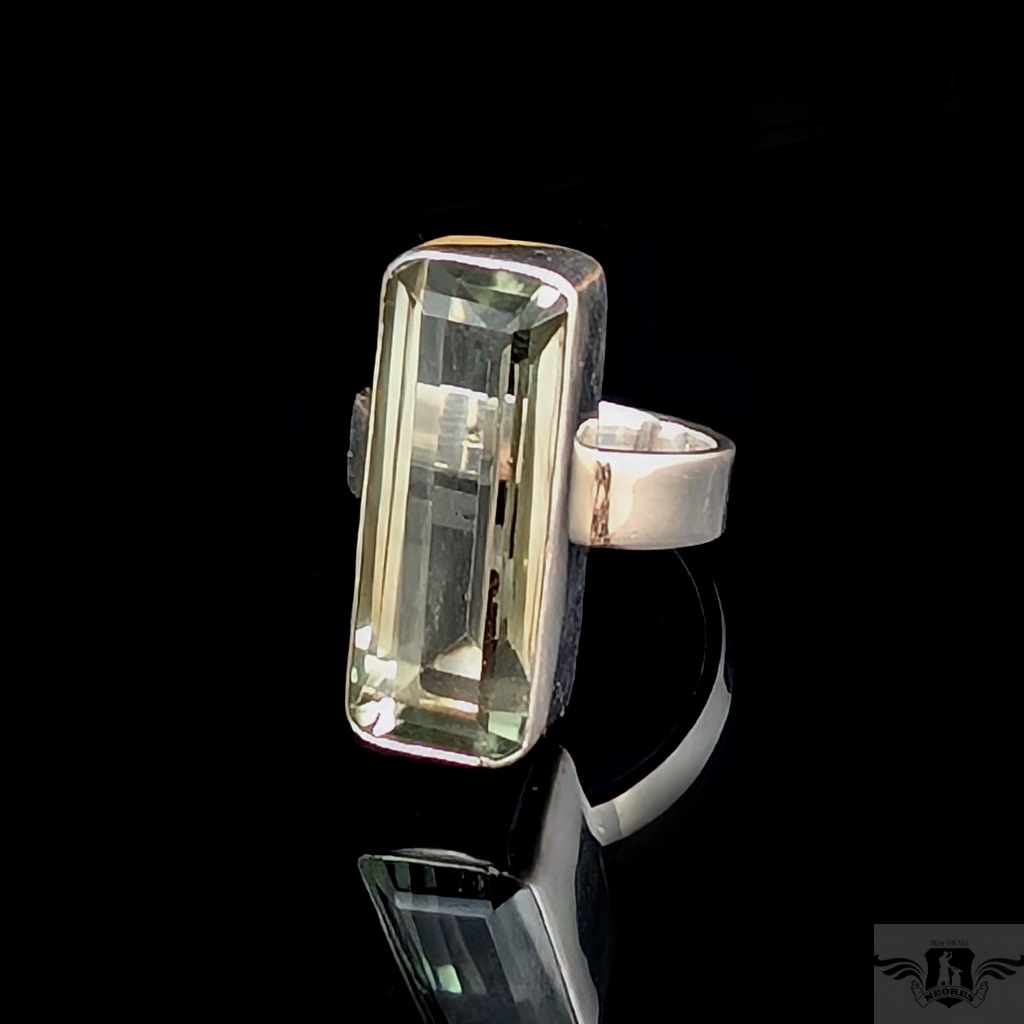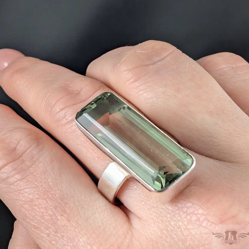 Bardzo okazały pierścień wykonany ze srebra próby 925 oraz zielonego kryształu ametystu o precyzyjnym, pieknym szlifie. Wymiary oprawy kamienia 26 x 10 mm. Rozmiar jubilerski 20, mogę powięszyć do max 21. Dostępne są inne rozmiary. Waga 12 g. Wykonany przez dostawcę kamieni. Pierścień zostanie wysłany w ozdobnym pudełeczku.