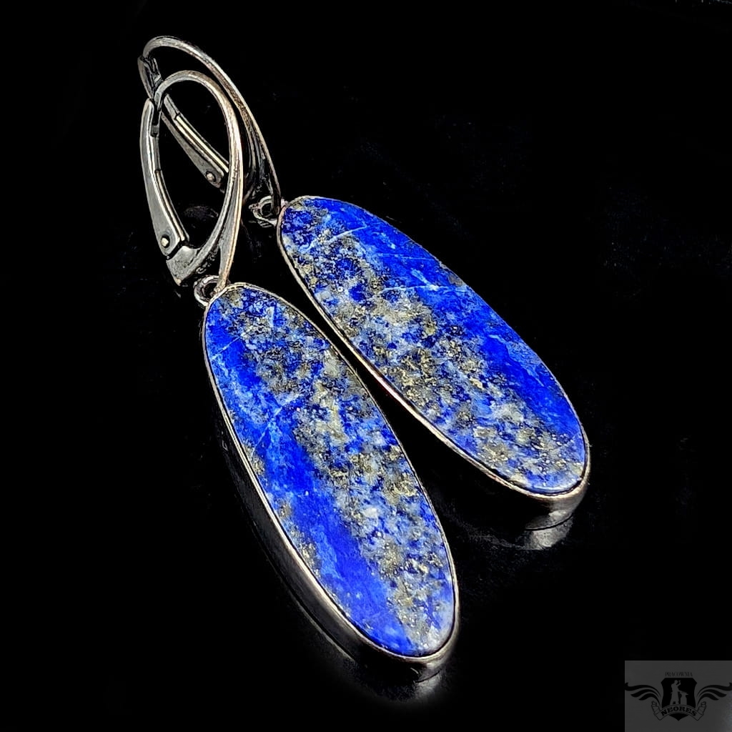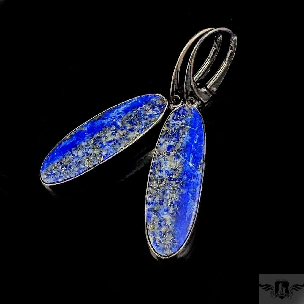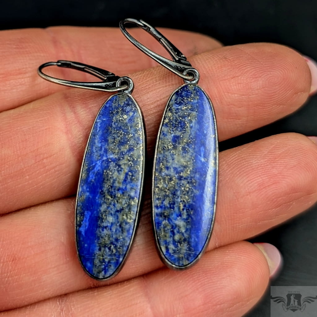 Lapis lazuli to piękna skała stworzona naturalnie z minerału azuryt z domieszkami licznych minerałów, z których najbardziej pożądany jest piryt. Od starożytności lapis lazuli zdobił biżuterię,a także wykorzystywany był jako materiał na przedmioty kultu, precjoza (np. maska grobowca Tutenchamona). Kolczyki z lapisem lazuli oprawionym w oksydowane srebro próby 925. Wymiary całej oprawy 32 x 11 mm. Długość z biglami 50 mm. Waga jednego 6,6 g. Zostaną zapakowane w ozdobne pudełeczko.