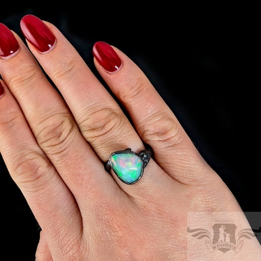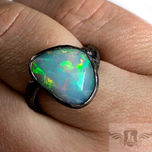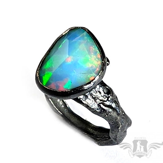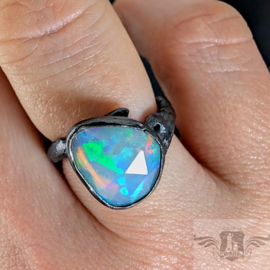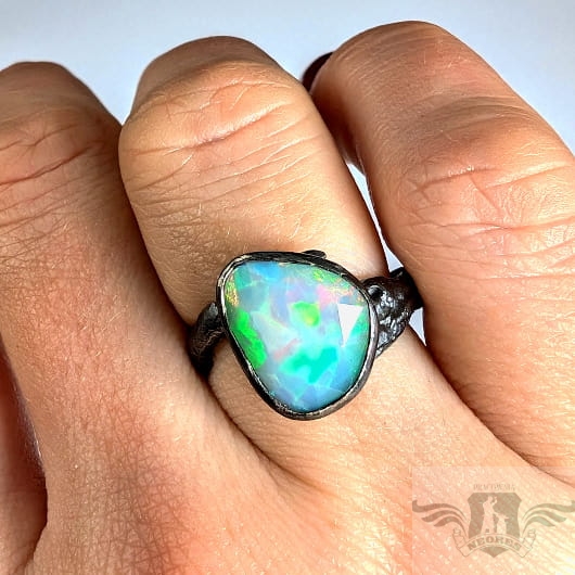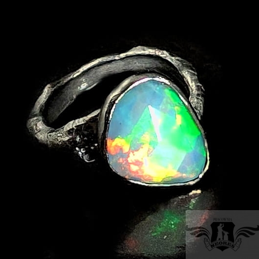 Piękny, surowy pierścień z oprawionym własnoręcznie szlachetnym opalem etiopskim o niezwykle kolorowej tafli dodatkowo spotęgowanej fasetowaniem na całej powierzchni. Kamień o wspaniałej opalizacji barw. Piękno nie do oddania na zdjęciu. Srebro pr.925, oksydowane. Wymiary oprawy 14 x 12 mm. Waga 4,8 g. Obrączka regulowana w szerokim zakresie (9-23), proszę o kontakt po zakupie, to dopasuję na konkretny rozmiar. Obrączka ma 4 do 7 mm szerokości. Zapakowany w ozdobne pudełeczko.