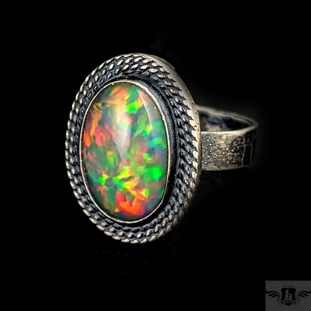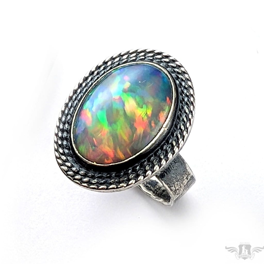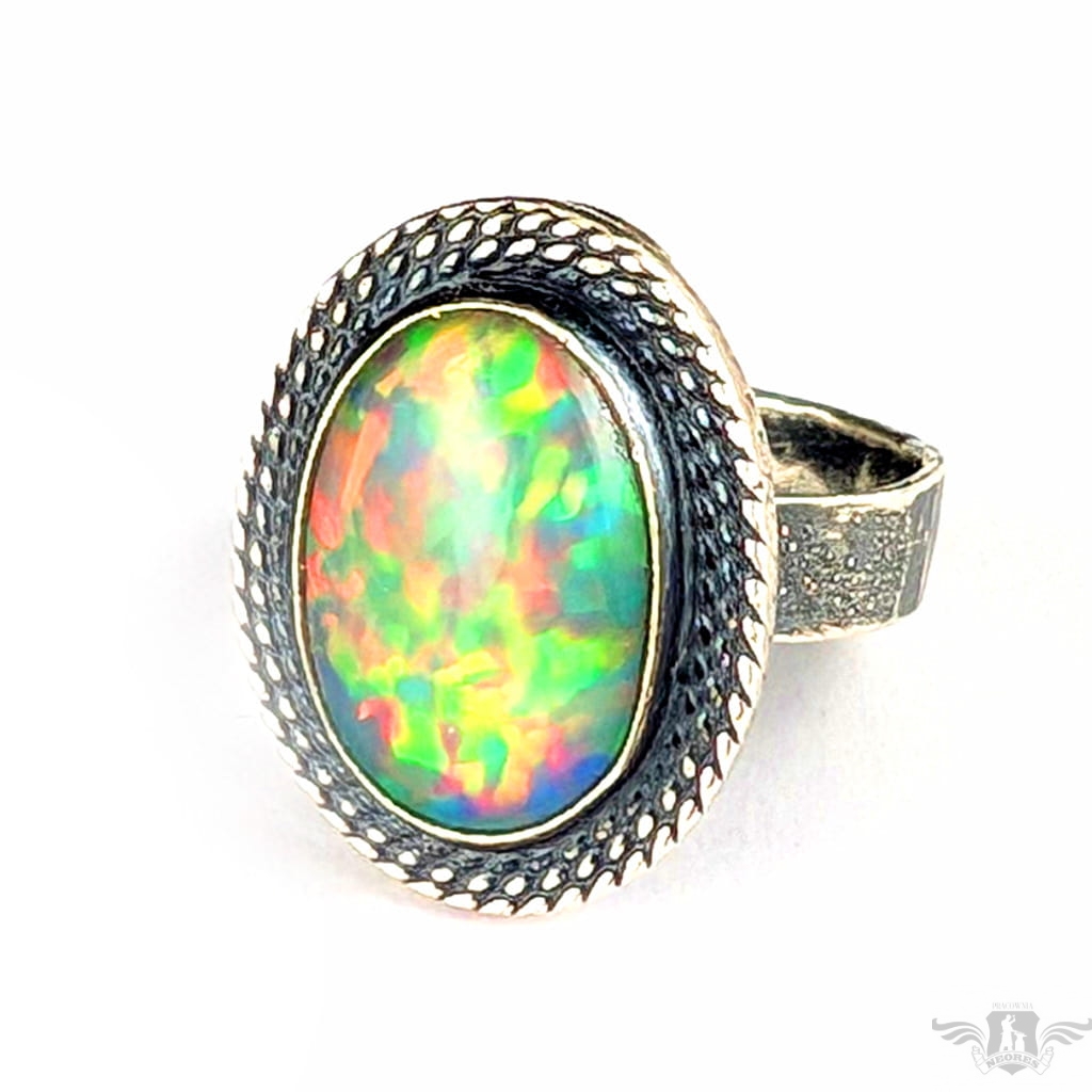 Okazały, barwny pierścionek z pięknym opalem szlachetnym o niezwykłej opalizacji. Obrączka zrobiona ze srebra pr. 925, ma 5 mm szerokości. Oksydowana, przecierana, młotkowana. Rozmiar jubilerski 16, mogę powiększyć do rozmiaru max. 18. Oprawa kamienia 23 x 17 mm. Waga pierścienia 7,6 grama. Pierścień zostanie zapakowany w ozdobne pudełeczko