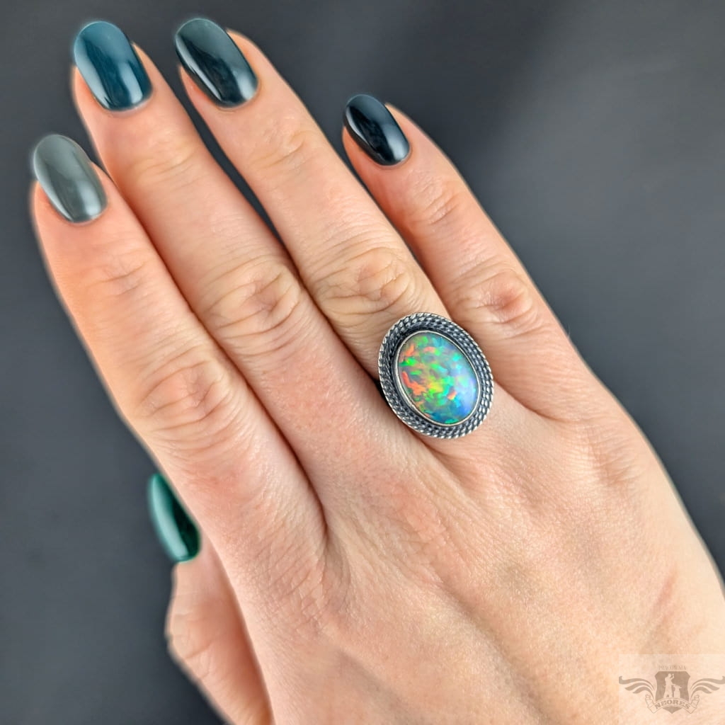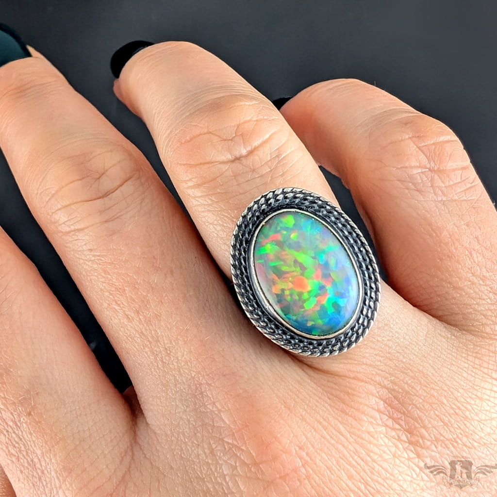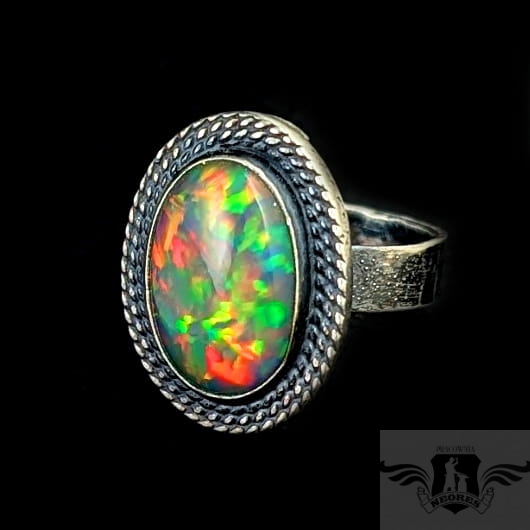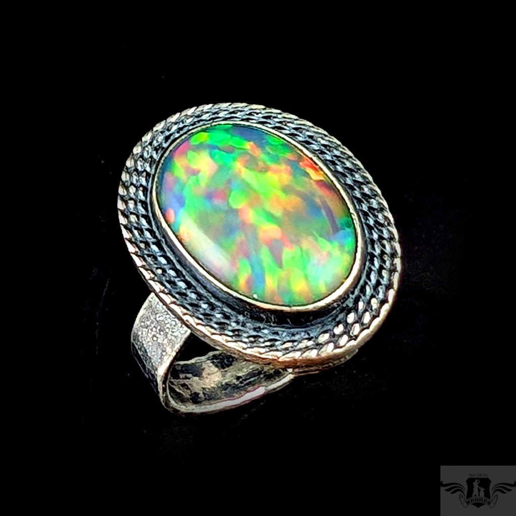 Okazały, barwny pierścionek z pięknym opalem szlachetnym o niezwykłej opalizacji. Obrączka zrobiona ze srebra pr. 925, ma 5 mm szerokości. Oksydowana, przecierana, młotkowana. Rozmiar jubilerski 16, mogę powiększyć do rozmiaru max. 18. Oprawa kamienia 23 x 17 mm. Waga pierścienia 7,6 grama. Pierścień zostanie zapakowany w ozdobne pudełeczko