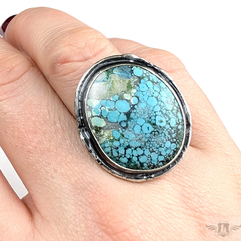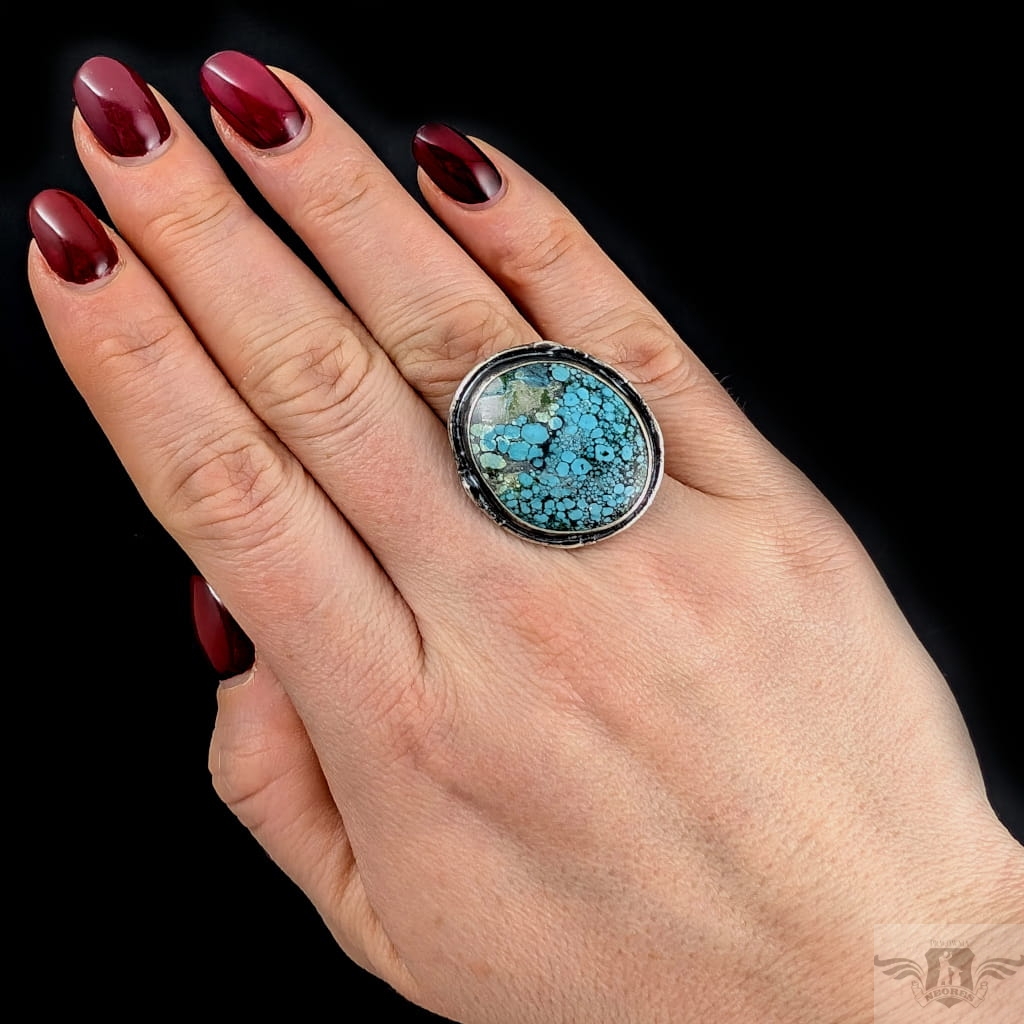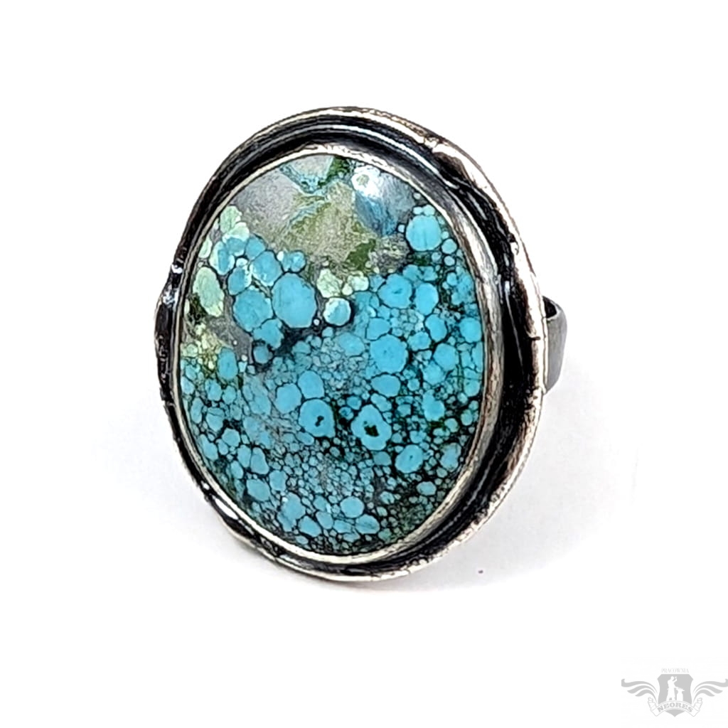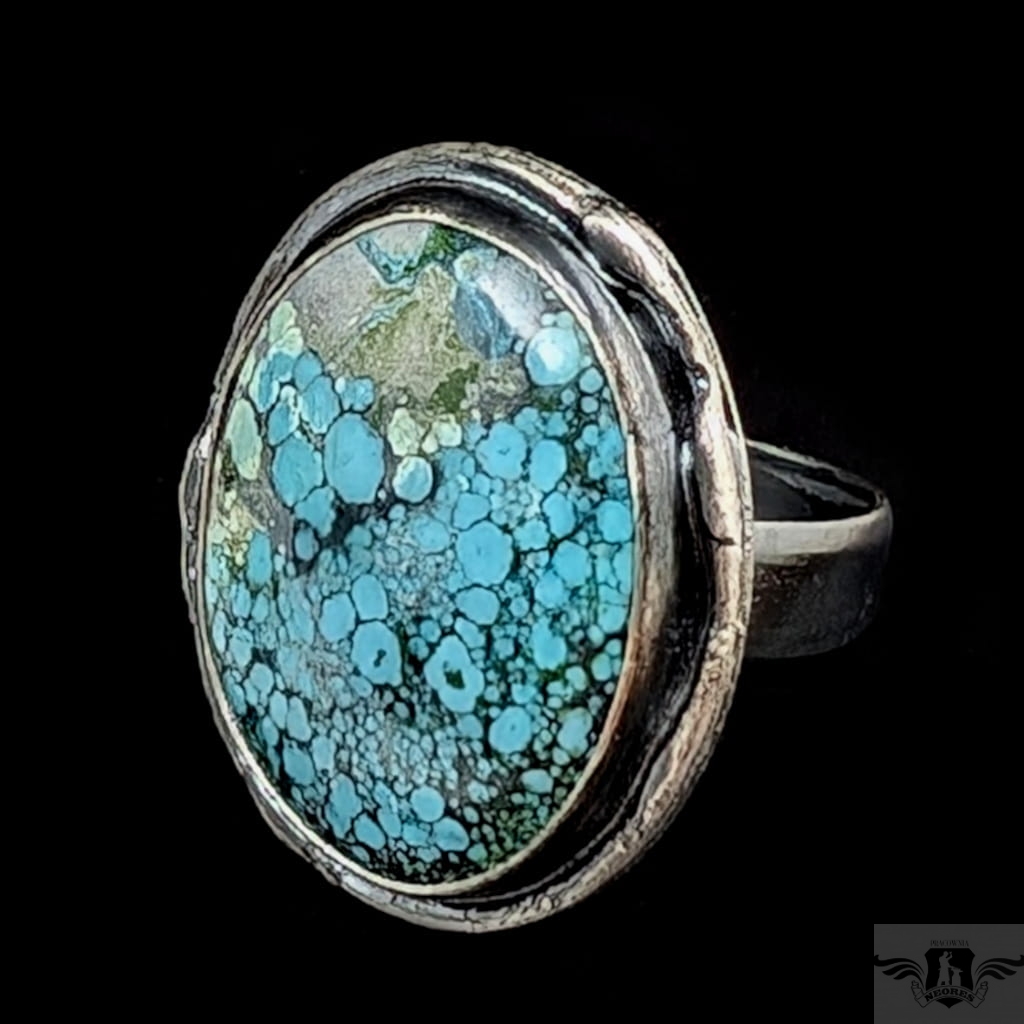 Pierścionek wykonany z oksydowanego srebra pr 925 oraz pięknego turkusu o zjawiskowej błękitnej barwie. Jest piękny Rozmiar obrączki regulowany, do dopasowania w szerokim zakresie, proszę napisać na jaki ustawić. Oprawa 28 x 25 mm. Waga 11,4 grama. Pierścień wyslany zostanie w ozdobnym pudełeczku