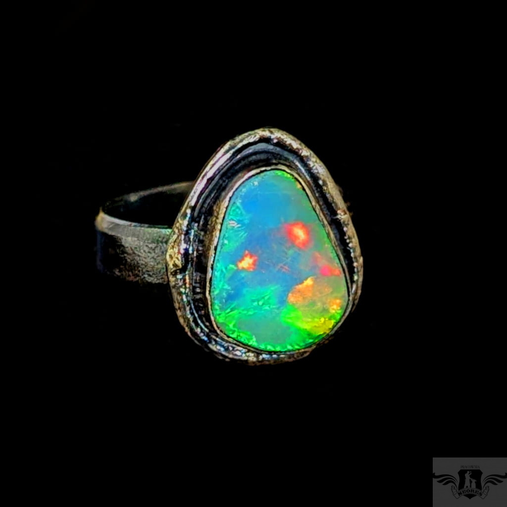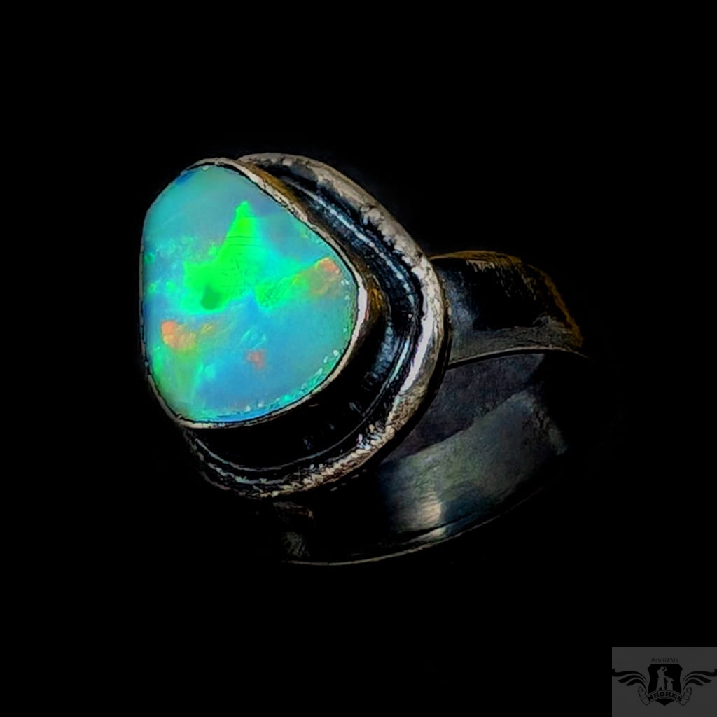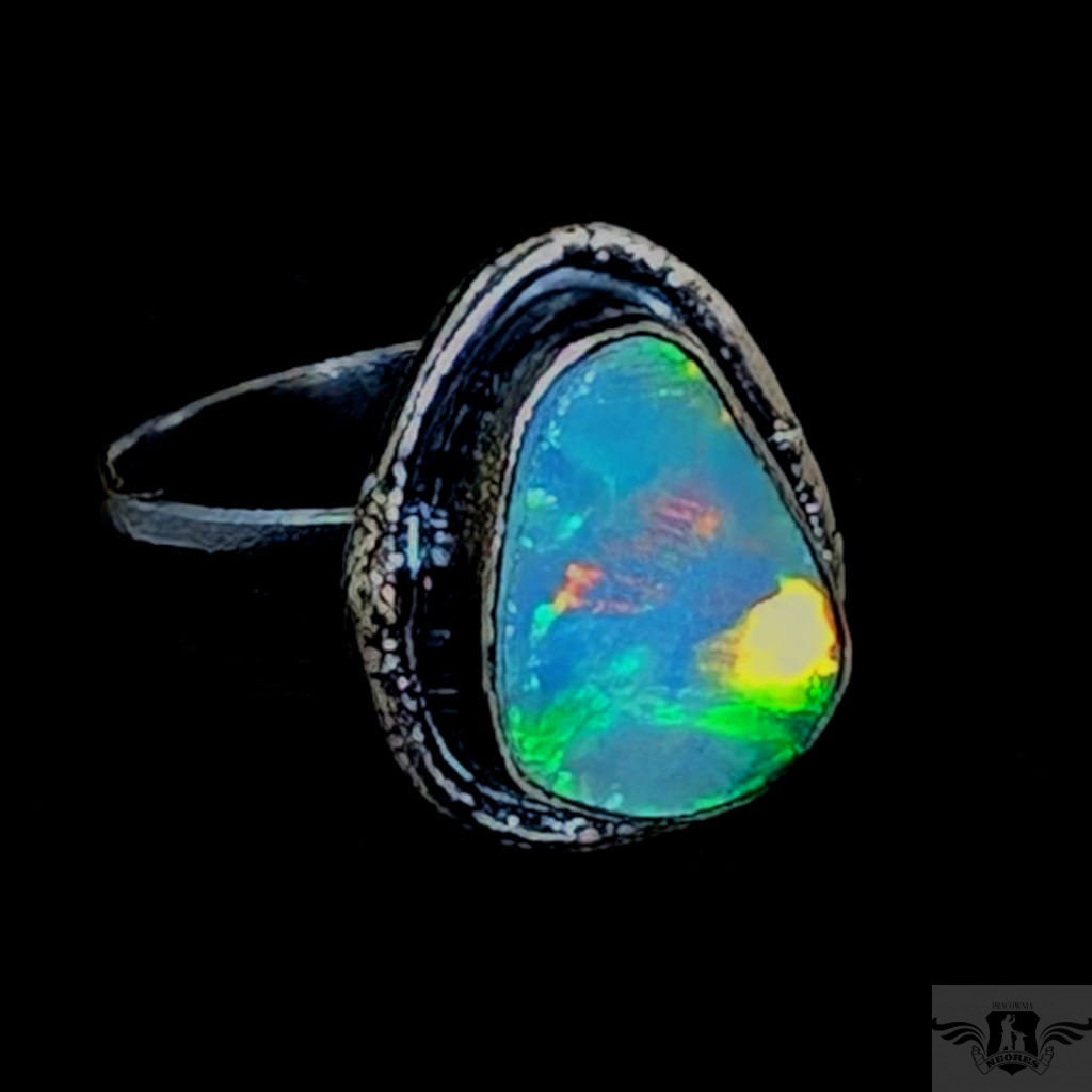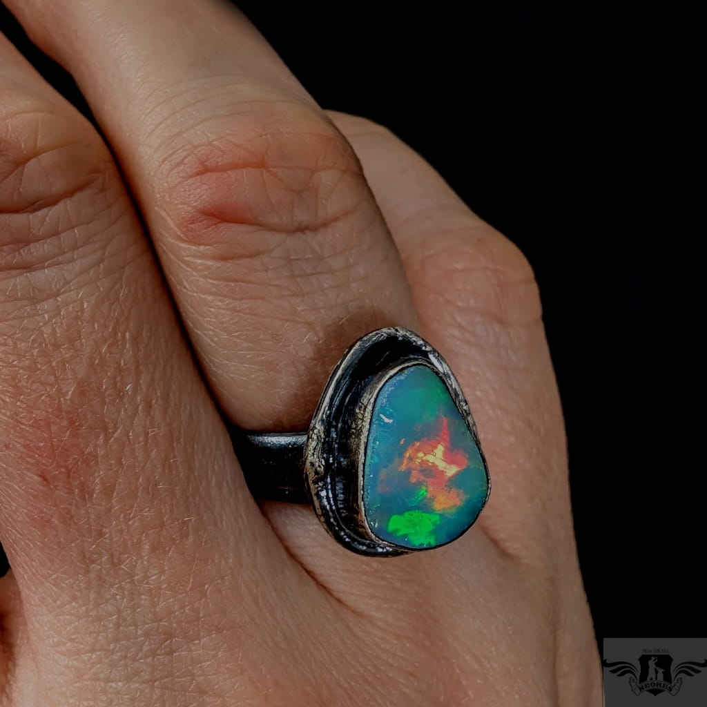 Piękny, surowy pierścień z oprawionym opalem etiopskim o niezwykle kolorowej tafli . Kamień o wspaniałej opalizacji barw, zjawiskowy. Piękno nie do oddania na zdjęciu. Srebro pr.925, oksydowane. Wymiary oprawy 17 x 14 mm. Waga 6,4 g. Obrączka regulowana w szerokim zakresie (9-26), proszę napisać po zakupie, to dopasuję na konkretny rozmiar. Obrączka ma 5 mm szerokości. Zapakowany w ozdobne pudełeczko.