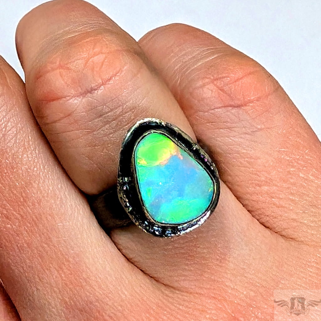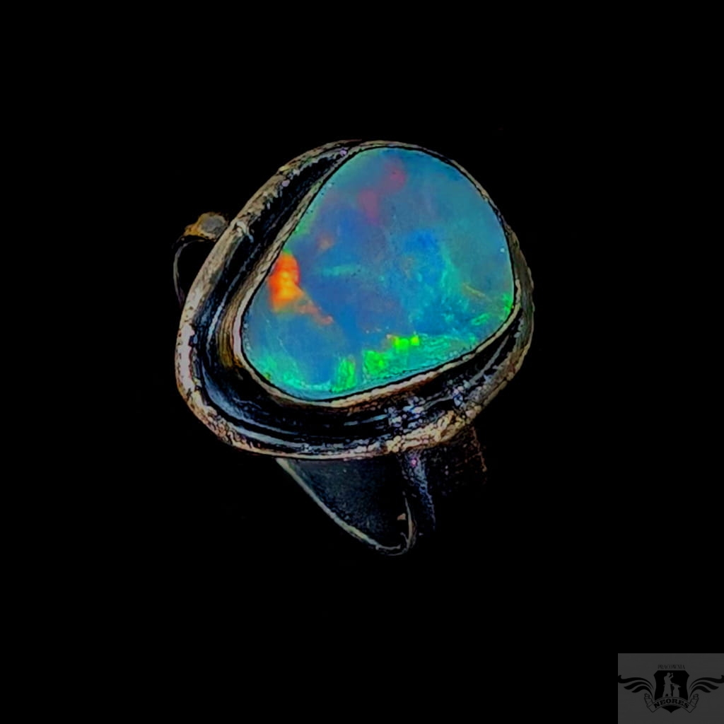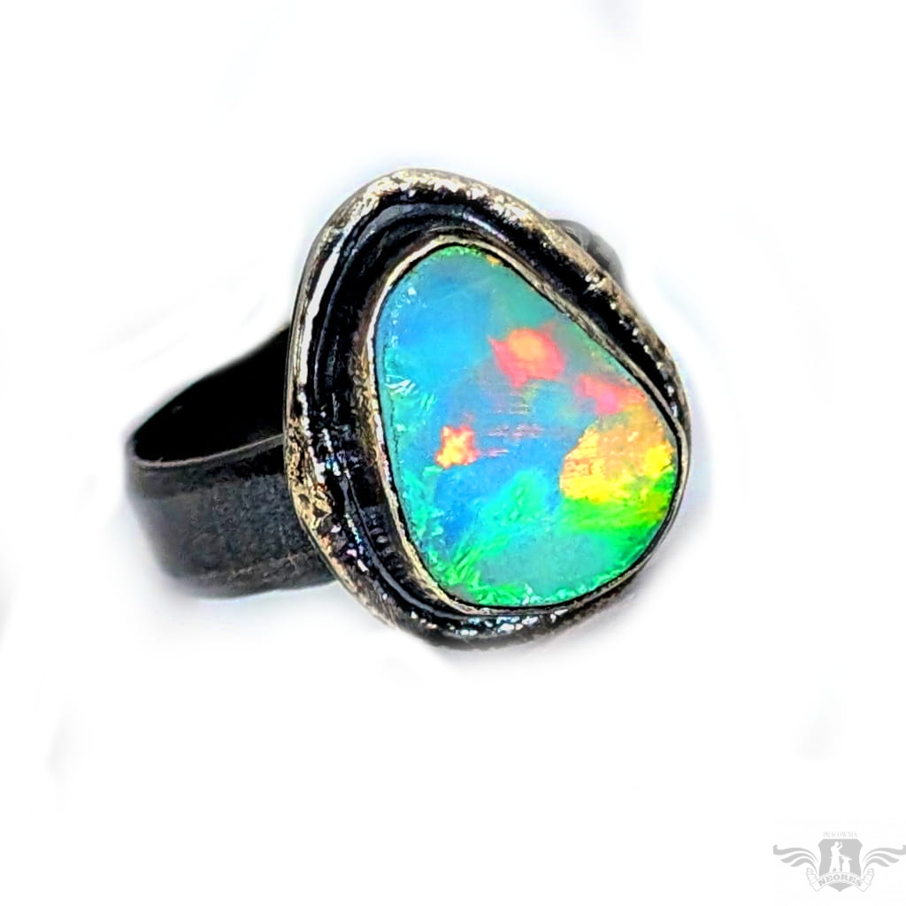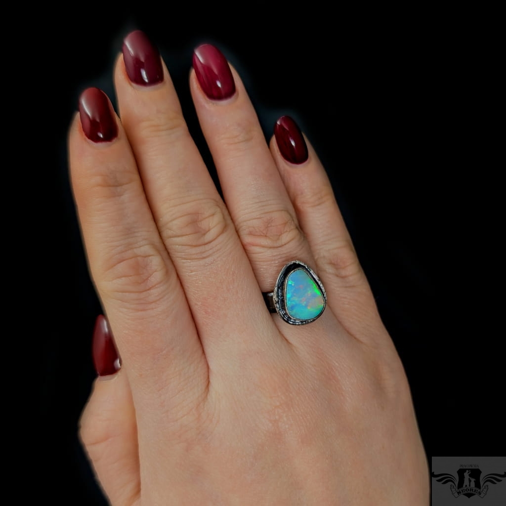 Piękny, surowy pierścień z oprawionym opalem etiopskim o niezwykle kolorowej tafli . Kamień o wspaniałej opalizacji barw, zjawiskowy. Piękno nie do oddania na zdjęciu. Srebro pr.925, oksydowane. Wymiary oprawy 17 x 14 mm. Waga 6,4 g. Obrączka regulowana w szerokim zakresie (9-26), proszę napisać po zakupie, to dopasuję na konkretny rozmiar. Obrączka ma 5 mm szerokości. Zapakowany w ozdobne pudełeczko.