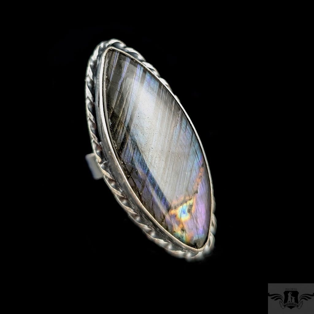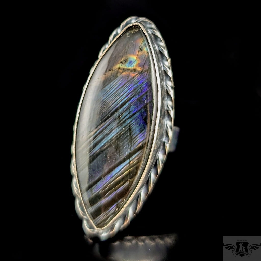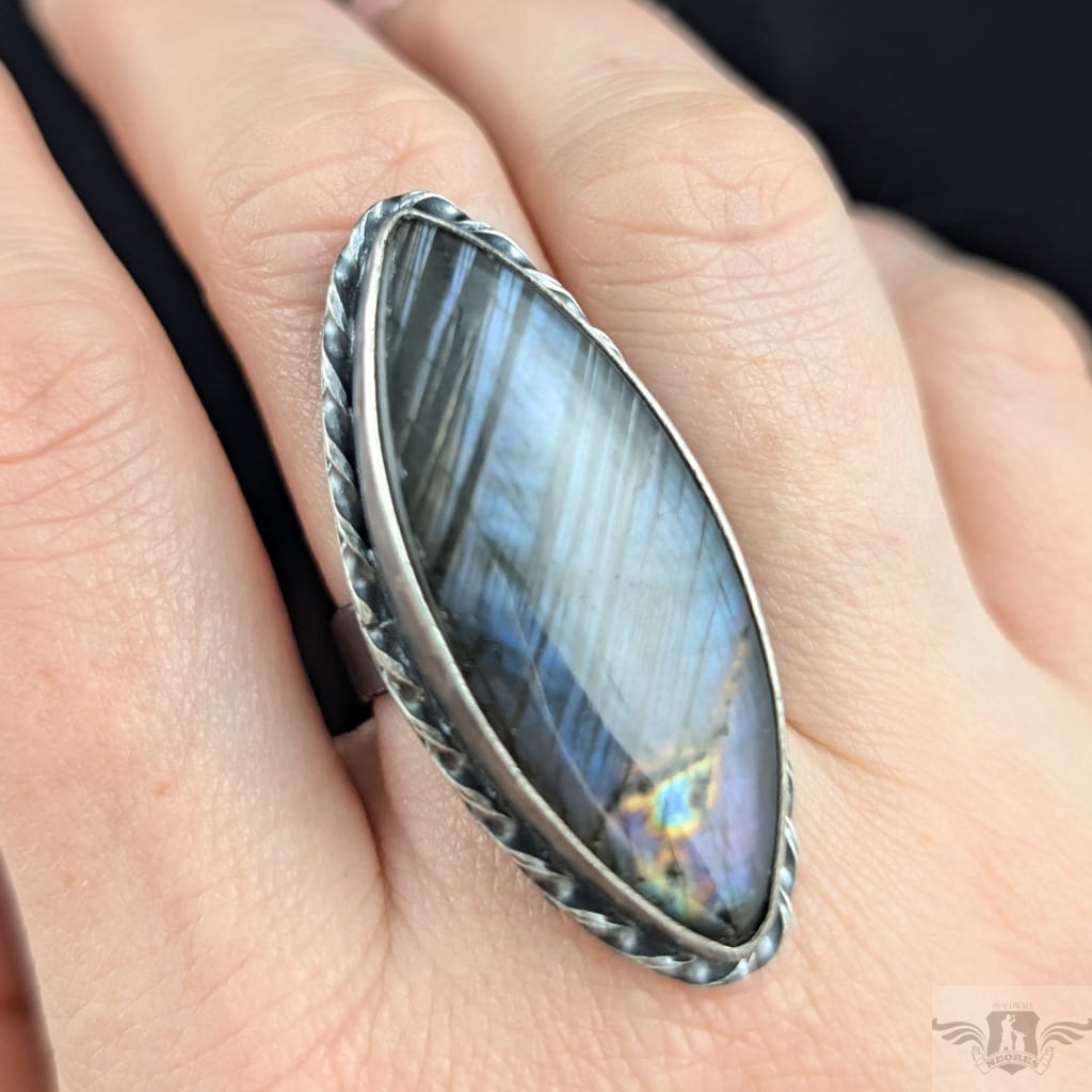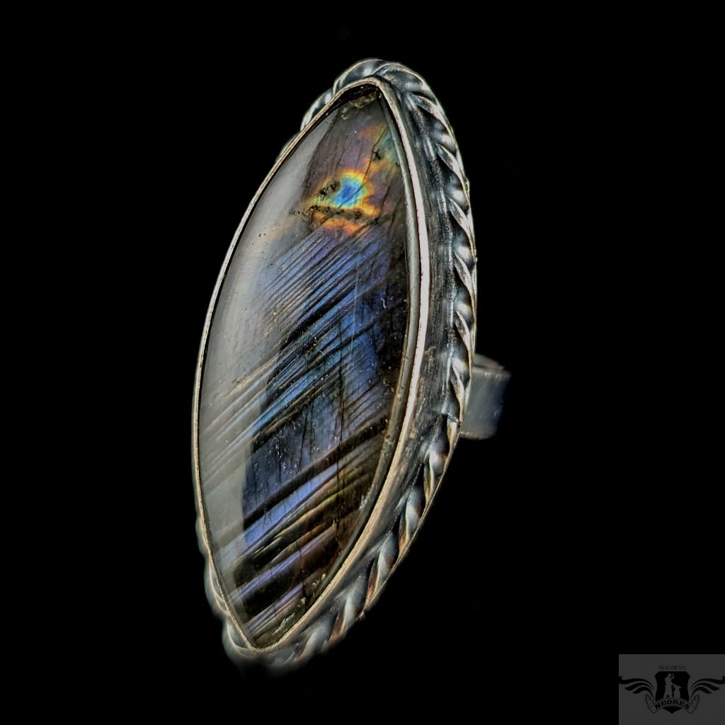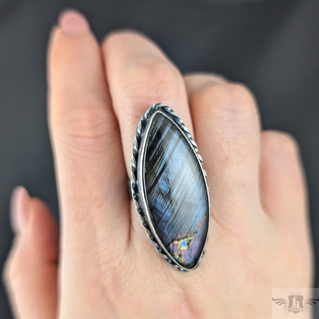 Pierścionek wykonany z oksydowanego srebra próby 925 oraz naturalnego labradorytu. Oprawa w stylu retro, oksydowana. Wymiary oprawy 42 x 20 mm. Rozmiar jubilerski 16, mogę powiększyć do max 20, obrączka ma 4 mm szerokości. Waga 17 g. Pierścionek zostanie zapakowany w ozdobne pudełeczko.
