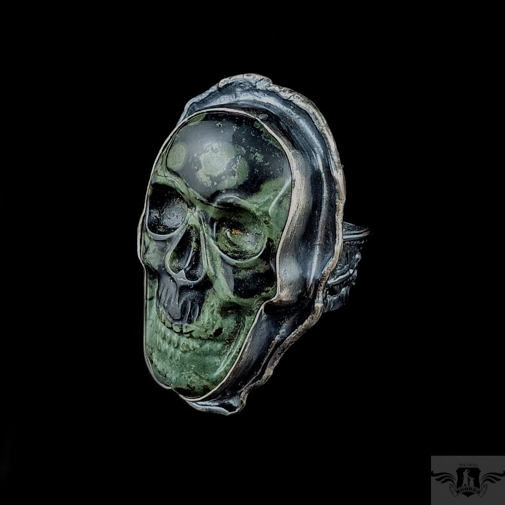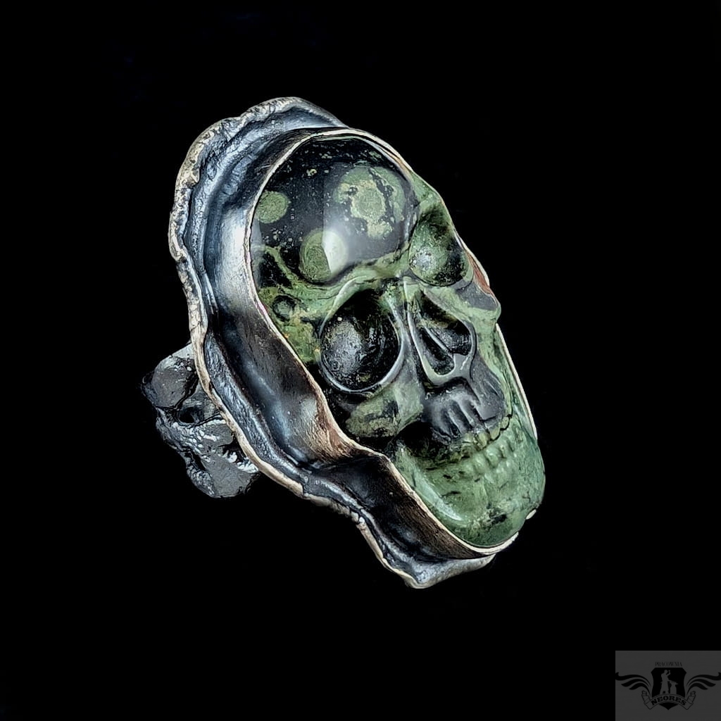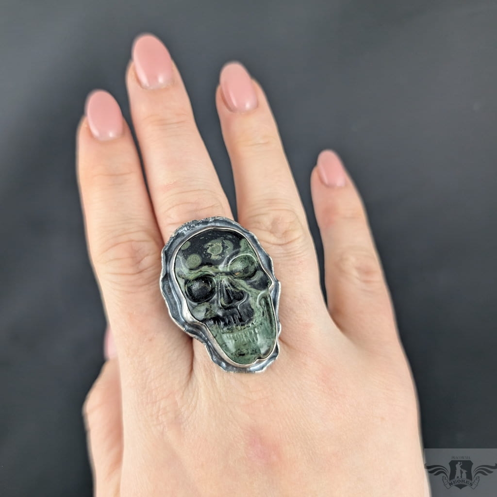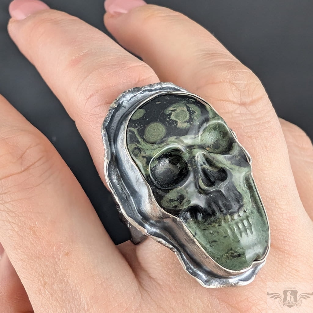 Oryginalny pierścień wykonany z oksydowanego srebra próby 925 z wkomponowanym wyjątkowym jaspisem kambaba o ciekawym kształcie wyrzeźbionej czaszki. Wymiary 42 x 28 mm, rozmiar jubilerski 17, mogę powiększyć do max 18. Waga 23 gramy. Zapakowany w ozdobne pudełeczko.