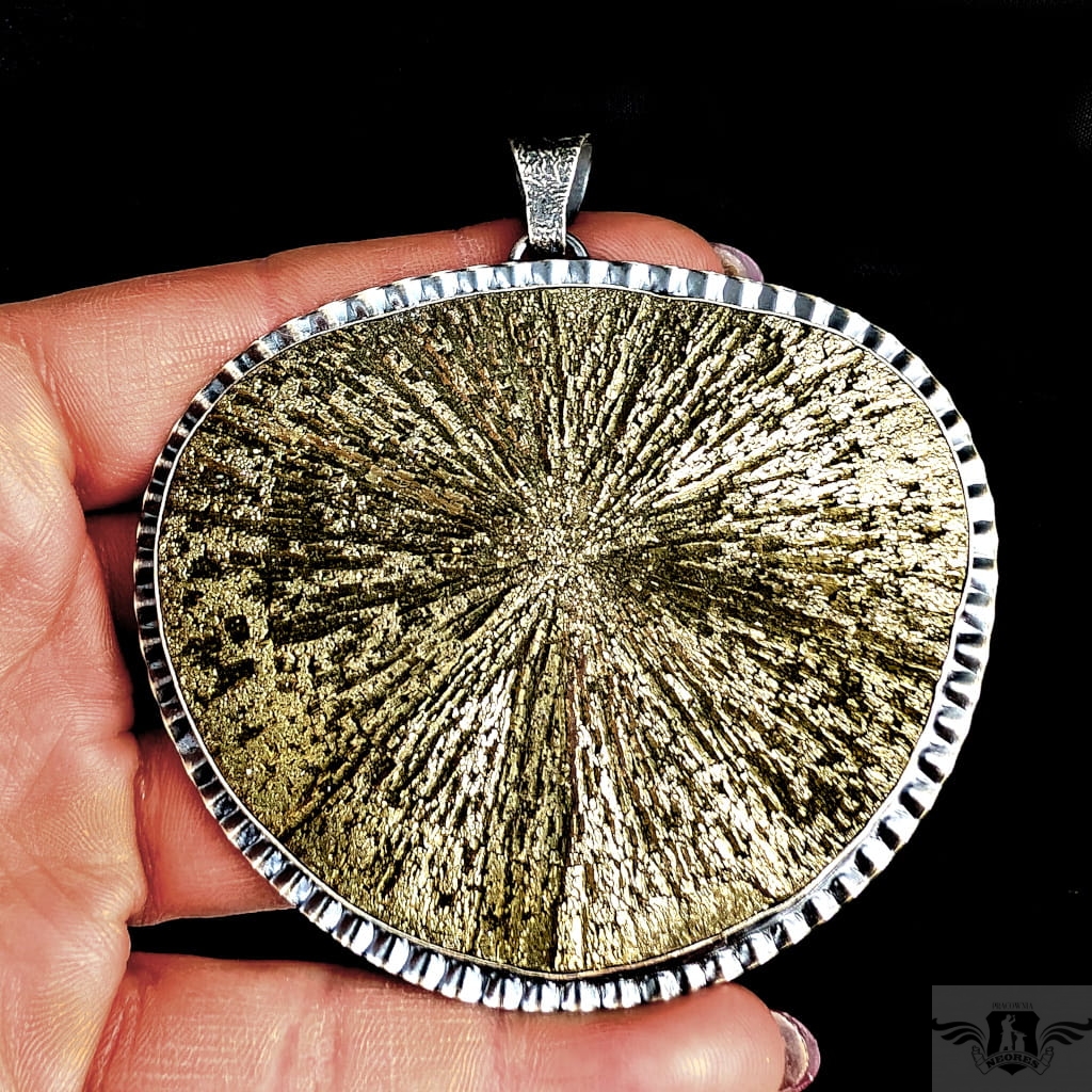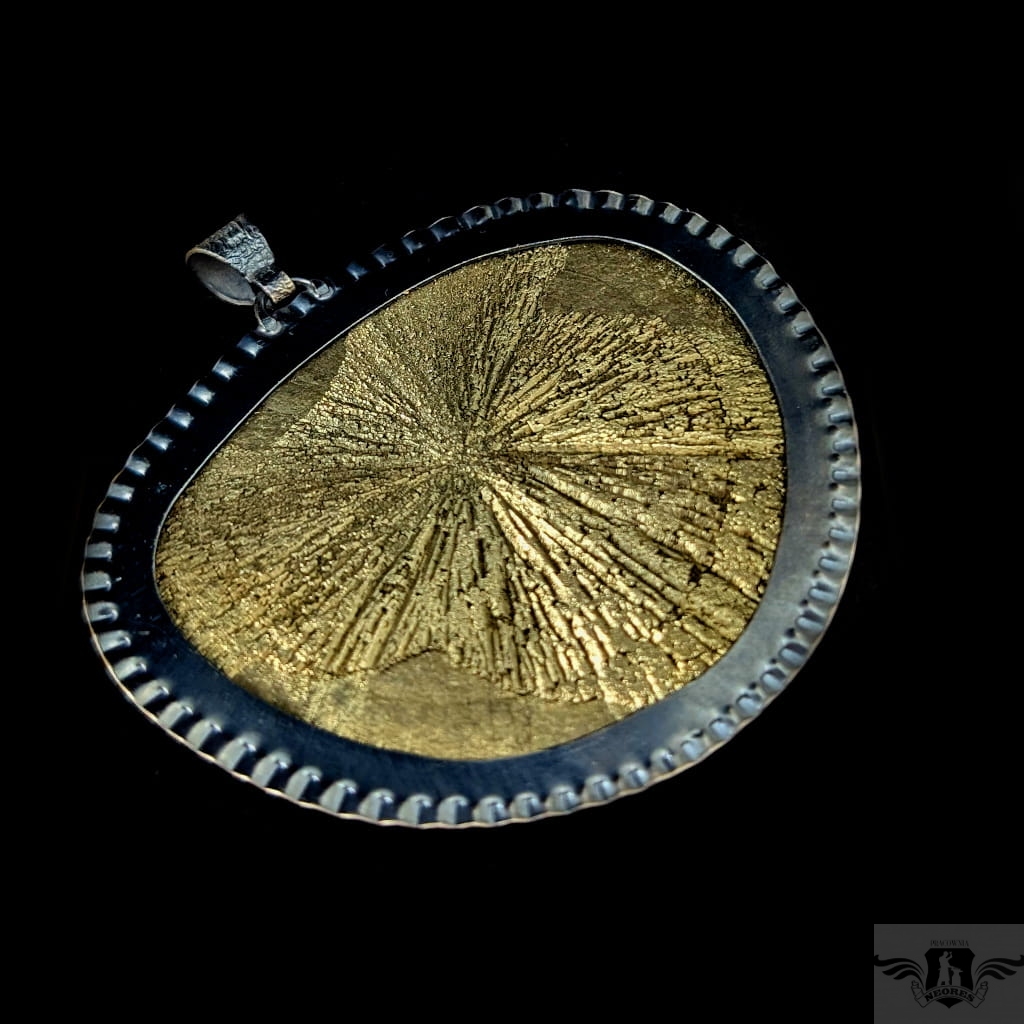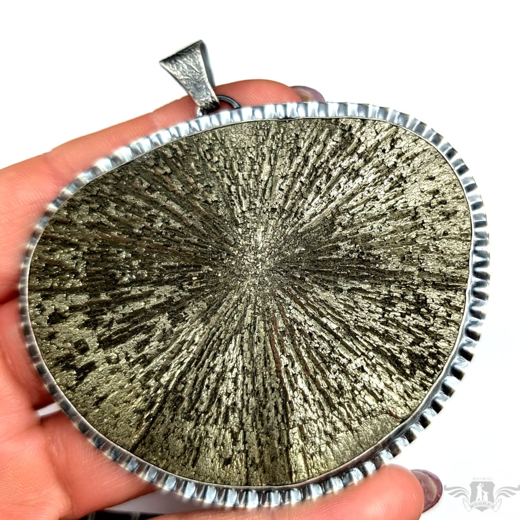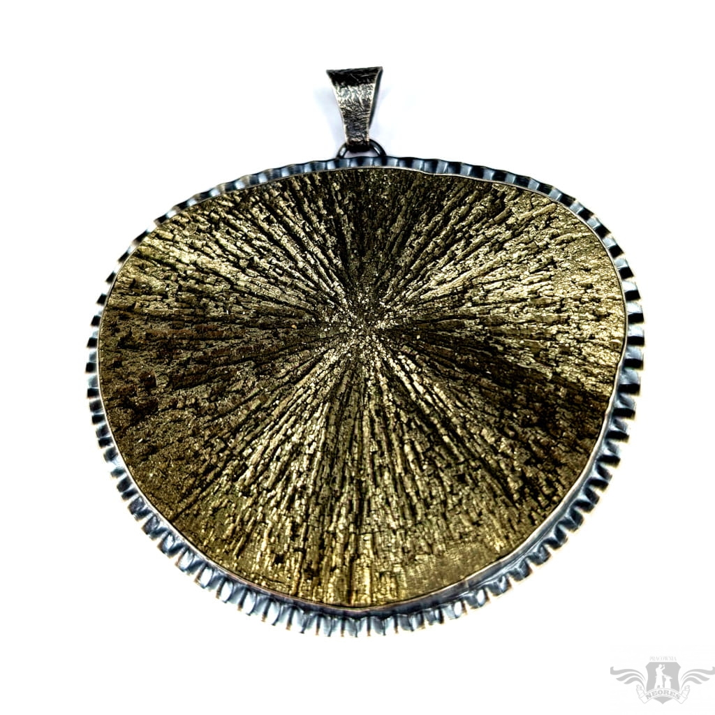 Zjawiskowy wisior z niezwykłym pirytowym słońcem o złotych i zielonkawych refleksach. Okaz jedynie "złapany" w srebrną ramę, która przytrzymuje masywny minerał, nie ujmując jego niepowtarzalnego uroku. Srebro oksydowane. Słońce pirytu to bardzo ceniona w jubilerstwie, iskrząca odmiana słynnego pirytu z USA. Tylko w tym jednym miejscu na Ziemi, w pokładach węgla, piryt tworzy prawdziwe "słońca", zwane również dolarami kopalnianymi. Indianie używali ich do pierwszych wymian handlowych. Lokalizacja: USA - Illinois. Wymiary 75 x 65 mm . Waga 80 gramów. Zdjęcia nie oddają pięknych odcieni słońca. Tył otwarty. Wisior zostanie zapakowany w ozdobne pudełeczko.