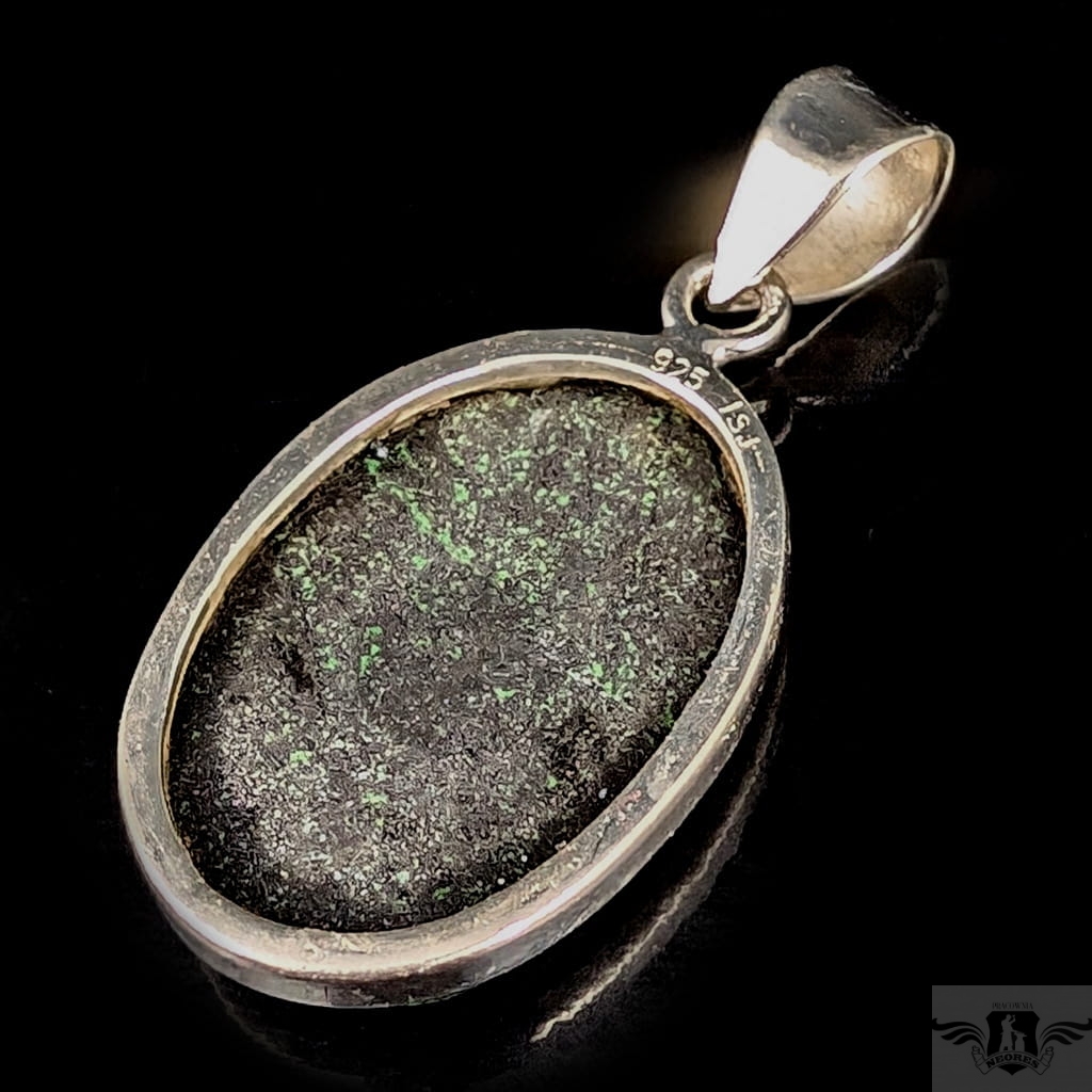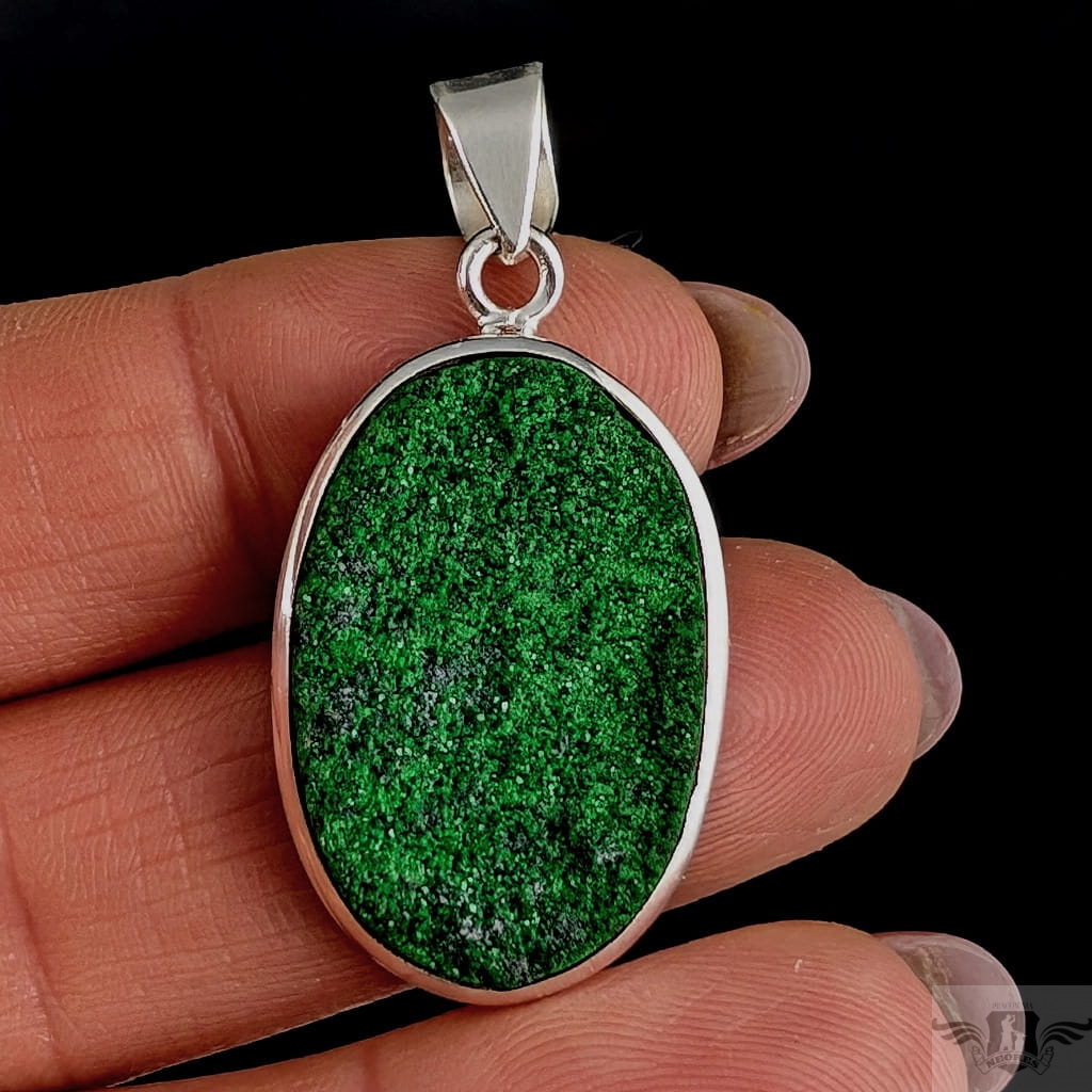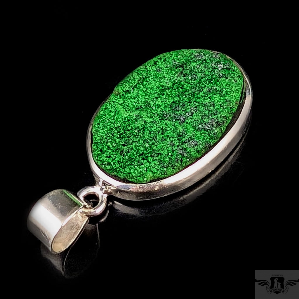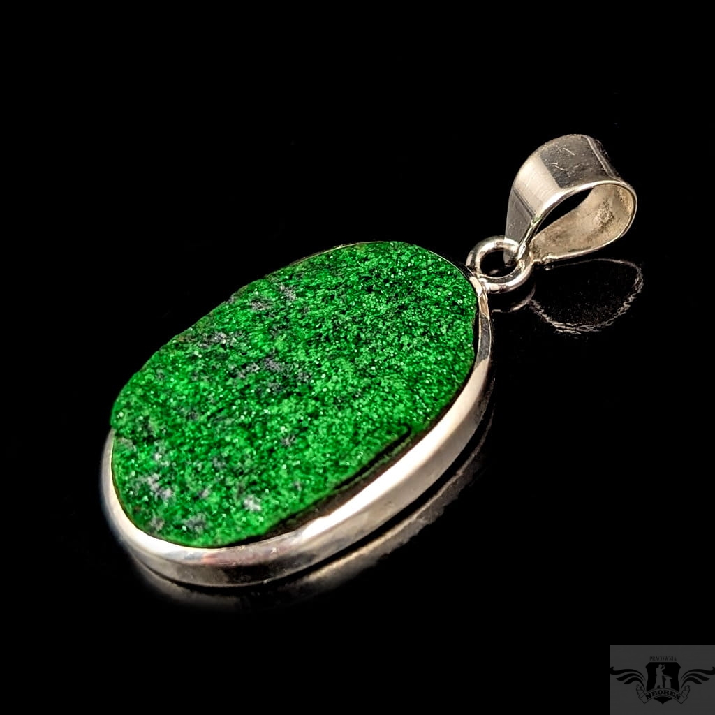 Uwarowit- unikalny i piękny, bardzo rzadko spotykany minerał, barwy szmaragdowozielonej, trawiasto- lub ciemnozielonej. Wspaniała krystaliczna struktura. Uwarowit jest zielonym granatem o zjawiskowej krystalizacji, gratką dla kolekcjonerów ze względu na coraz trudniejsze pozyskanie. Minerał oprawiony w srebro próby 925. Wymiary oprawy wisiora 27 x 20 mm, długość wraz z krawatką 40 mm. Waga wisiora 7,4 g. Wykonany przez dostawcę kamieni.