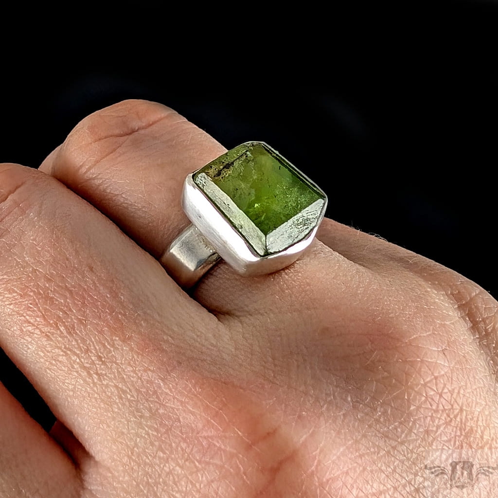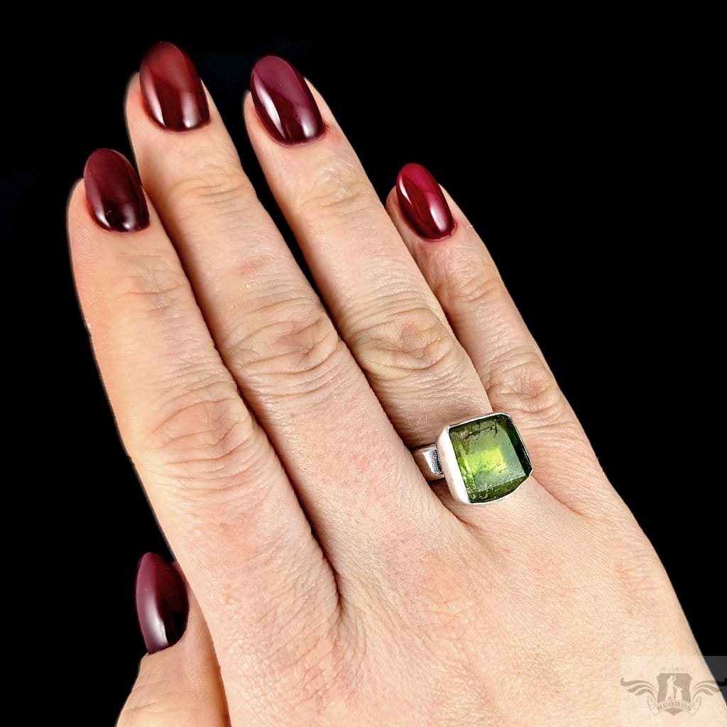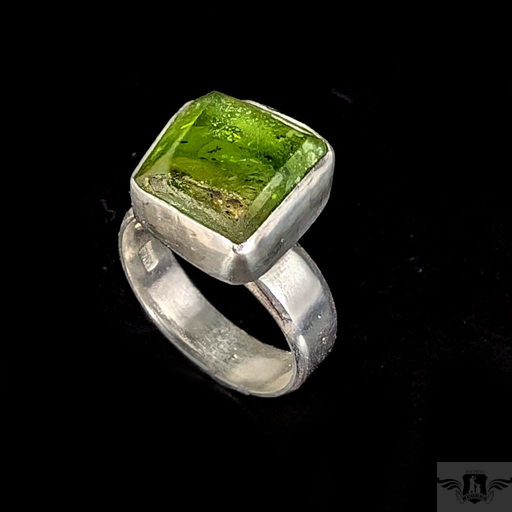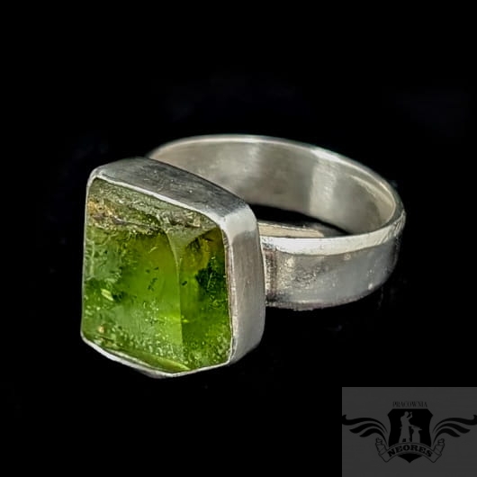 Pierścień wykonany ze srebra próby 925 z oprawionym pięknym peridotem- szlachetną odianą oliwinu w soczystej, żywej zieleni z gładko oszlifowaną taflą w formie kryształowej bryły. Przepiękny okaz. Obrączka ma szerokość 5 mm. Wymiary oprawy 14 x 13 mm. Pierścionek w rozmiarze regulowanym w szerokim zakresie, po zakupie proszę napisać na jaki dopasować. Waga pierścienia 7 g.