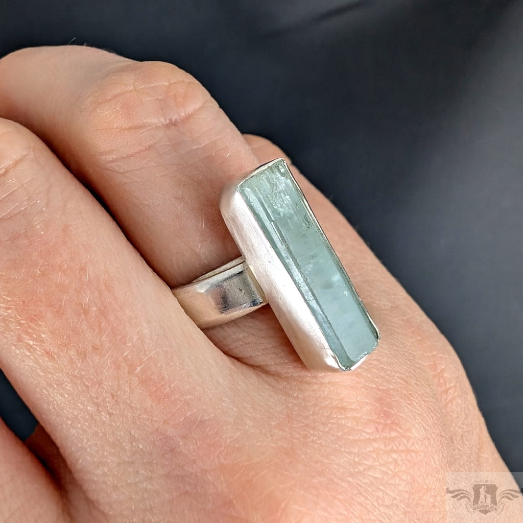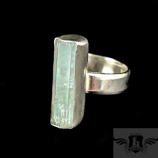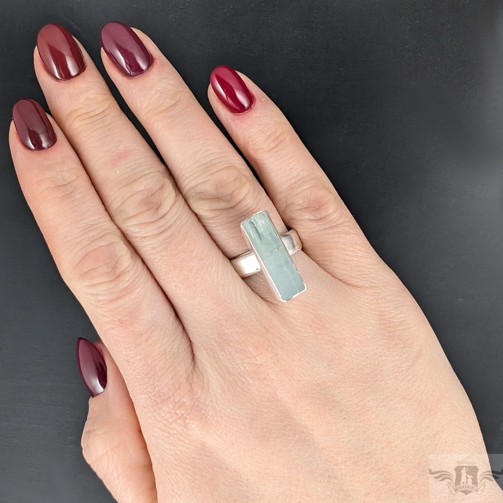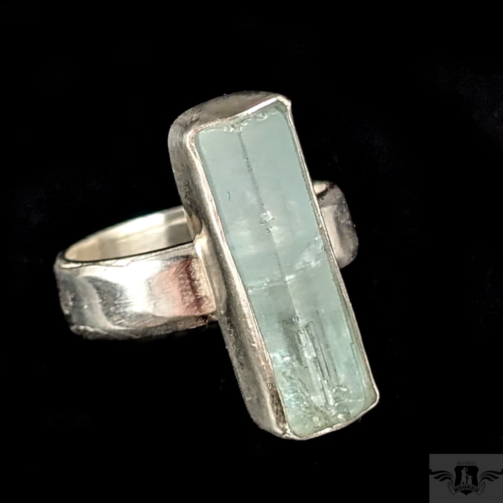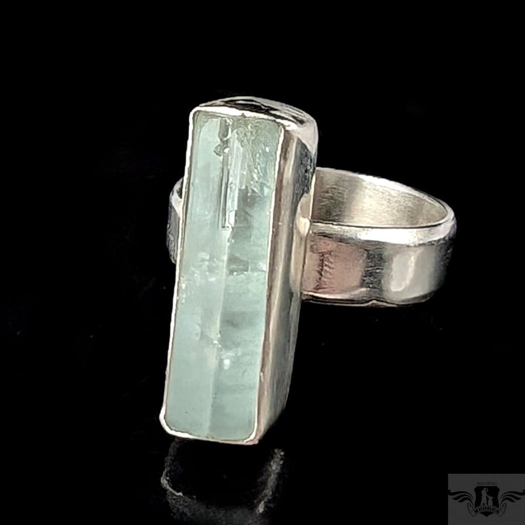 Pierścionek z oprawionym ręcznie w srebro pr.925 przepięknym, świetlistym akwamarynem. Oprawa 22 x 7 mm, rozmiar jubilerski jest regulowany, dzięki obrączce, którą można dopasować w szerokim zakresie 9-24. Proszę napisać na jaki rozmiar dopasować. Obrączka o szerokości 5 mm. Waga 6,8 grama. Pierścień zostanie zapakowany w ozdobne pudełeczko.