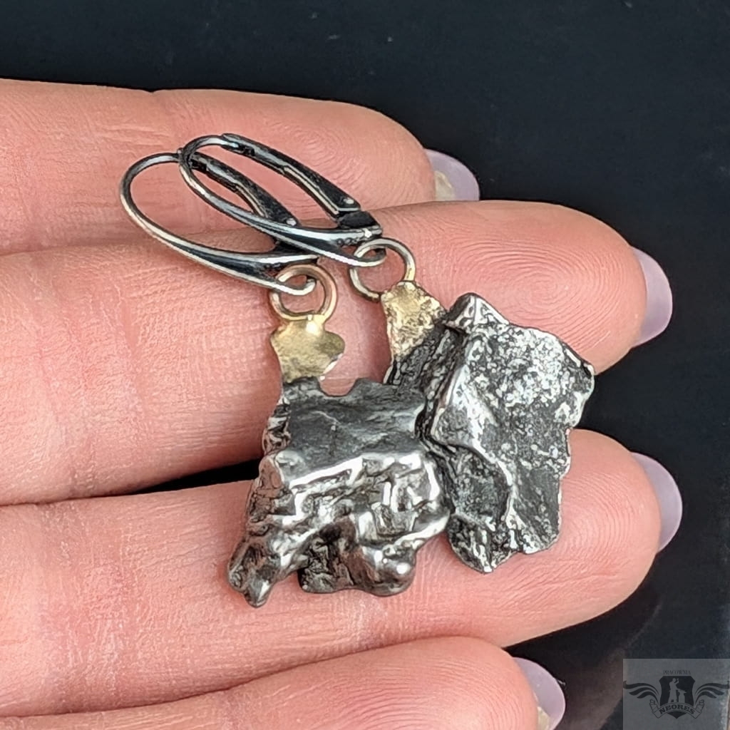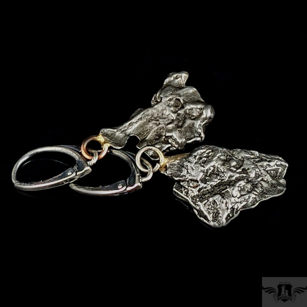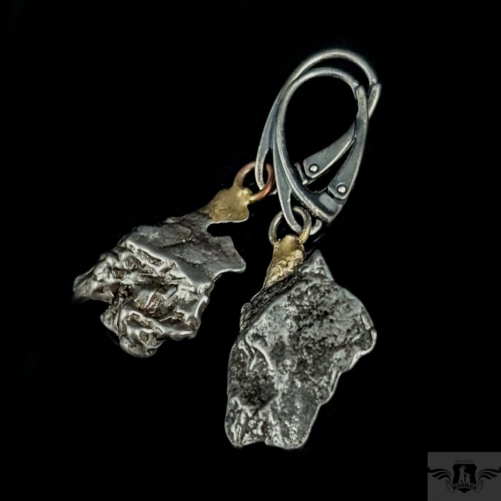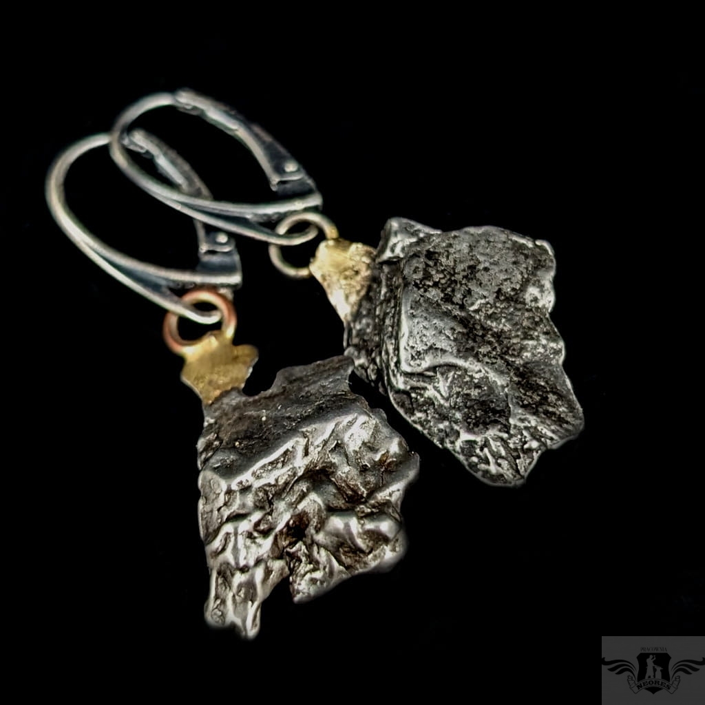 Kosmiczne kolczyki z meteorytami Campo Del Cielo (Argentyna) o kształcie nieregularnych bryłek na biglach angielskich z oksydowanego srebra próby 925. Wymiary elementów 22 x 16 mm. Długość z biglami angielskimi 40 mm. Lekkie, komfortowe i bardzo efektowne. Waga jednego kolczyka 4,9 grama. Kolczyki zostaną wysłane w ozdobnym pudełeczku.