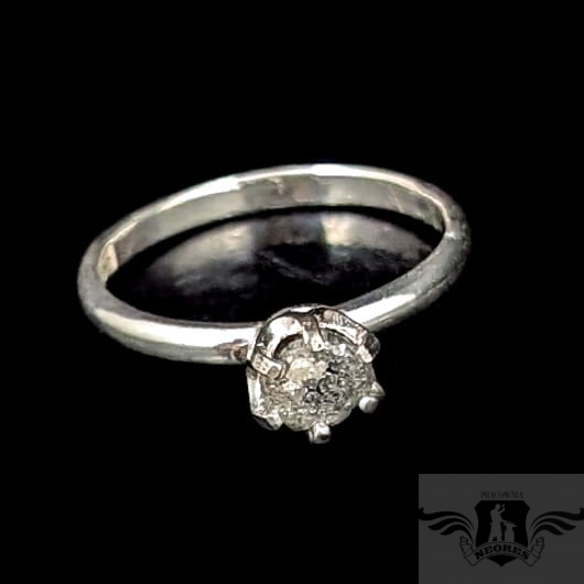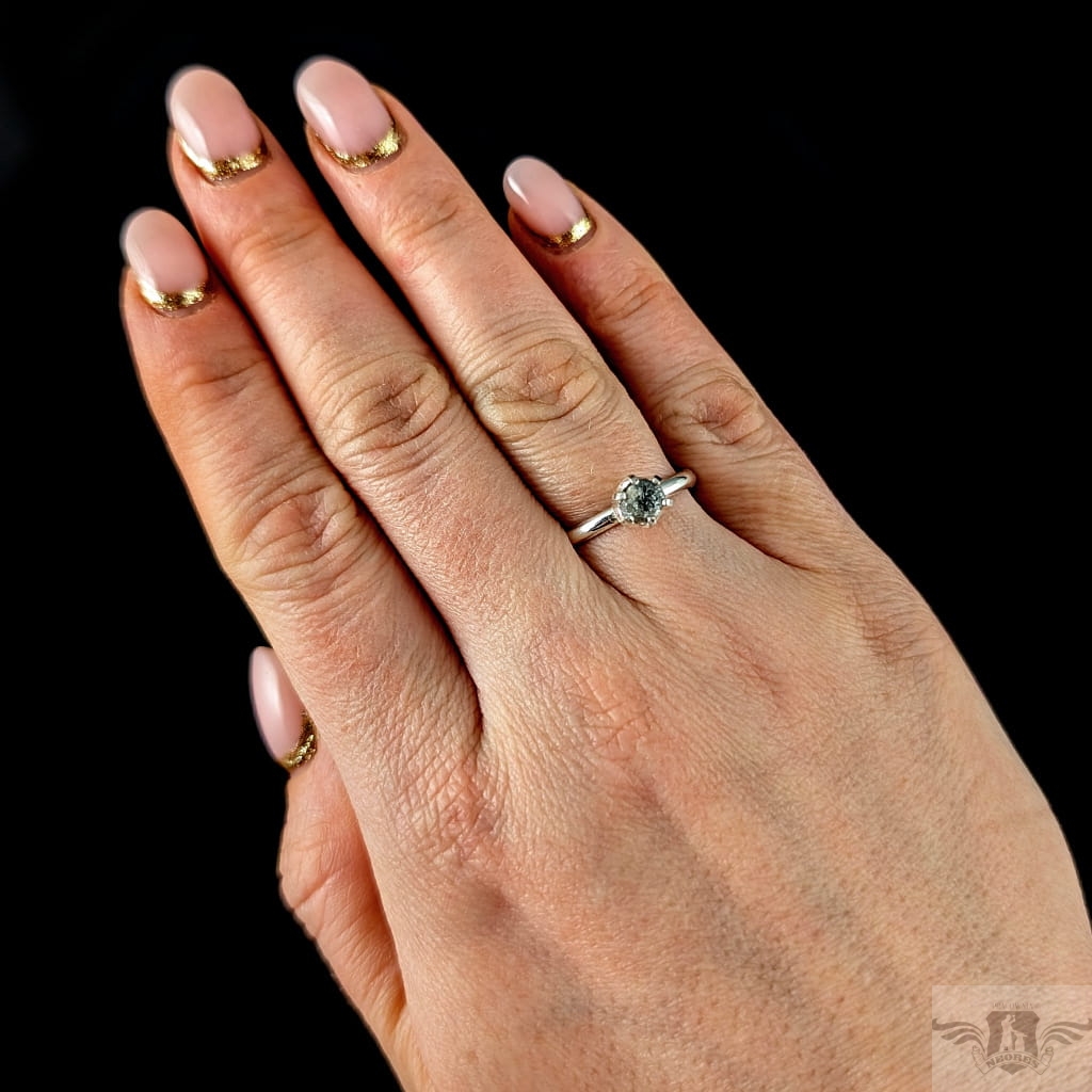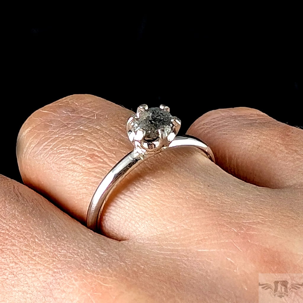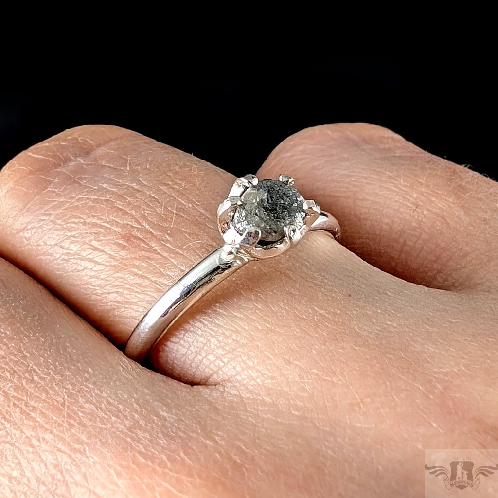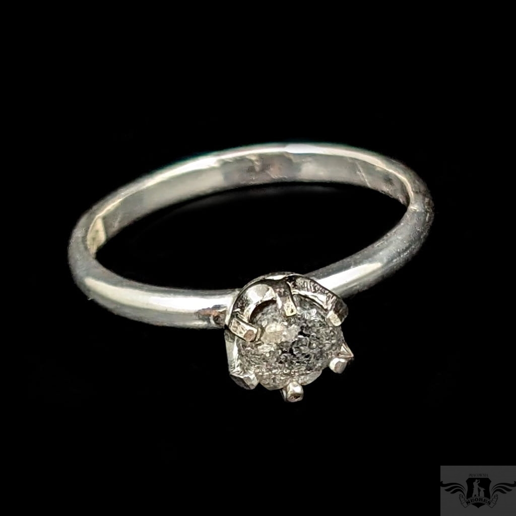 Piękny i oryginalny pierścionek z osadzonym w srebro próby 925 naturalnym, surowym diamentem. Oprawa kamienia ma średnicę 6 mm. Srebrna, klasyczna obrączka ma szerokość 2 mm, rozmiar jubilerski 17. Waga 2,33 g. Możliwe zamówienie podobnego pierścionka w innym rozmiarze. Wysłany w ozdobnym pudełeczku.