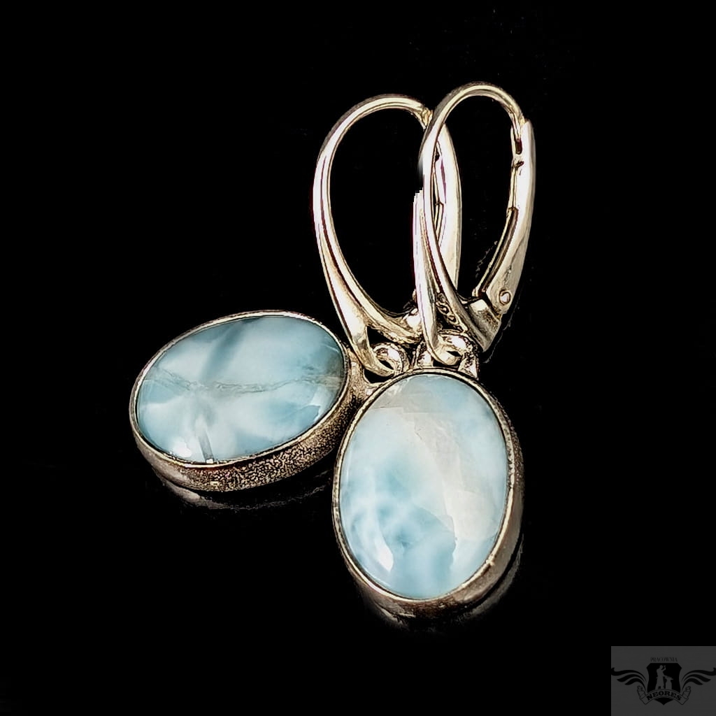 Kolczyki z pięknymi larimarami oprawionymi w srebro próby 925. Wymiary całej oprawy 15 x 11 mm. Długość z biglami 32 mm. Waga jednego 3,4 g. Zostaną zapakowane w ozdobne pudełeczko.