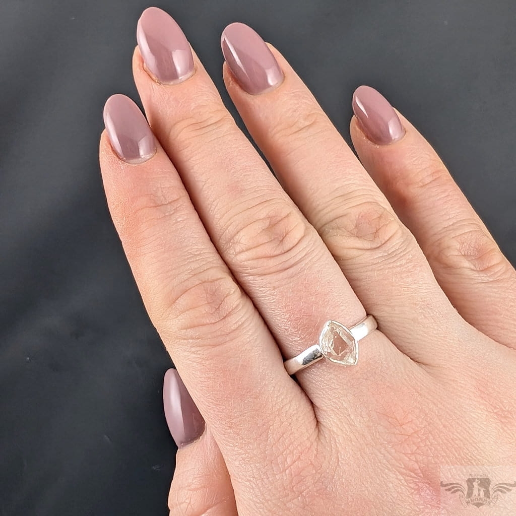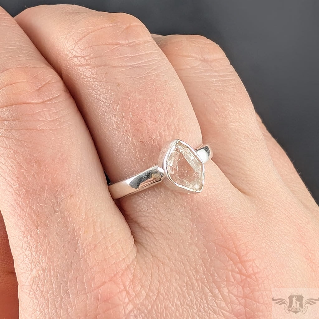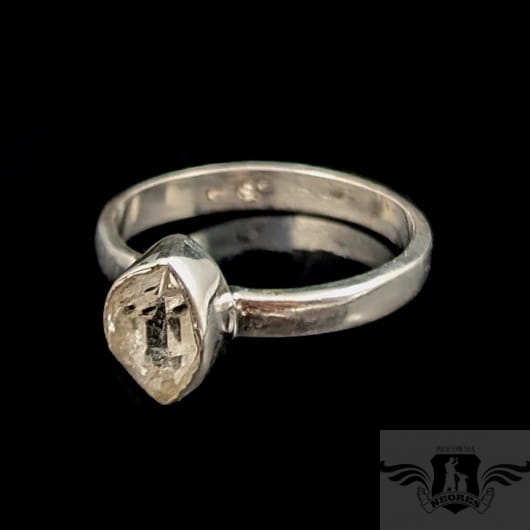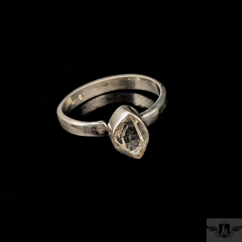 Subtelny pierścionek z oprawionym w srebro próby 925 kryształem kwarcu zwanym herkimerem- niezwykle czysta odmiana nazywana też diamentem z Herkimer (od nazwy miejsca występowania, okręg Herkimer w stanie Nowy Jork). Wymiary oprawy kamienia 9 x 7 mm, rozmiar jubilerski regulowany w zakresie 19-21. Waga 3 g. Kobiecy i awangardowy. Wykonany przez dostawcę kamieni. Pierścionek zostanie zapakowany w eleganckie pudełeczko