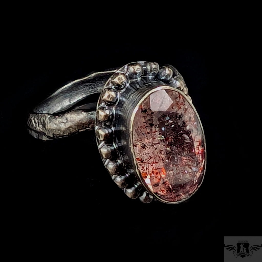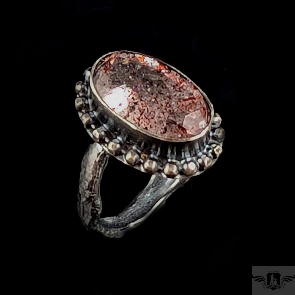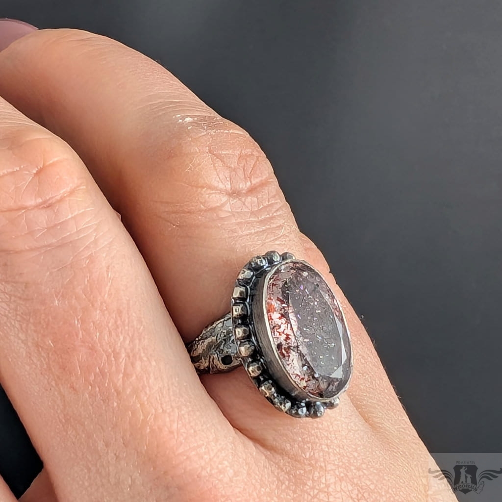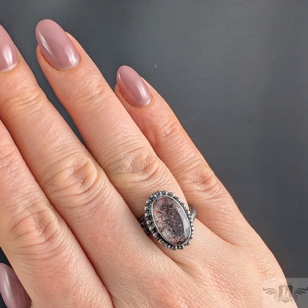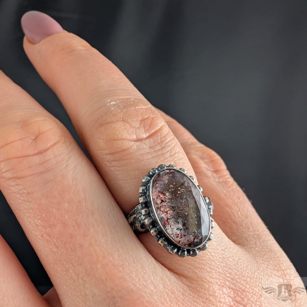 Pierścień wykonany z oksydowanego srebra próby 925. Srebrną gałązkę zdobi wyjątkowy okaz Super Seven- zjawiskowa kombinacja 7 minerałów zaklętych w pięknym szlifie na calej powierzchni (m.in.lepidokrocyt, kwarc dymny,ametyst, rutyl, kryształ górski). Kamień ma oprawę 17 x 11 mm. Pierścionek w rozmiarze jubilerskim regulowanym w zakresie 10-22 dopasuję po zakupie. waga 7 gramów. Zostanie wysłany w ozdobne pudełeczko.