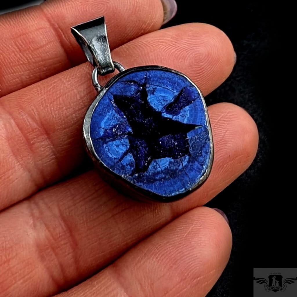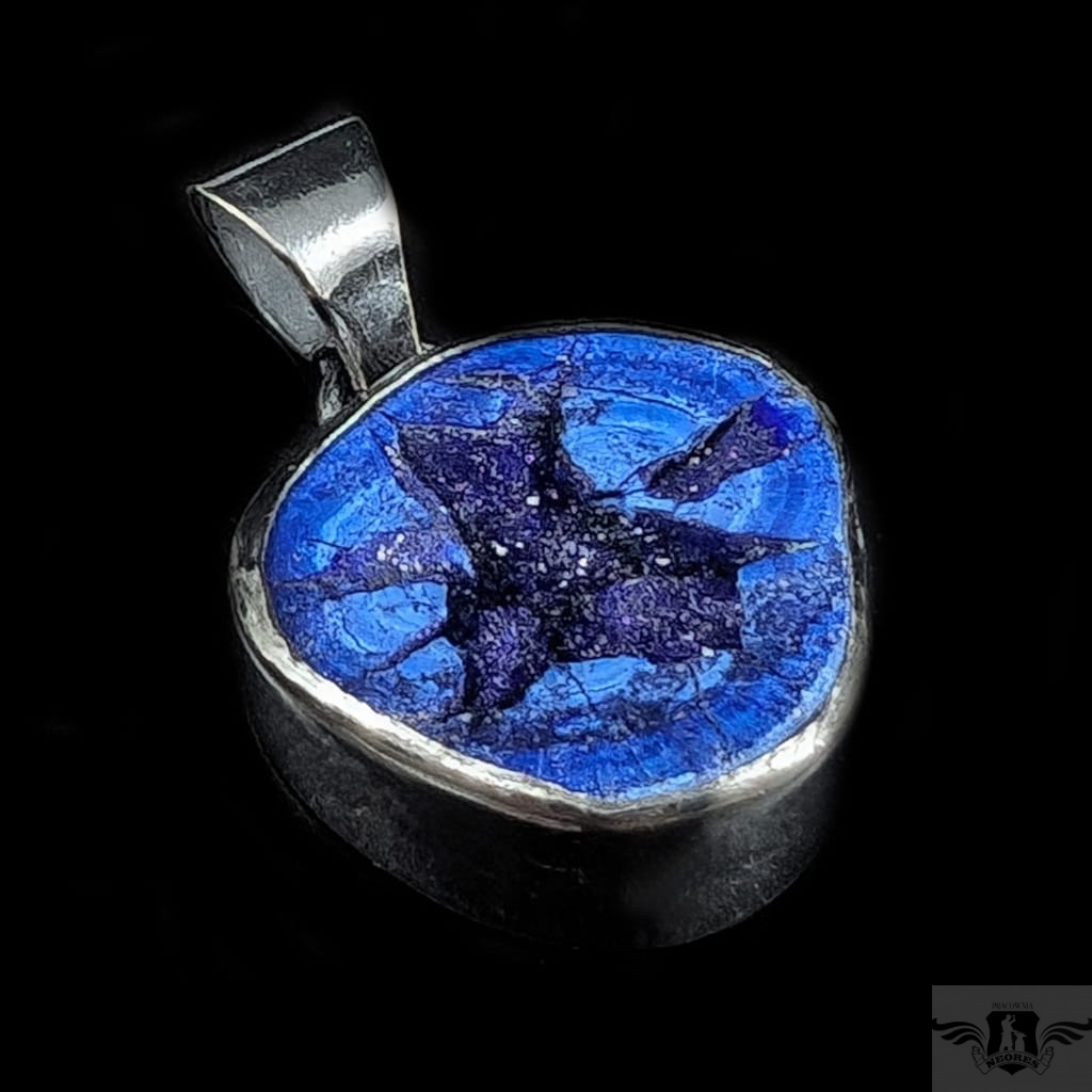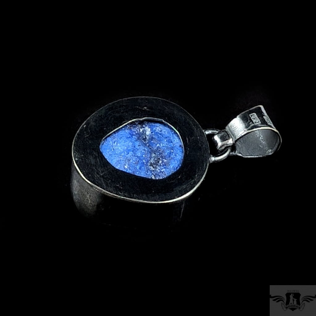 Bardzo ciekawy wisior z niezwykłą, rzadką geodą azurytową. Geoda oprawiona w surową, solidną ramę srebra próby 925, oksydowaną. Waga wisiora 11 gramów. Wymiary oprawy 24 x 23 mm. Długość z krawatką 35 mm. Wisior wysłany w ozdobnym pudełeczku.