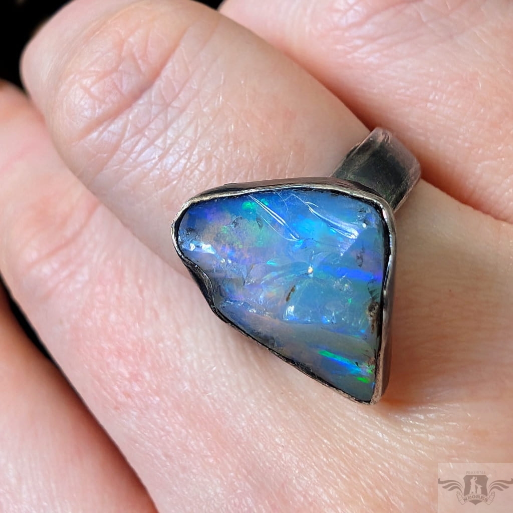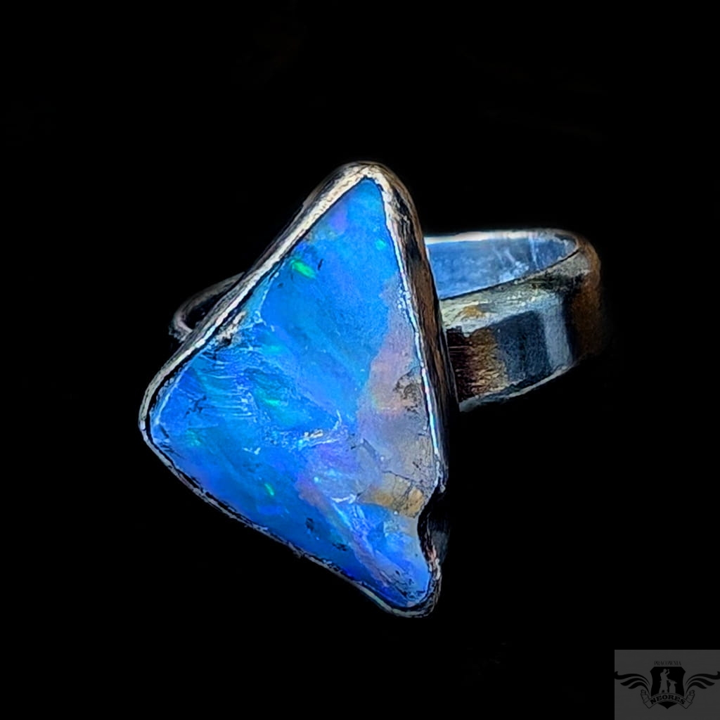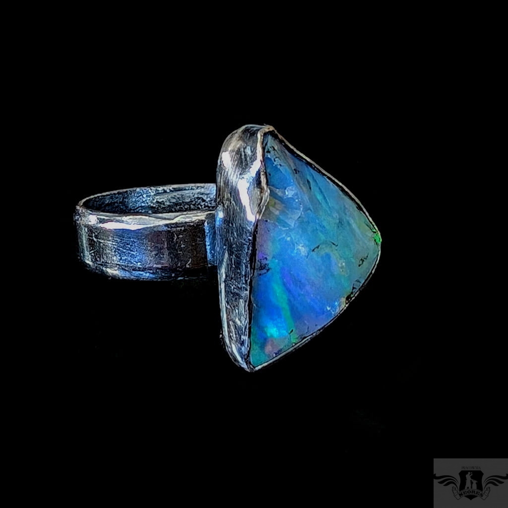 Surowy pierścień z oprawionym okazałym opalem etiopskim o niebiesko-zielonej tafli. Kamień o wspaniałej opalizacji. Srebro pr.925, oksydowane. Wymiary oprawy 20 x 13 mm. Waga 6 g. Obrączka regulowana w szerokim zakresie (10-24), proszę napisać po zakupie, to dopasuję na konkretny rozmiar. Obrączka ma 5 mm szerokości. Zapakowany w ozdobne pudełeczko.