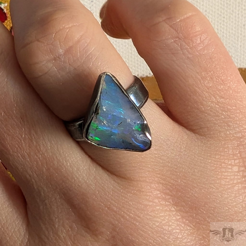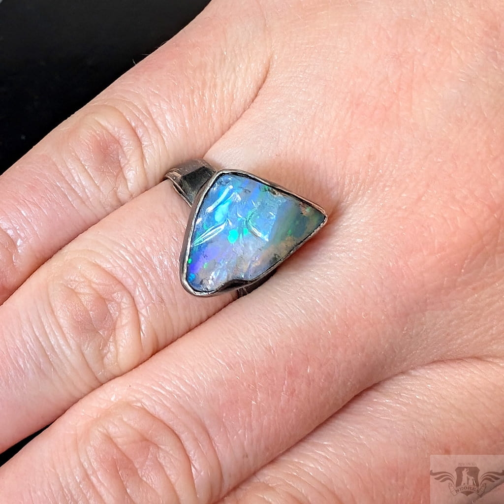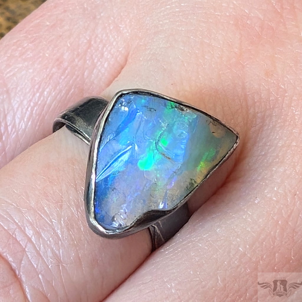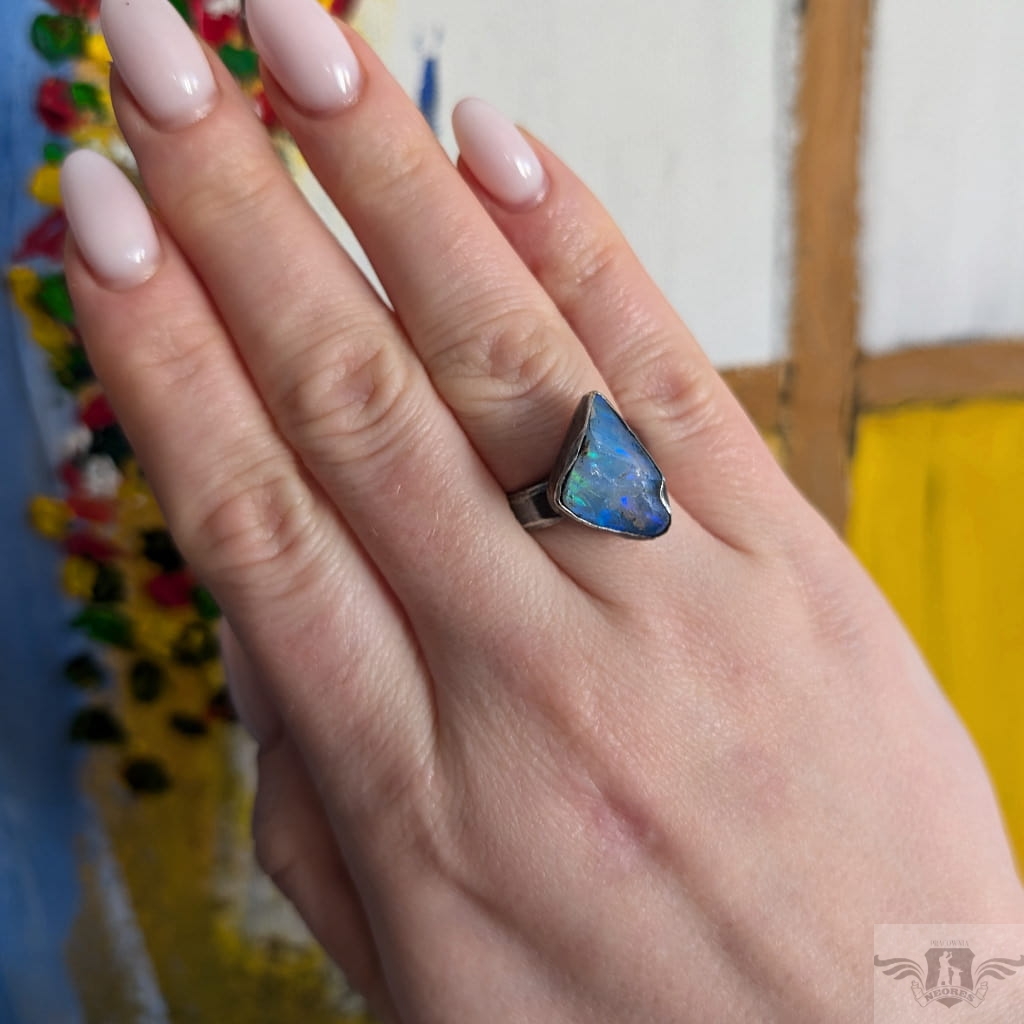 Surowy pierścień z oprawionym okazałym opalem etiopskim o niebiesko-zielonej tafli. Kamień o wspaniałej opalizacji. Srebro pr.925, oksydowane. Wymiary oprawy 20 x 13 mm. Waga 6 g. Obrączka regulowana w szerokim zakresie (10-24), proszę napisać po zakupie, to dopasuję na konkretny rozmiar. Obrączka ma 5 mm szerokości. Zapakowany w ozdobne pudełeczko.