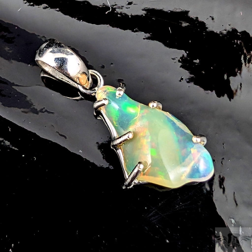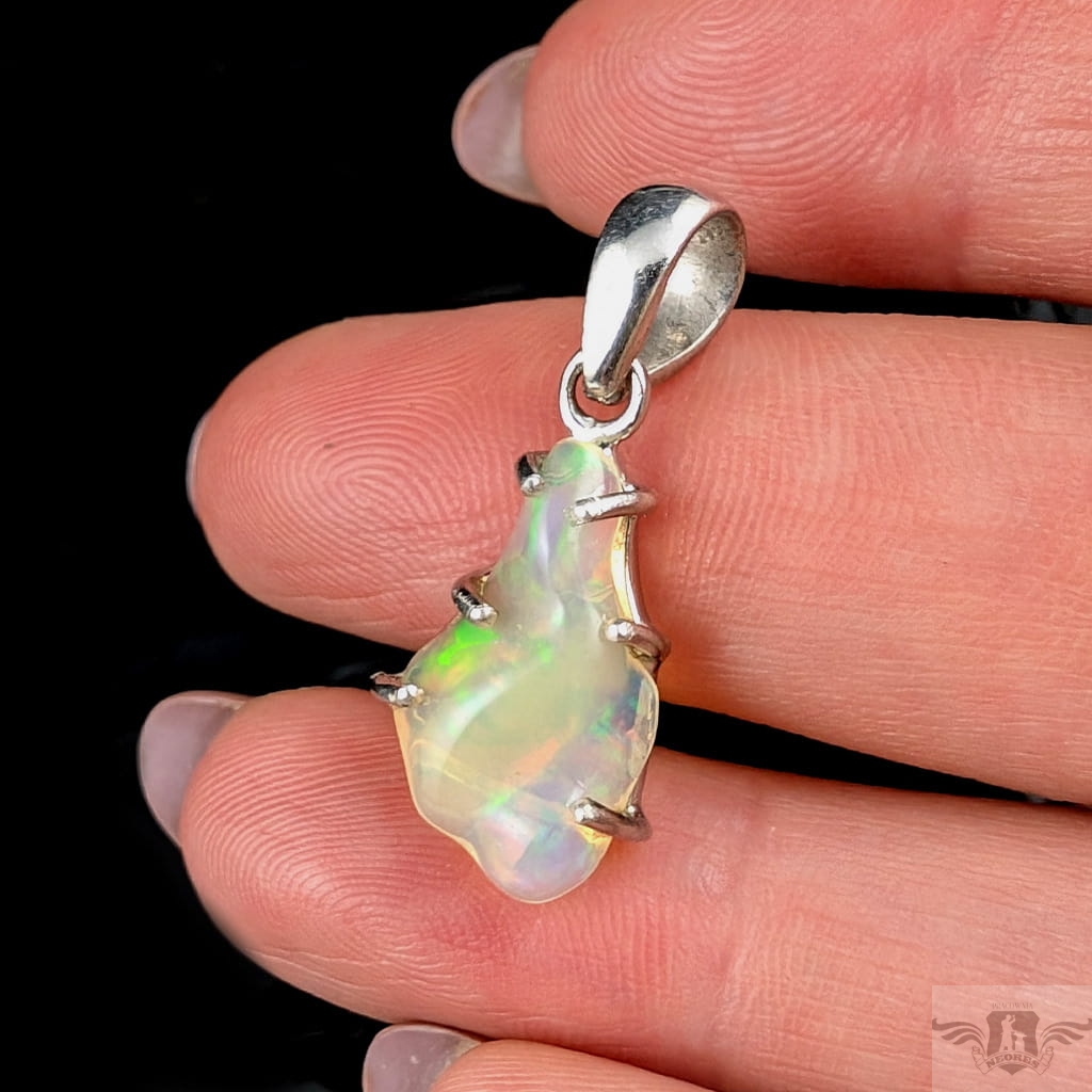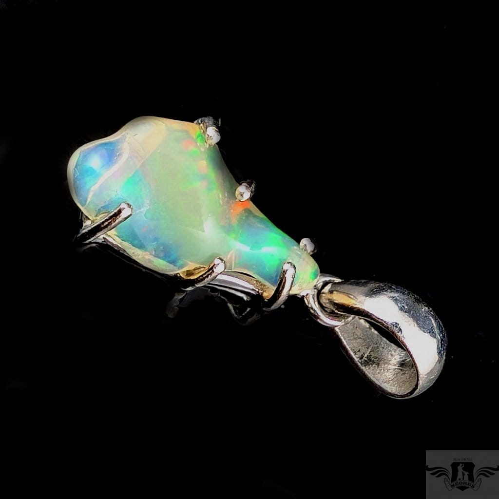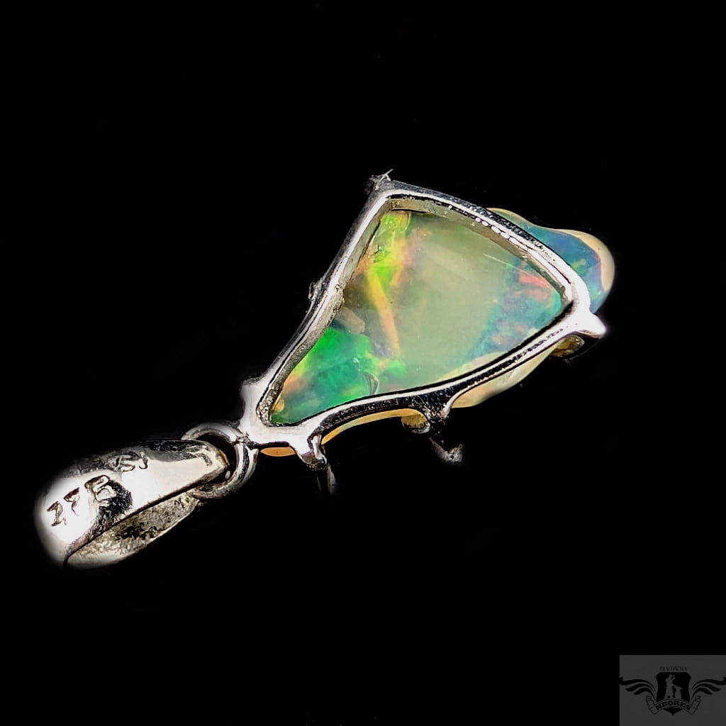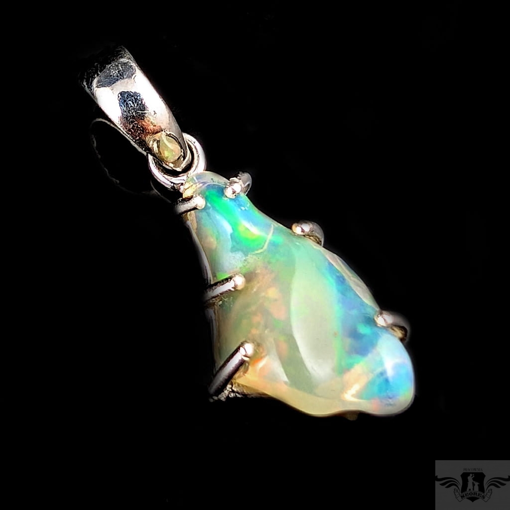 Wisiorek z oprawiony w srebro pr. 925 pięknym opalem z Etiopii. Wymiary 20 x 12 mm, długość max 30 mm. Waga 1,8 g.Wisiorek zostanie wysłany w ozdobnym pudełeczku.Wykonany przez dostawcę kamieni.