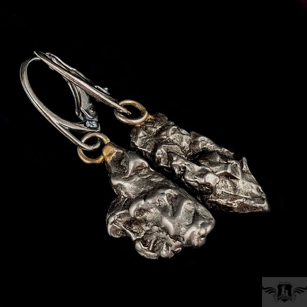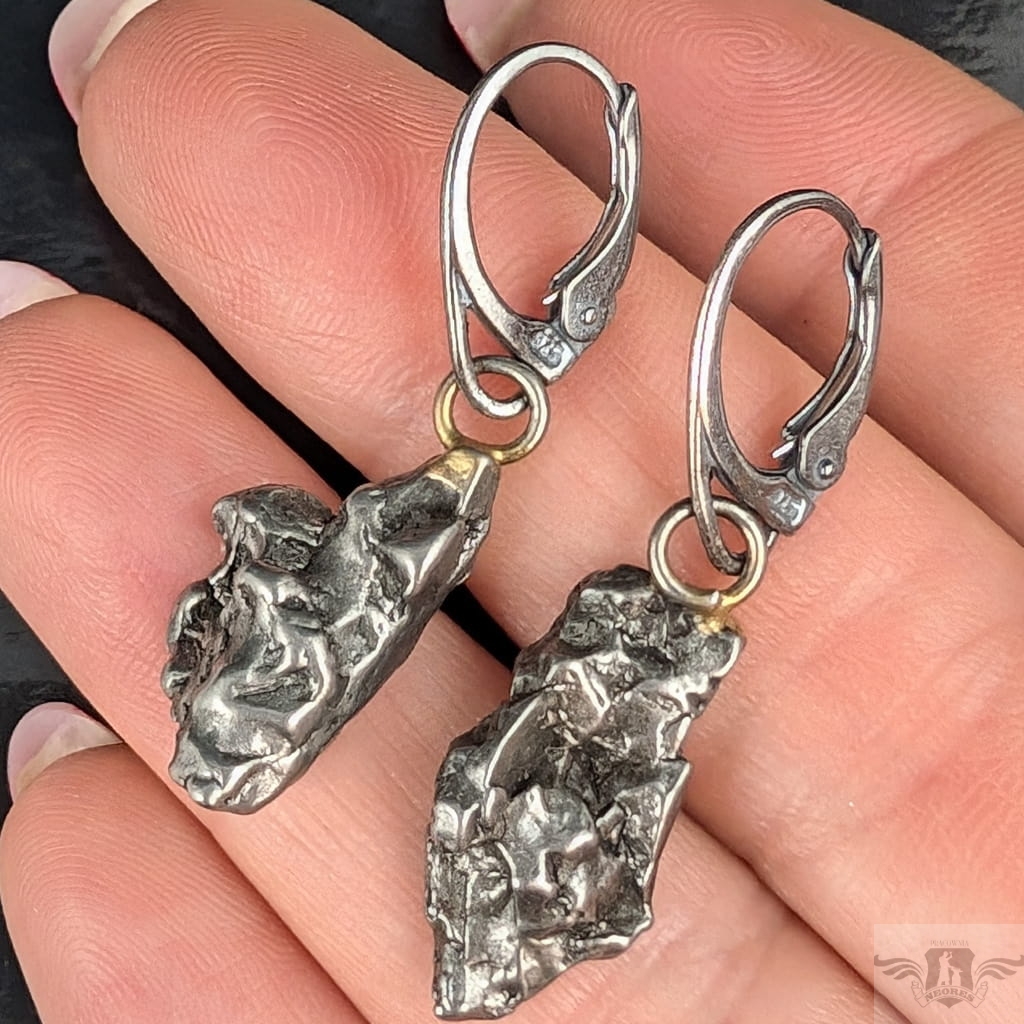 Kosmiczne kolczyki z meteorytami Campo Del Cielo (Argentyna) o kształcie nieregularnych bryłek na biglach angielskich z oksydowanego srebra próby 925. Wymiary elementów 20 x 10 mm. Długość z biglami angielskimi 37 mm. Lekkie, komfortowe i bardzo efektowne. Waga jednego kolczyka 4,2 grama. Kolczyki zostaną wysłane w ozdobnym pudełeczku.