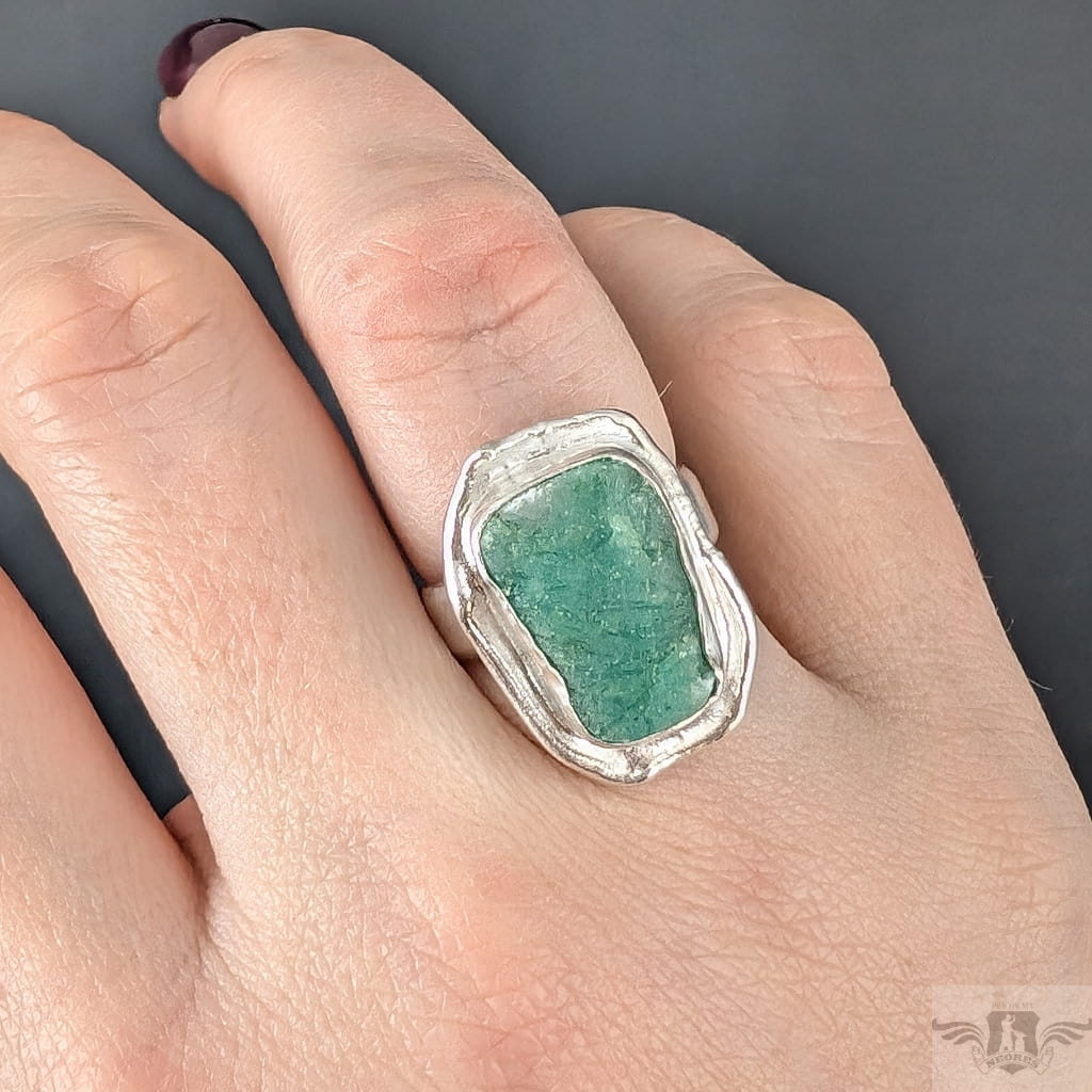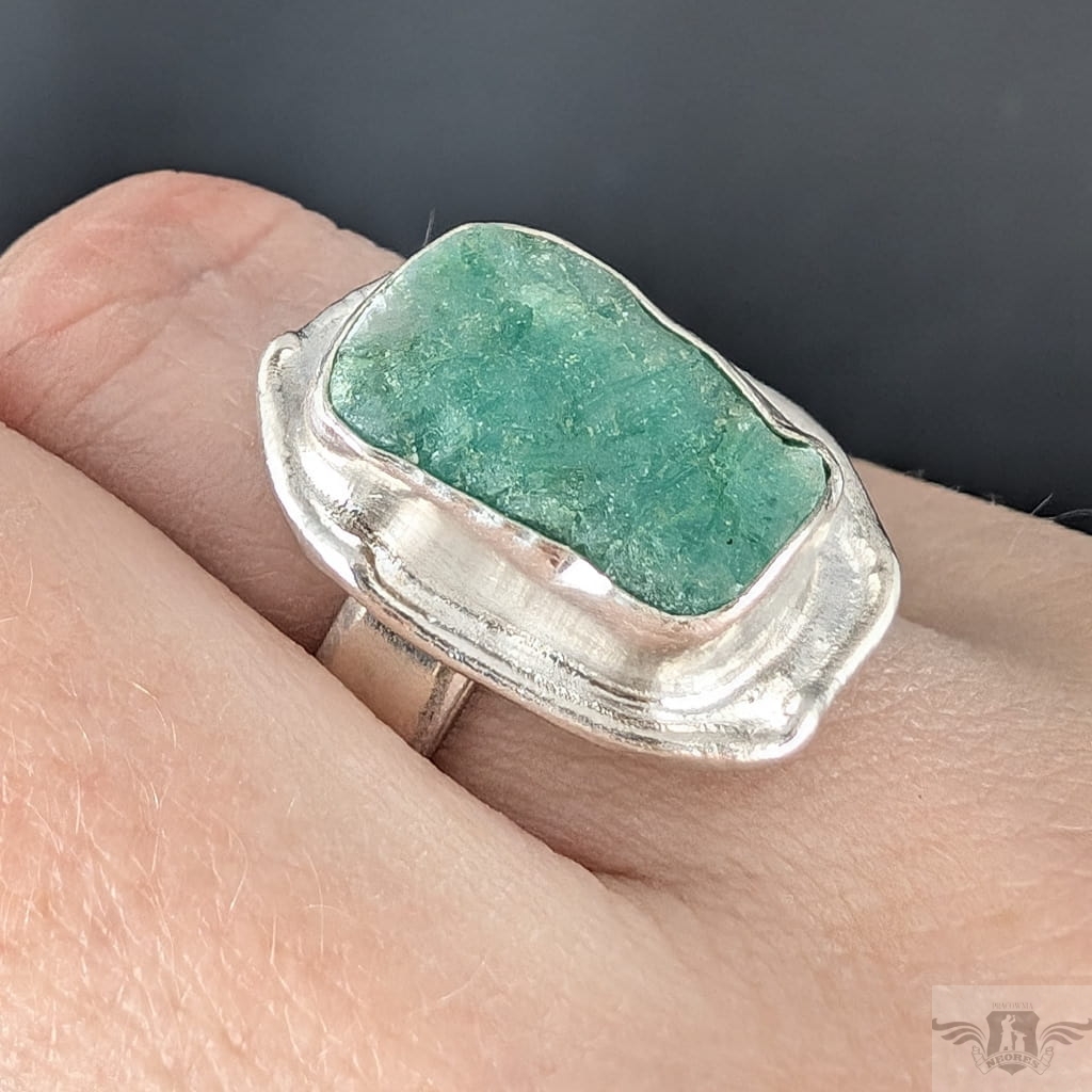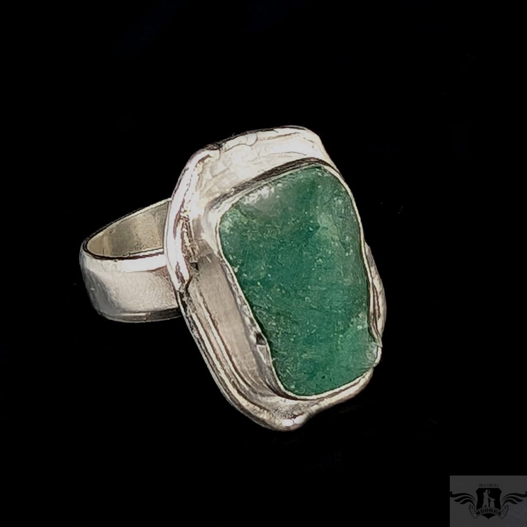Pierścień wykonany ze srebra pr. 925 oraz pięknego szmaragdu o surowej tafli. 10,45 Ct. Regulowana obrączka 5 mm szerokości. Rozmiar jubilerski można dopasować w zakresie 9-25. Wymiary oprawy 22 x 16 mm. Waga 8,7 g. Pierścień zostanie zapakowany w ozdobne pudełeczko.