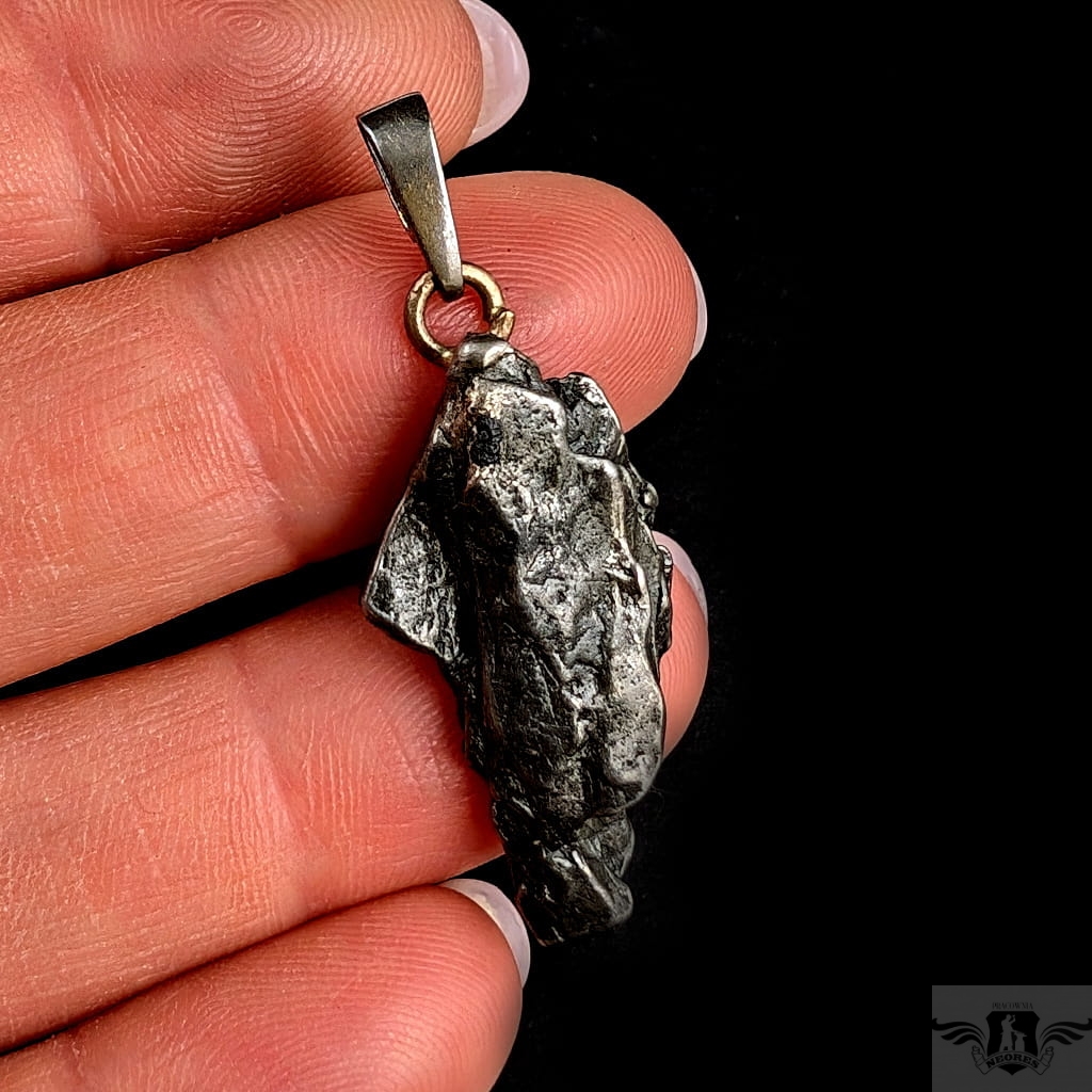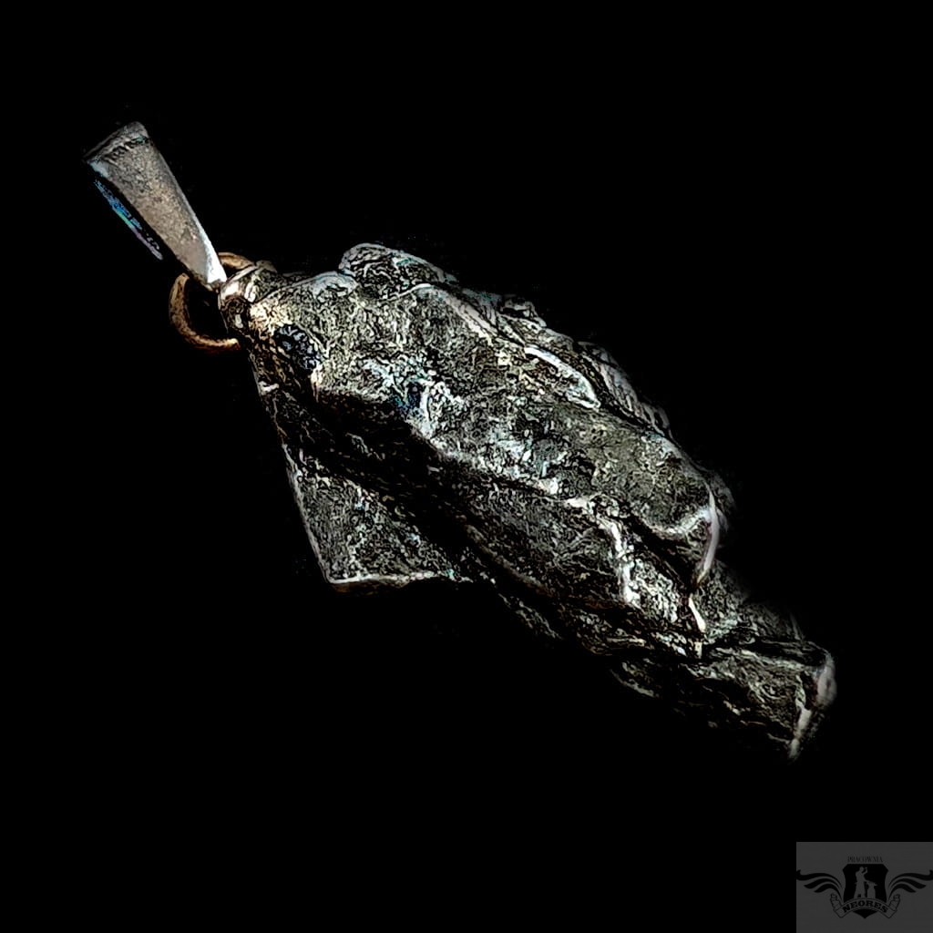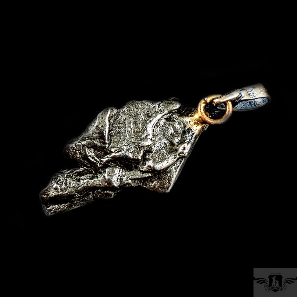 Wyjątkowy wisior z okazałym meteorytem żelaznym Campo del Cielo, który znaleziono w 1576 roku w Argentynie. Meteorytom przypisywane są magiczne właściwości talizmanów. Z pewnością jest to niebanalny materiał jubilerski w ciekawy sposób zakomponowany w srebro.Uniwersalny,dla niego lub dla niej. Wymiary 30 x 15 mm, z krawatką z oksydowanego srebra długosć 40mm, Waga wisiora 6,5 g. Wisior zostanie zapakowany w ozdobne pudełeczko.