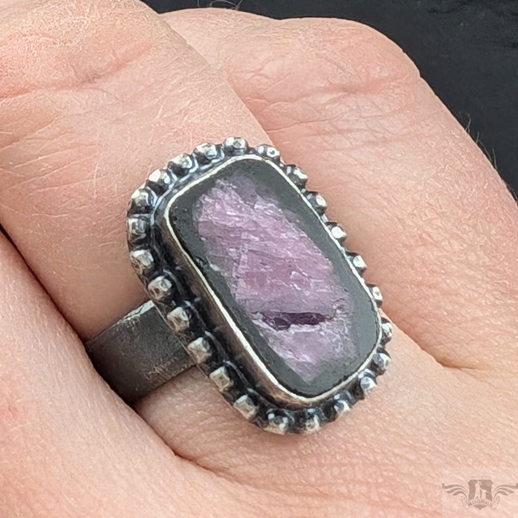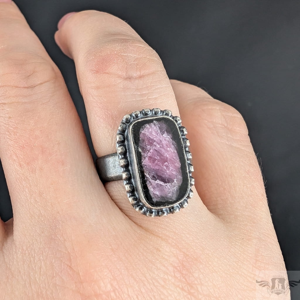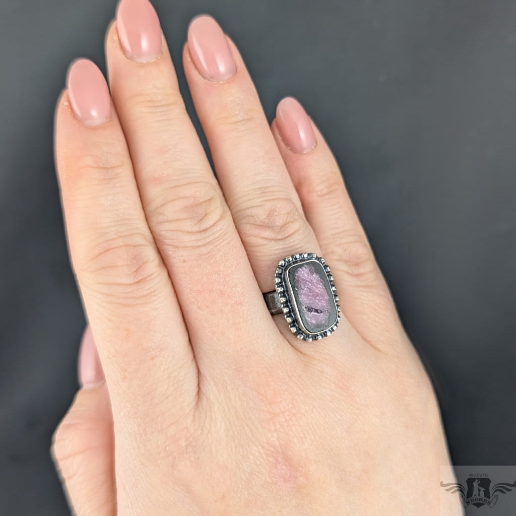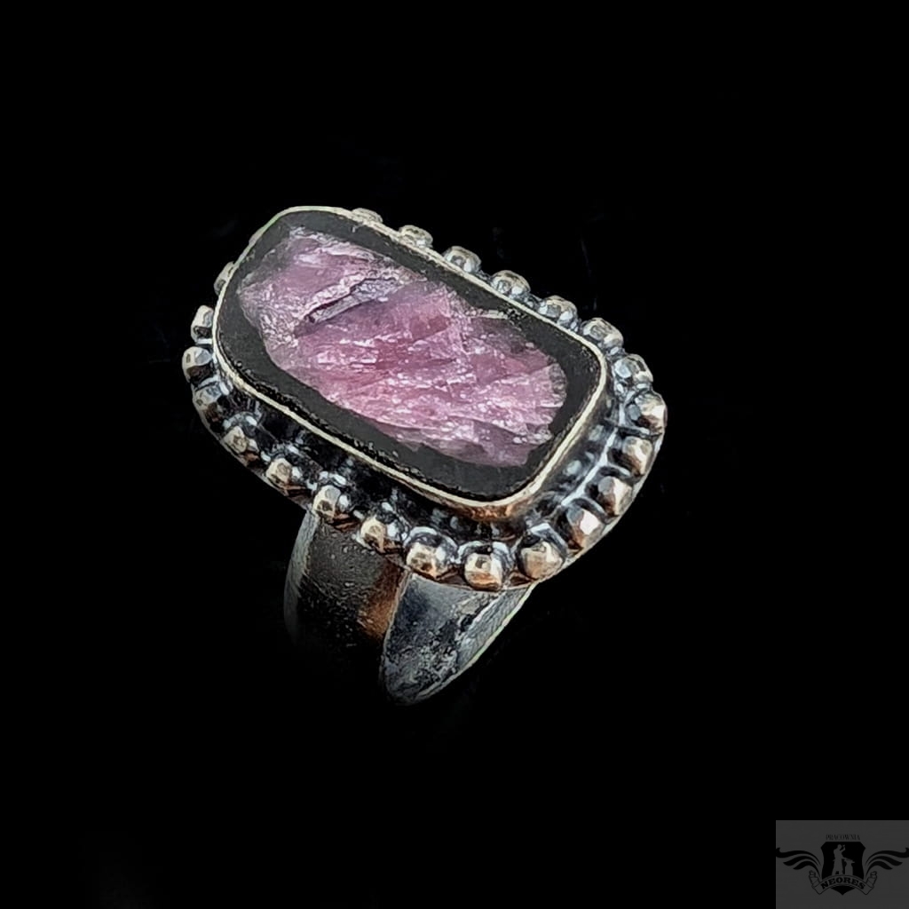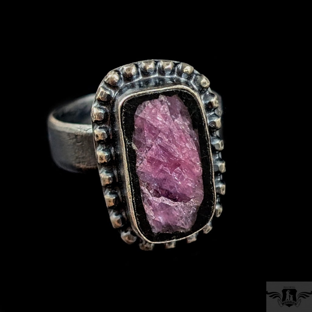 Pierścień z oprawionym w srebro próby 925 naturalnym rubinem. Srebro oksydowane. Wymiary oprawy pierścienia 20 x 13 mm. Rozmiar jubilerski regulowany, obrączka 5 mm. Proszę napisać, jaki rozmiar ustawić. Waga 7grama. Pierścień zapakowany w ozdobne pudełeczko.