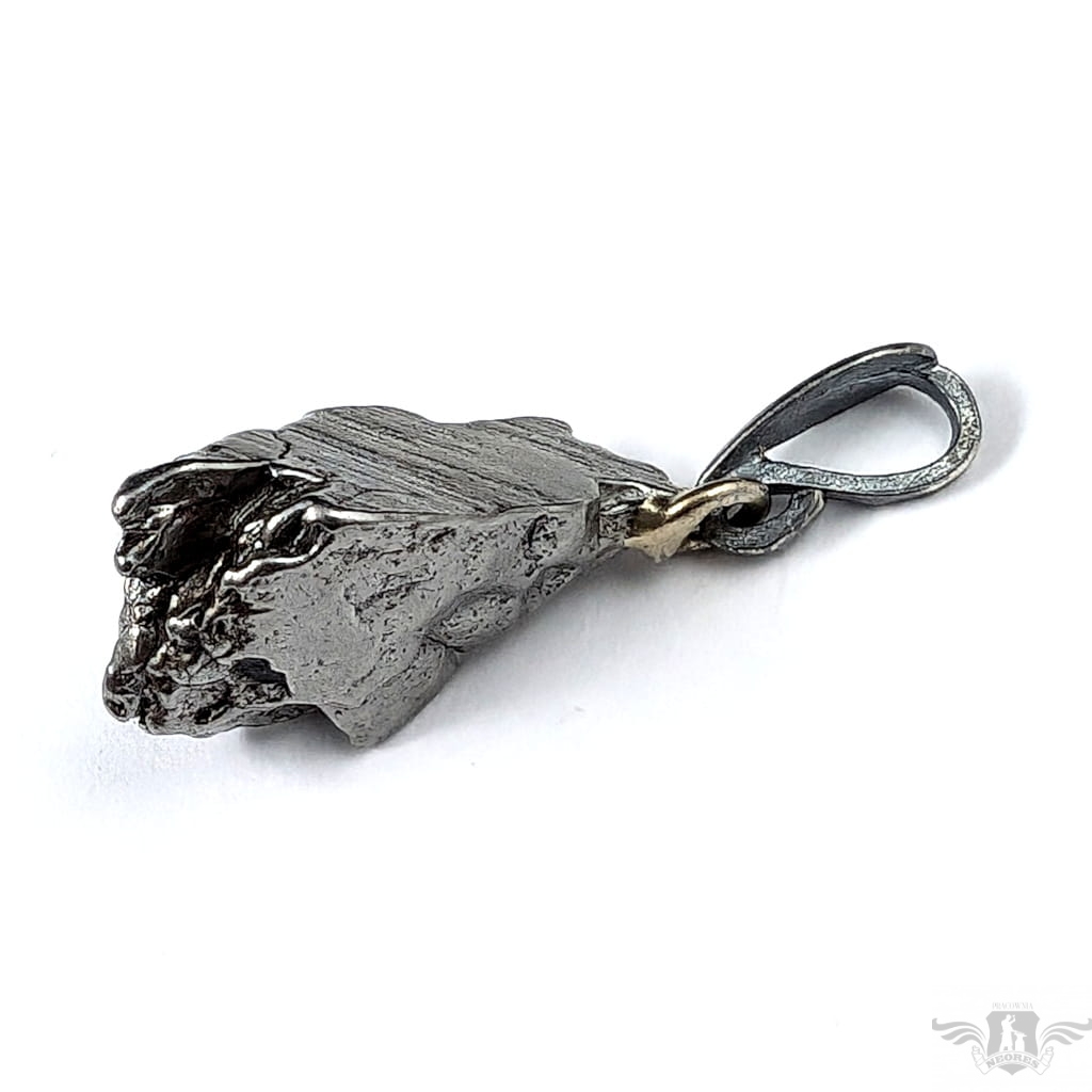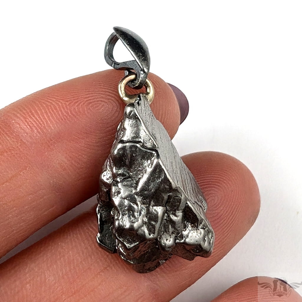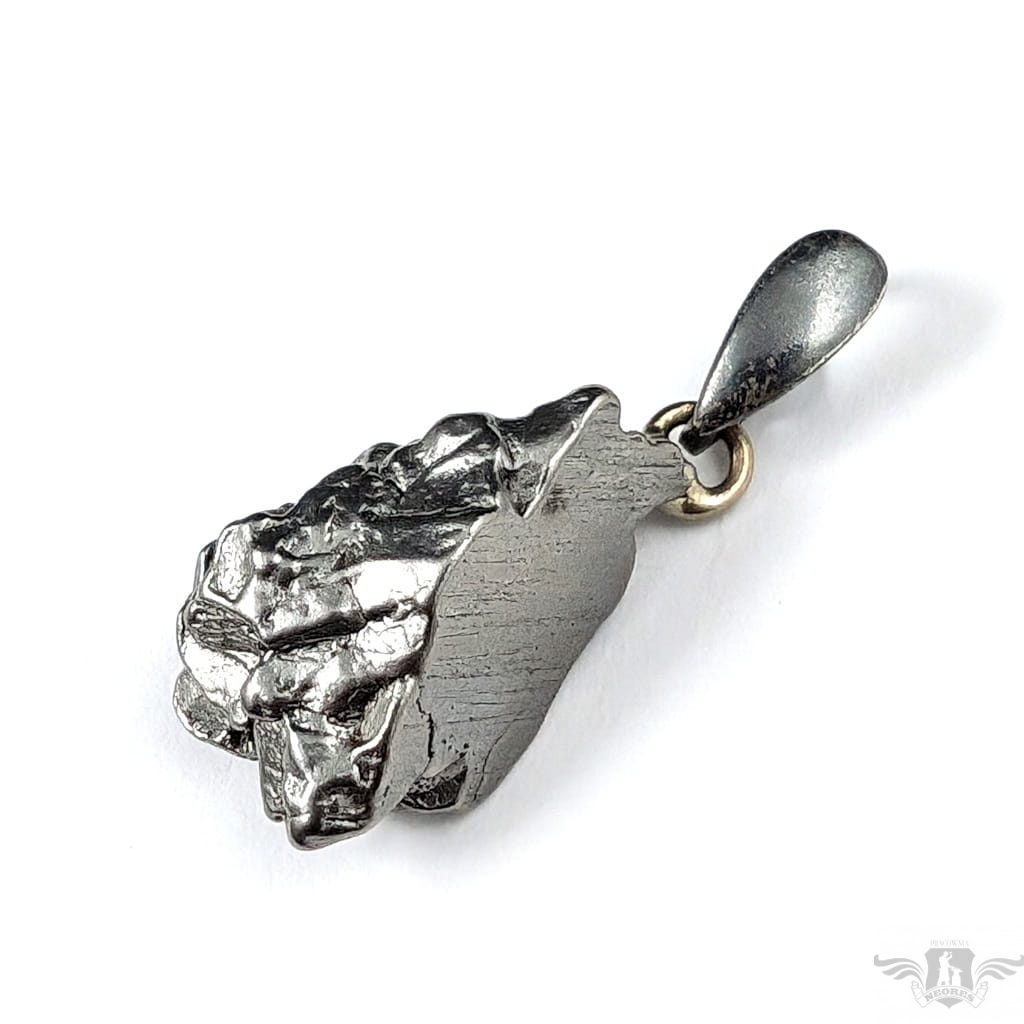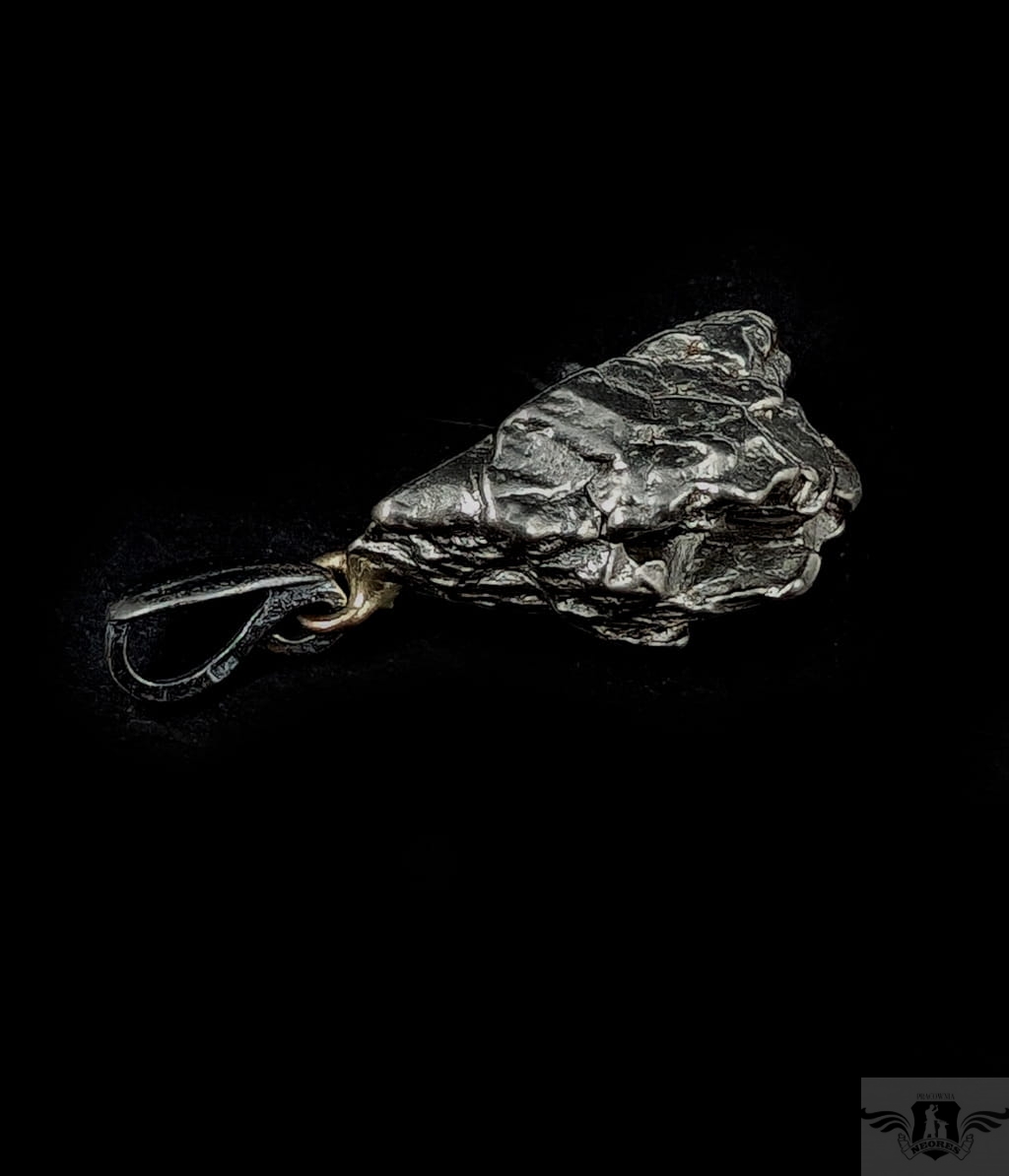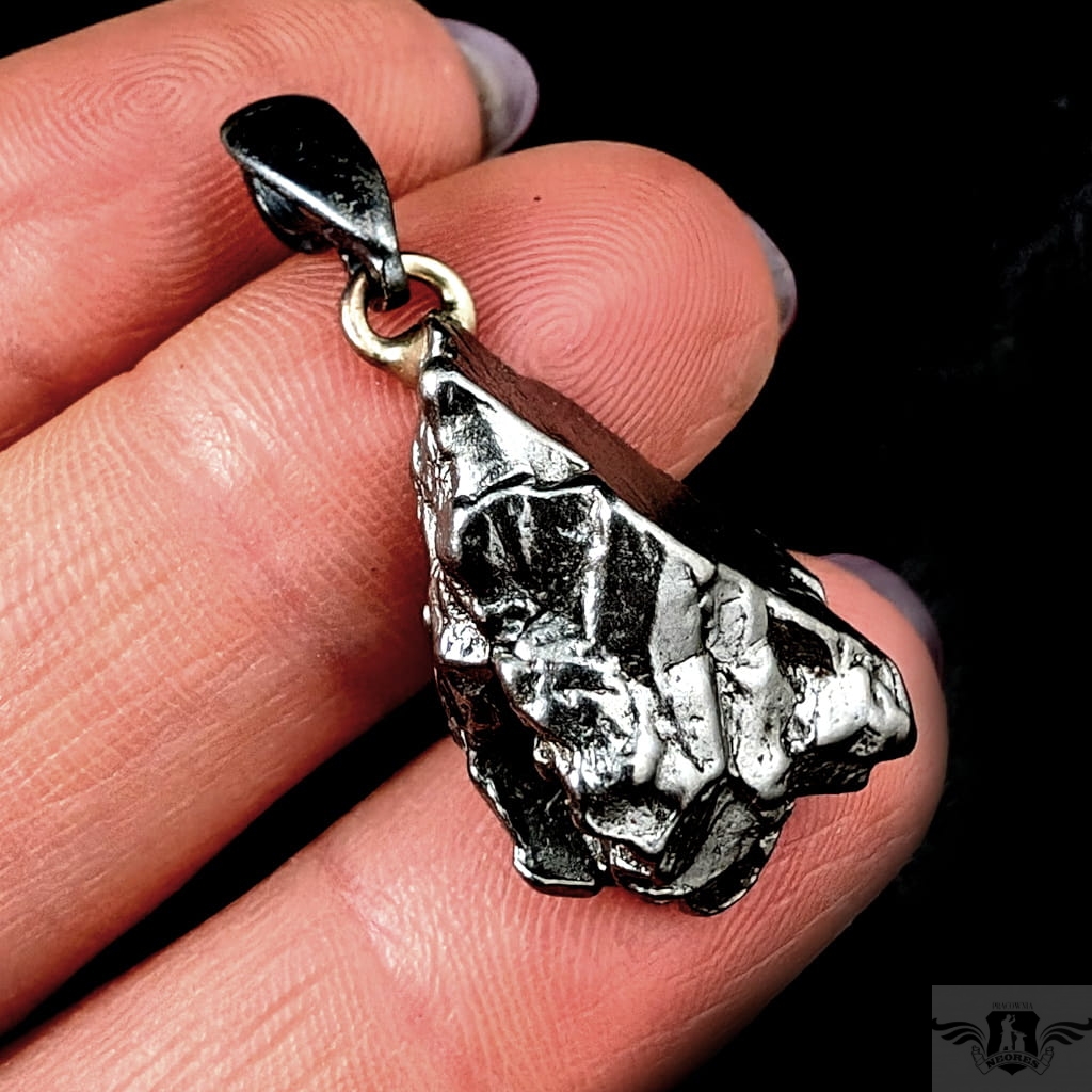Wisiorek z okazałym, ciężkim meteorytem żelaznym Campo del Cielo, który znaleziono w 1576 roku w Argentynie. Meteorytom przypisywane są magiczne właściwości talizmanów. Z pewnością jest to niebanalny materiał jubilerski w ciekawy sposób zakomponowany w srebro.Uniwersalny,dla niego lub dla niej. Do meteorytu dołączona jest jego metryka. Wymiary 22 x 14 mm, z krawatką z oksydowanego srebra długosć 34 mm, Waga wisiora 10 g. Wisior zostanie zapakowany w ozdobne pudełeczko.