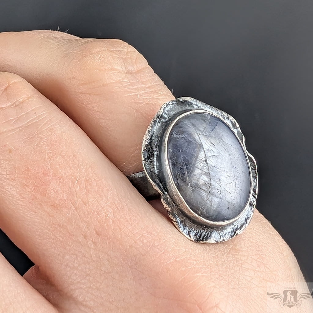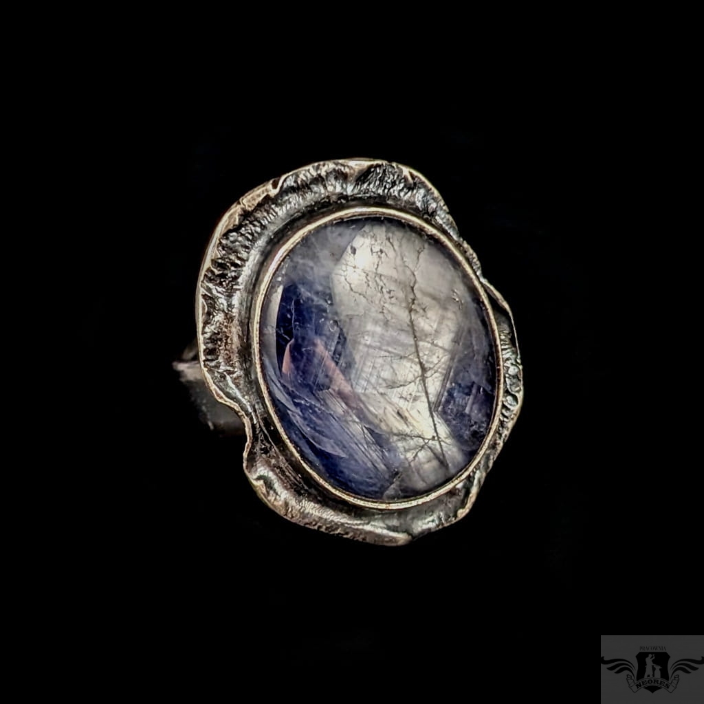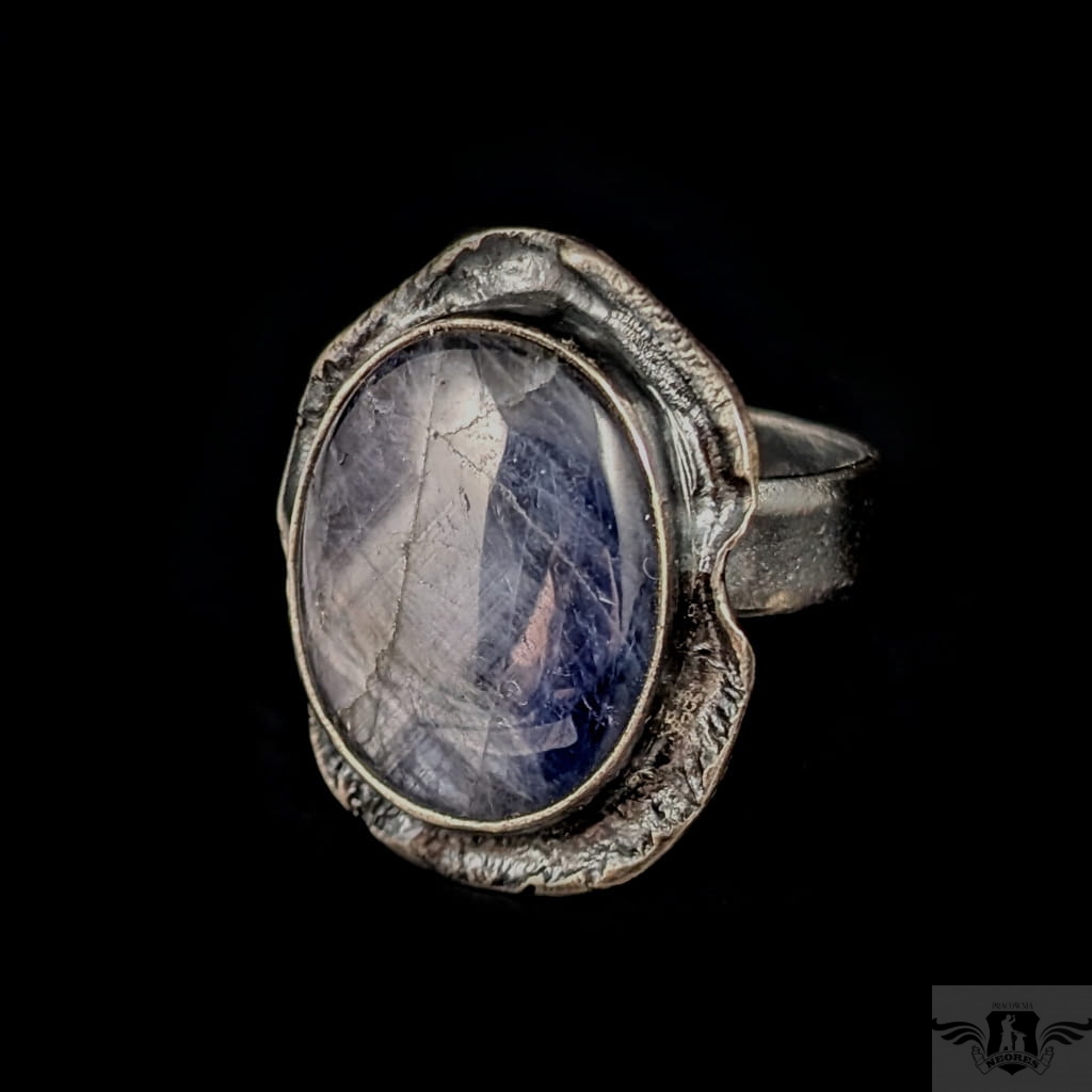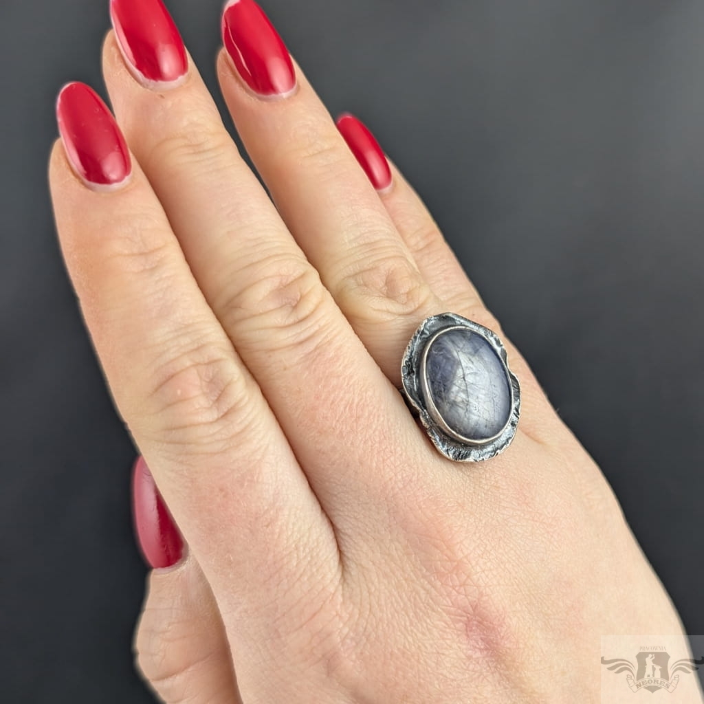 Okazały pierścień z oprawionym w oksydowane srebro pr. 925 okazem pięknego szafiru. Wymiary oprawy 25 x 20 mm. Waga 11 g. Rozmiar jubilerski regulowany, po zakupie mogę dopasowac na konkretny, obrączka ma 5 mm szerokości. Pierścionek zostanie wysłany w ozdobnym pudełeczku.