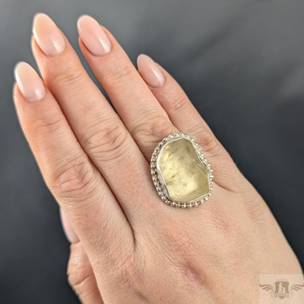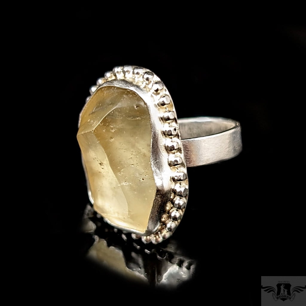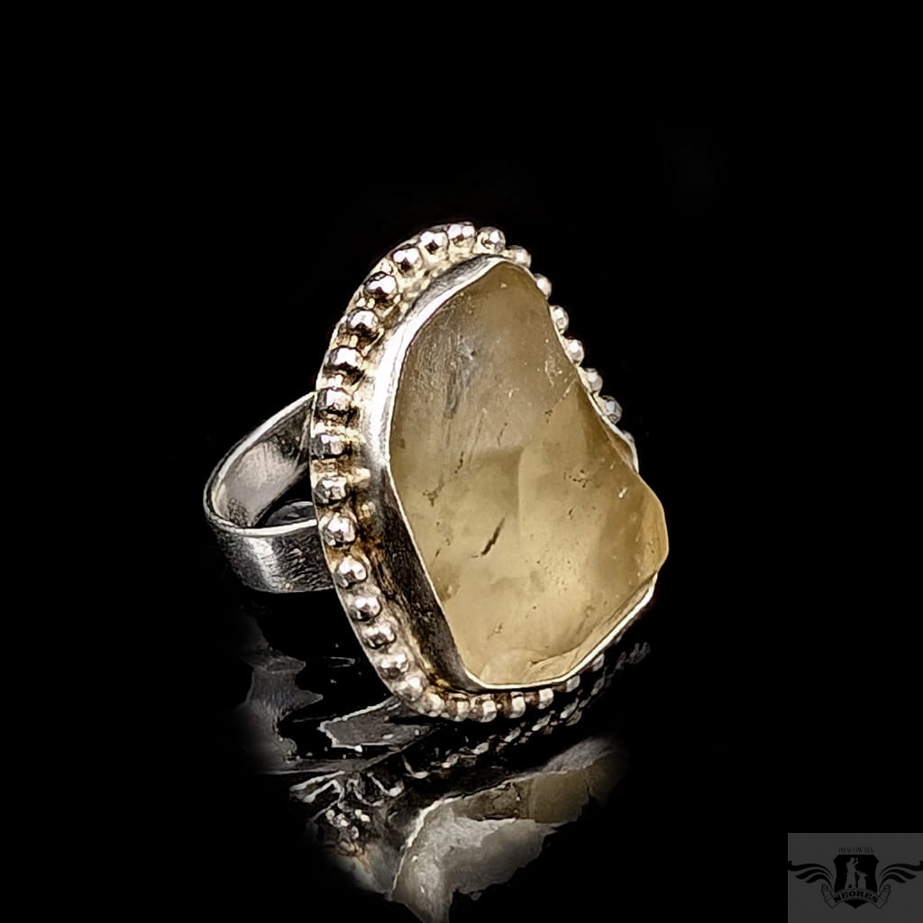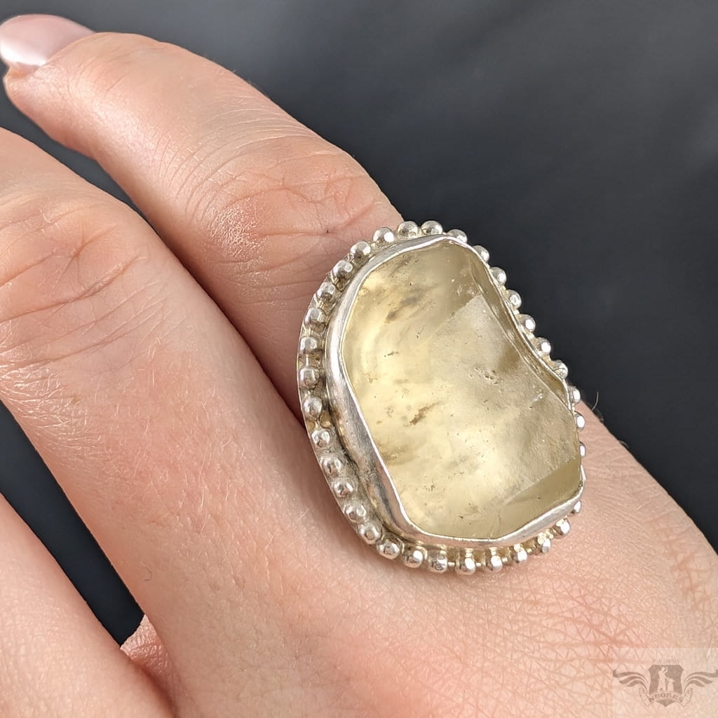 Pierścień, który zdobi piękny, surowy okaz unikalnego szkła libijskiego. Oprawa srebra próby 925. Waga 11 g. Wymiary całej oprawy 29 x 24 mm. Rozmiar jubilerski mjogę dopasować w zakresie 13-17. Pierścień zapakowany zostanie w ozdobne pudełeczko.