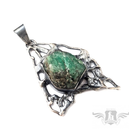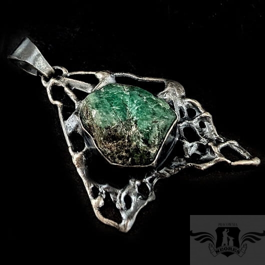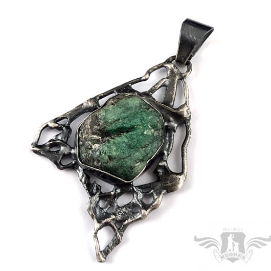 Ciekawy wisior wykonany z oksydowanego srebra próby 925 oraz pięknego, naturalnego szmaragdu połyskującego minerałami. Wymiary wisiora 48 x 35mm, z krawatką długosć 60 mm. Kamień ma 20 x 18 mm. Wisior waży 12,8 grama. Wisior zostanie zapakowany w ozdobne pudełeczko.