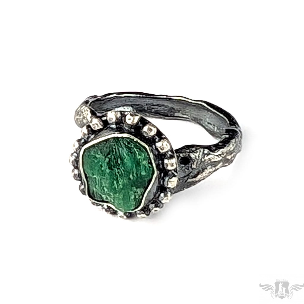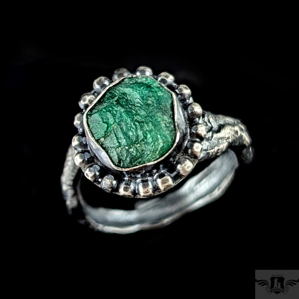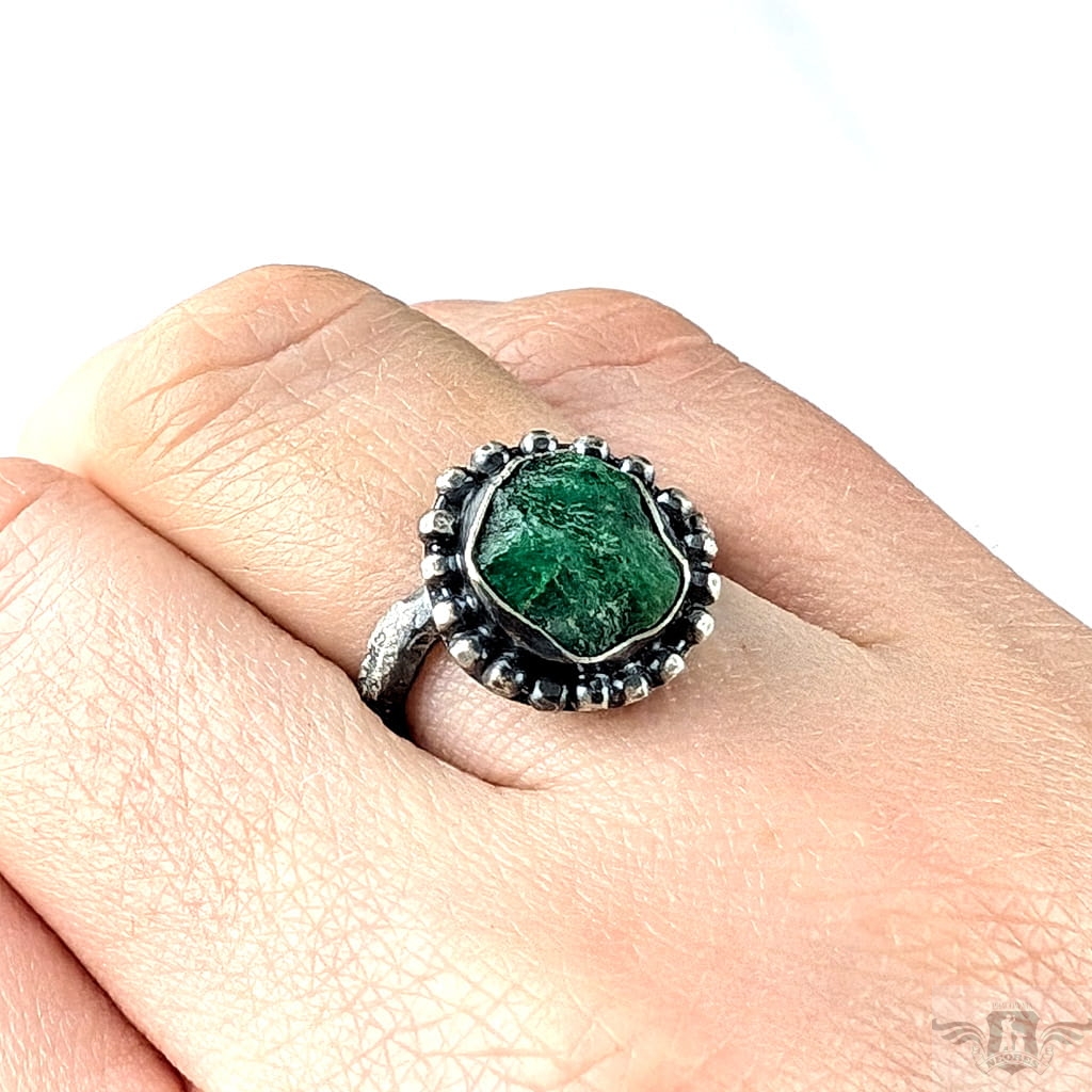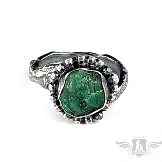 Pierścień wykonany z oksydowanego srebra pr. 925 oraz pięknego szmaragdu o surowej tafli.Regulowana obrączka ma 3-5 mm szerokości. Rozmiar jubilerski można dopasować w zakresie 9-22. Wymiary oprawy 14 x 13 mm. Ustawię odpowiedni, proszę o wiadomość. Waga 5,5 g. Pierścień zostanie zapakowany w ozdobne pudełeczko.