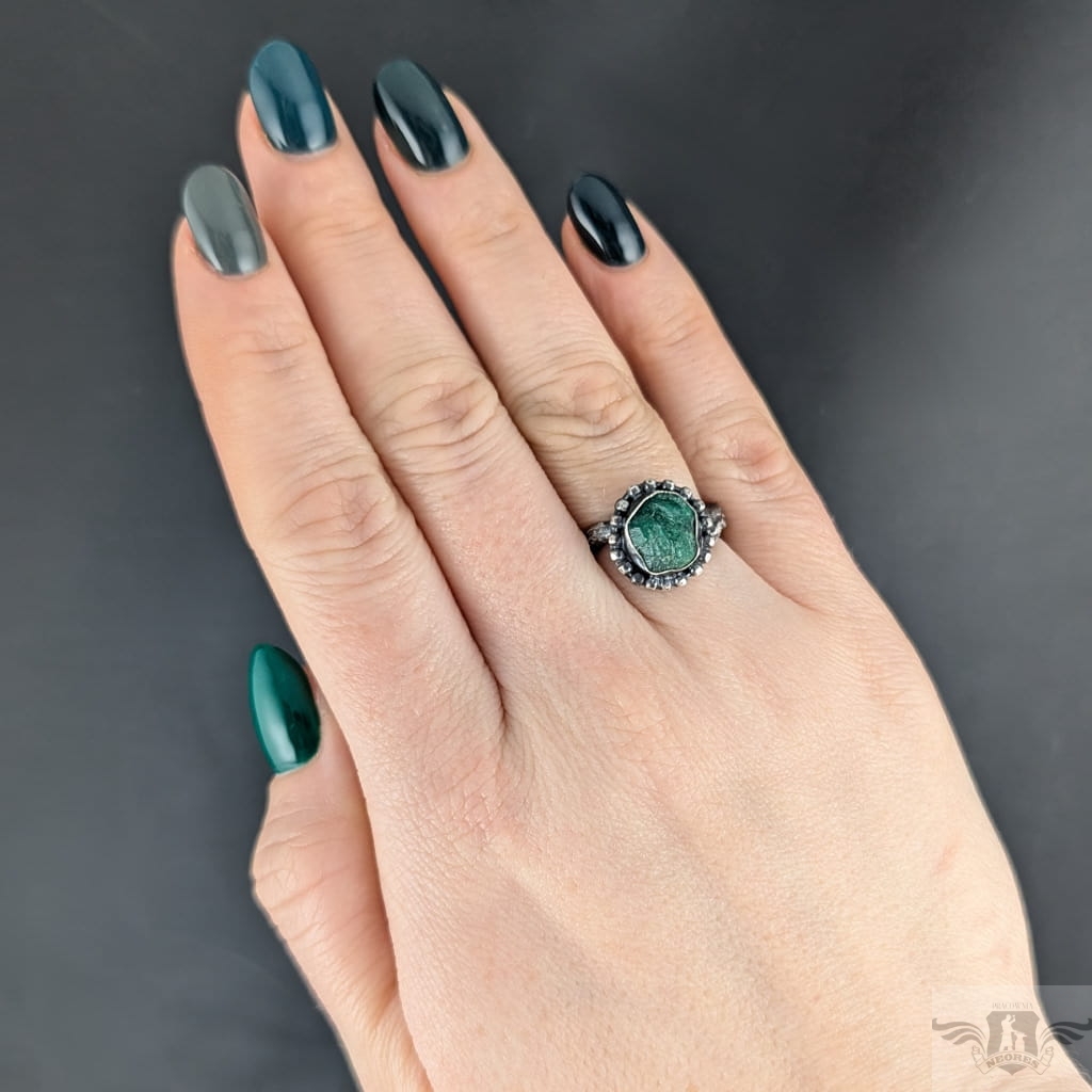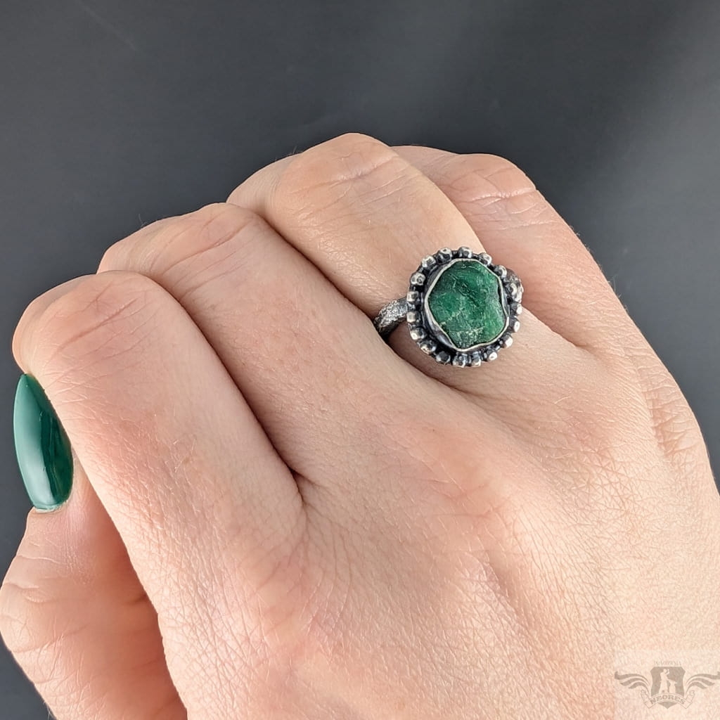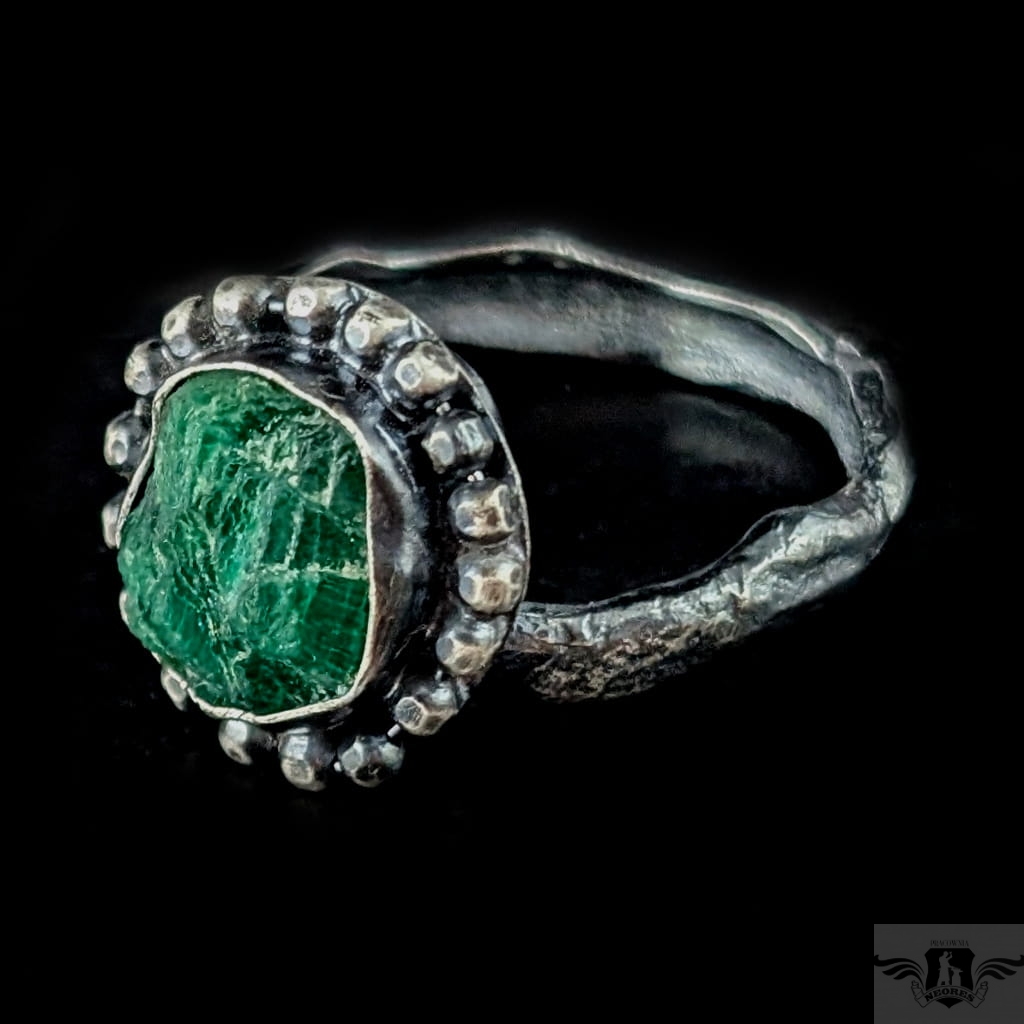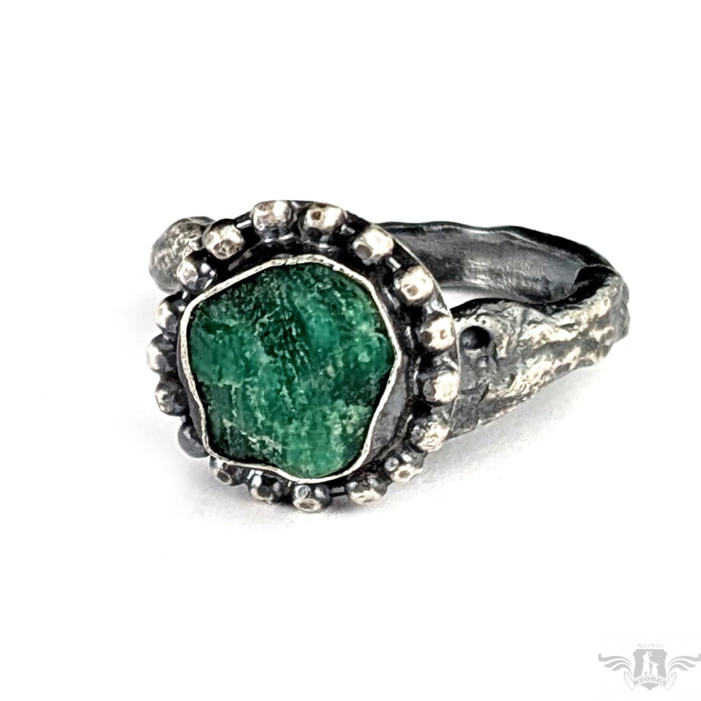 Pierścień wykonany z oksydowanego srebra pr. 925 oraz pięknego szmaragdu o surowej tafli.Regulowana obrączka ma 3-5 mm szerokości. Rozmiar jubilerski można dopasować w zakresie 9-22. Wymiary oprawy 14 x 13 mm. Ustawię odpowiedni, proszę o wiadomość. Waga 5,5 g. Pierścień zostanie zapakowany w ozdobne pudełeczko.