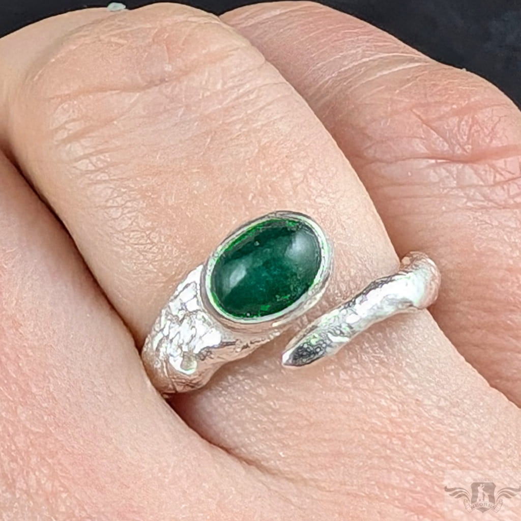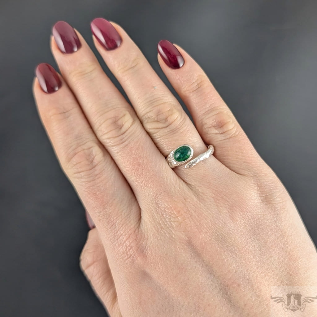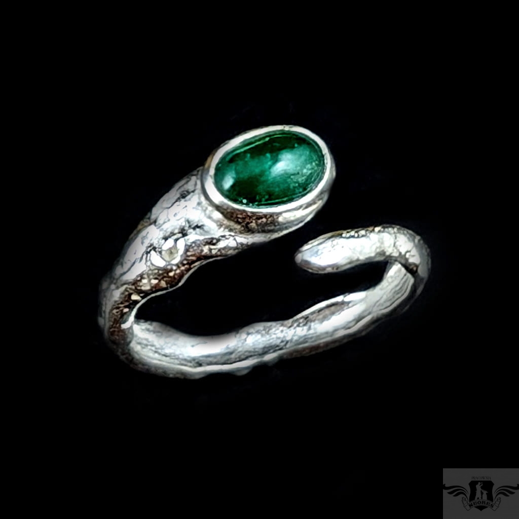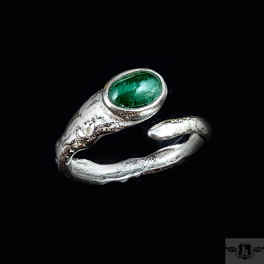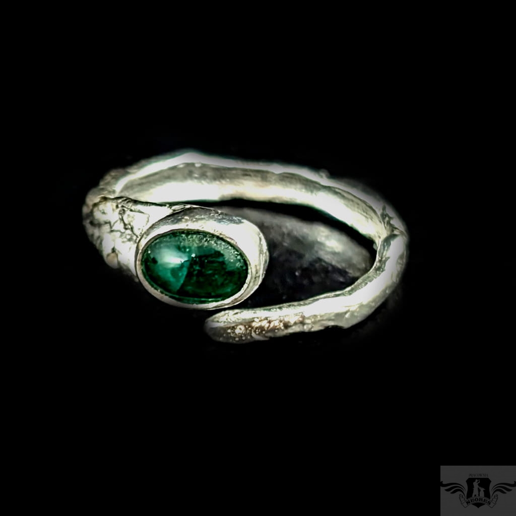 Pierścień wykonany ze srebra pr. 925 oraz pięknego szmaragdu o wymiarach 9 x 7 mm. Regulowana obrączka ma 3-5 mm szerokości. Rozmiar jubilerski z łatwością można dopasować w zakresie 9-22. Ustawię odpowiedni, proszę o wiadomość. Waga 4 g. Pierścień zostanie zapakowany w ozdobne pudełeczko.
