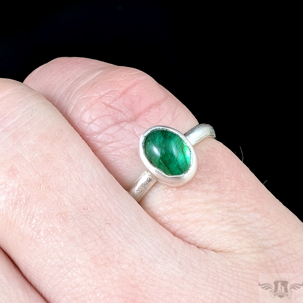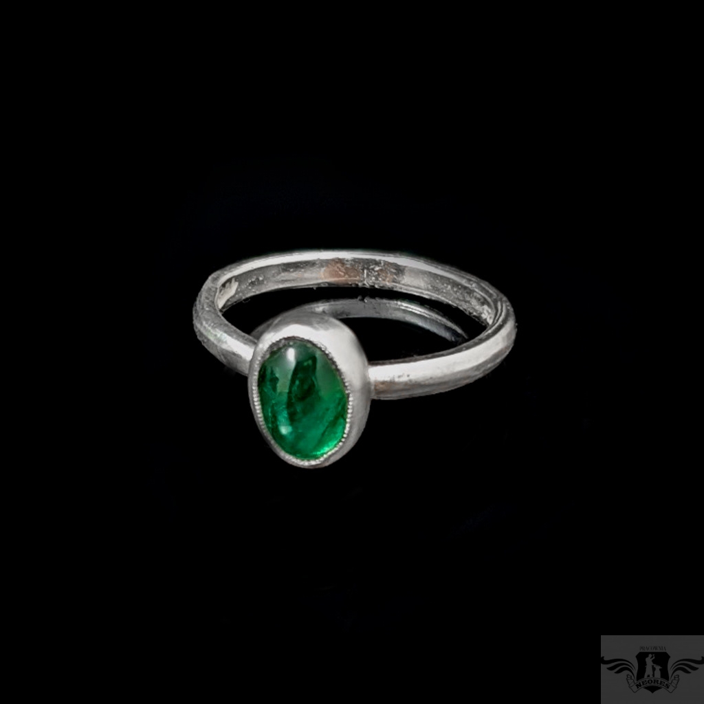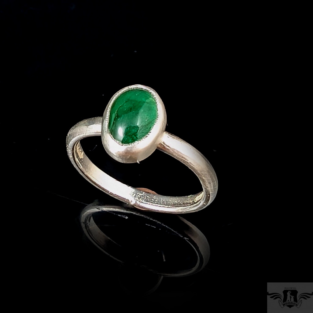 Retro pierścień z oprawionym w srebro próby 925 ciekawym, przejrzystym szmaragdem.