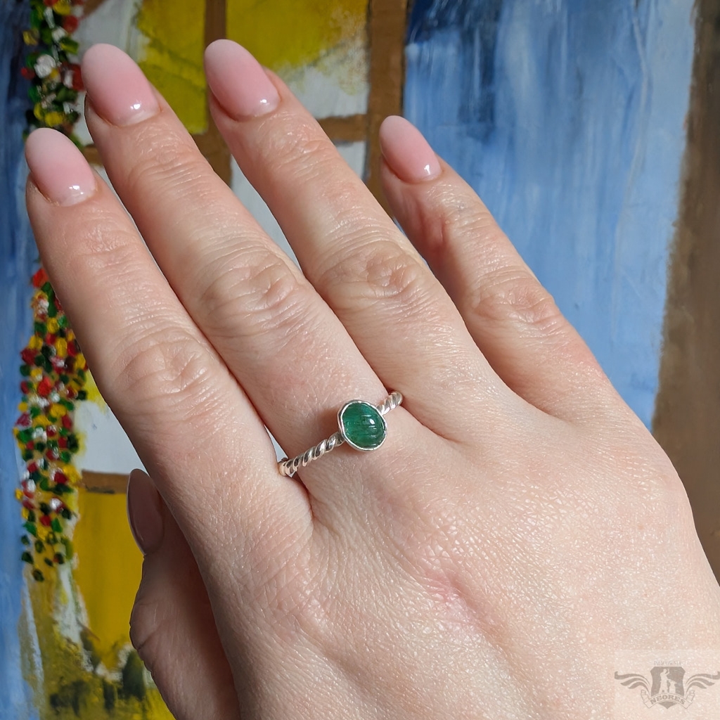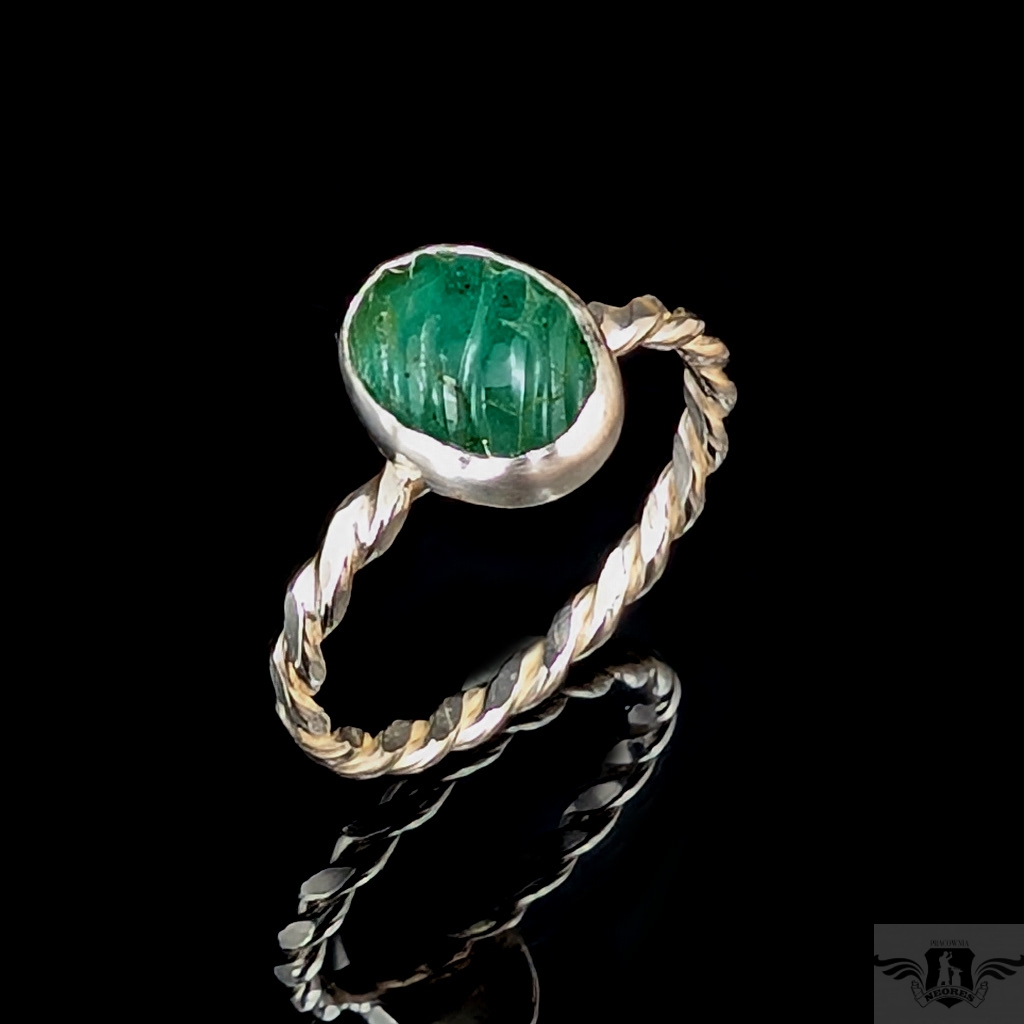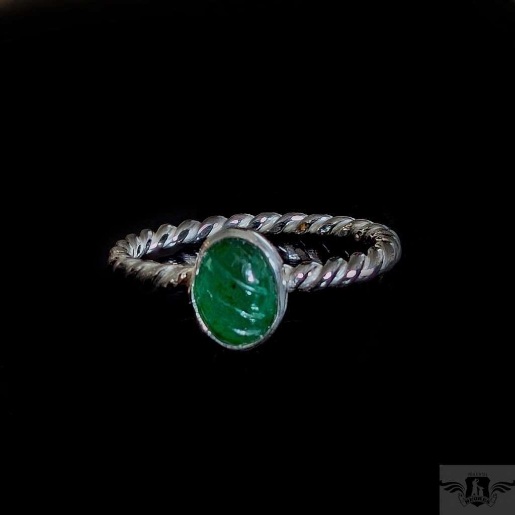 Retro pierścień z oprawionym w srebro próby 925 ciekawym, przejrzystym szmaragdem.