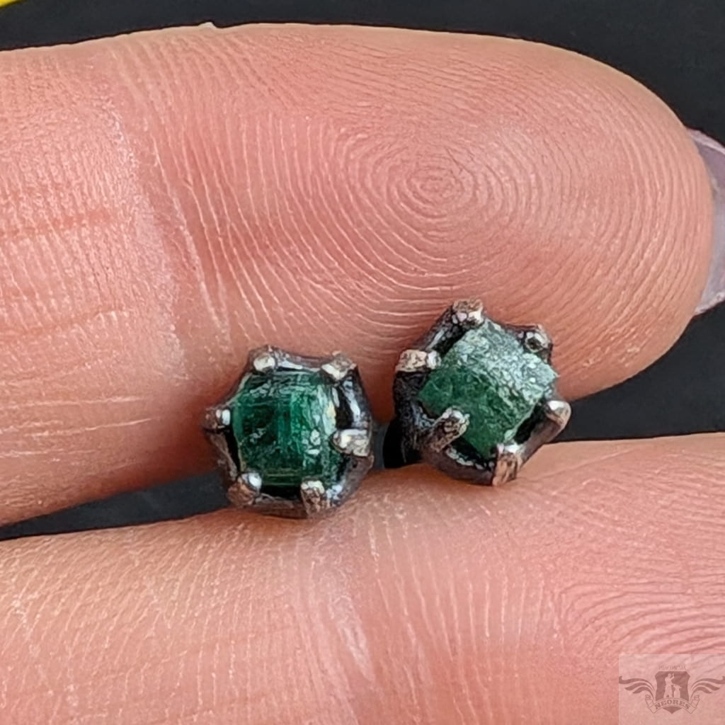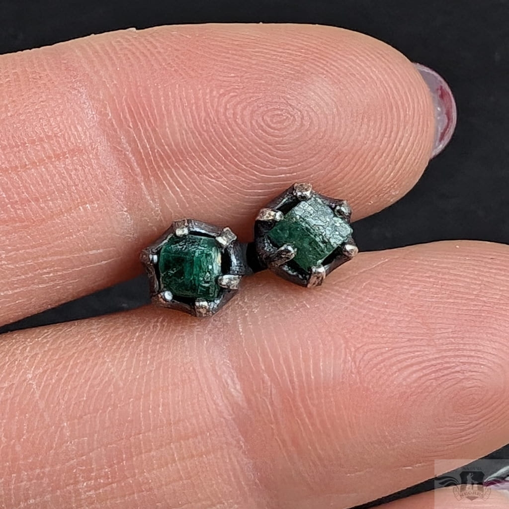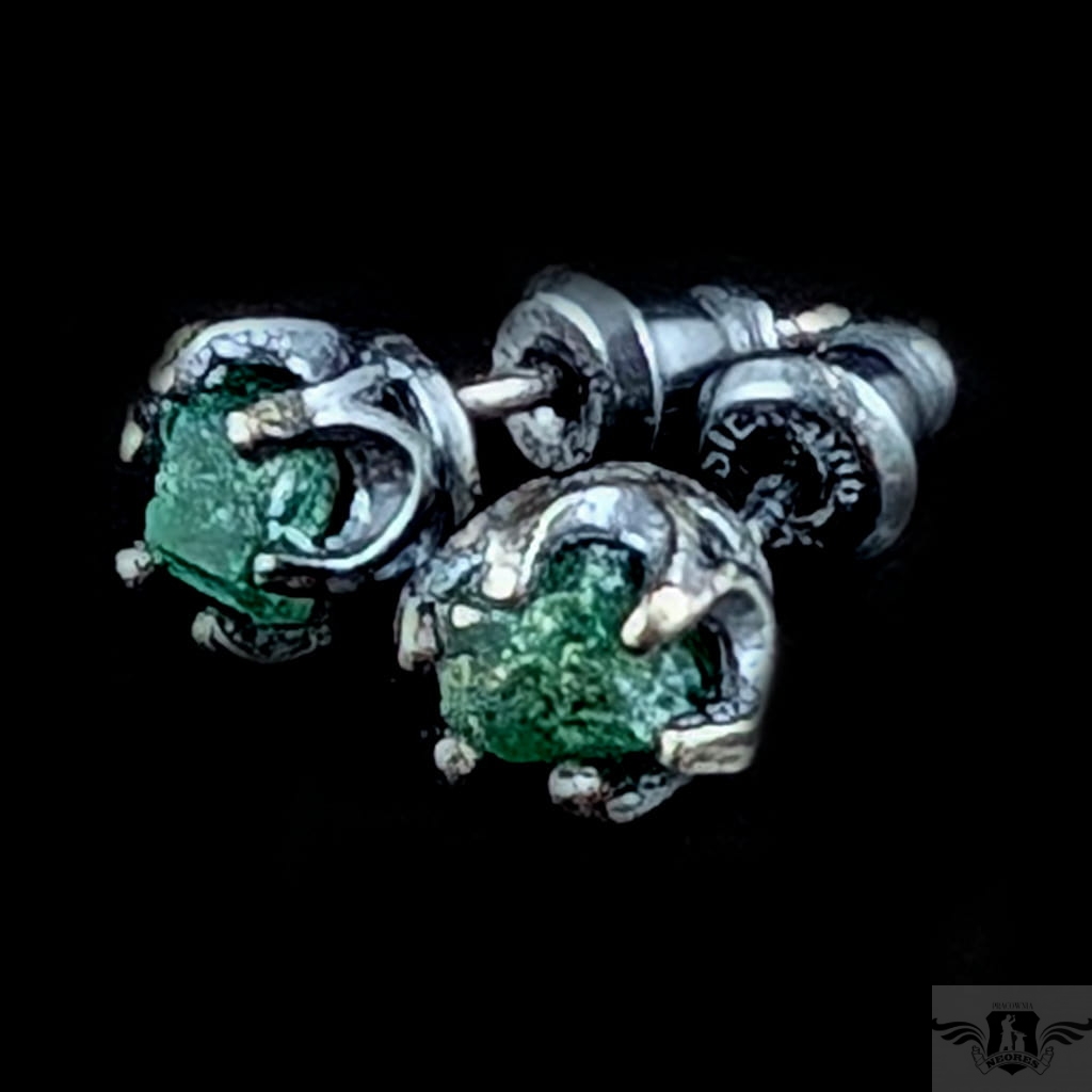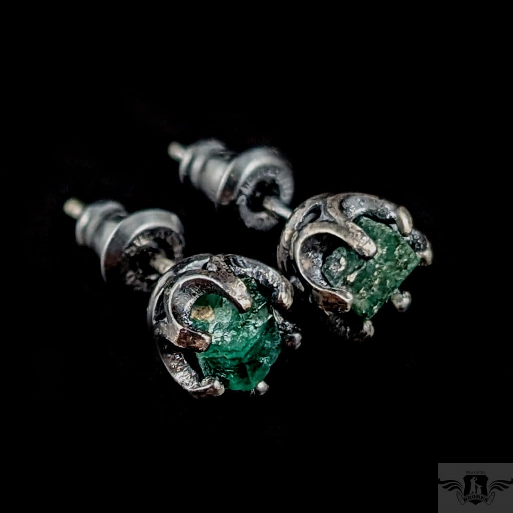 Surowe kolczyki wykonane z oksydowanego srebra próby 925.W prostą cargę oprawione zostały surowe szmaragdy. Wymiary oprawy nieregularnych bryłek szmaradgu 7 mm. Waga jednego kolczyka 0,8 g. Kolczyki zostaną zapakowane w ozdobne pudełeczko.