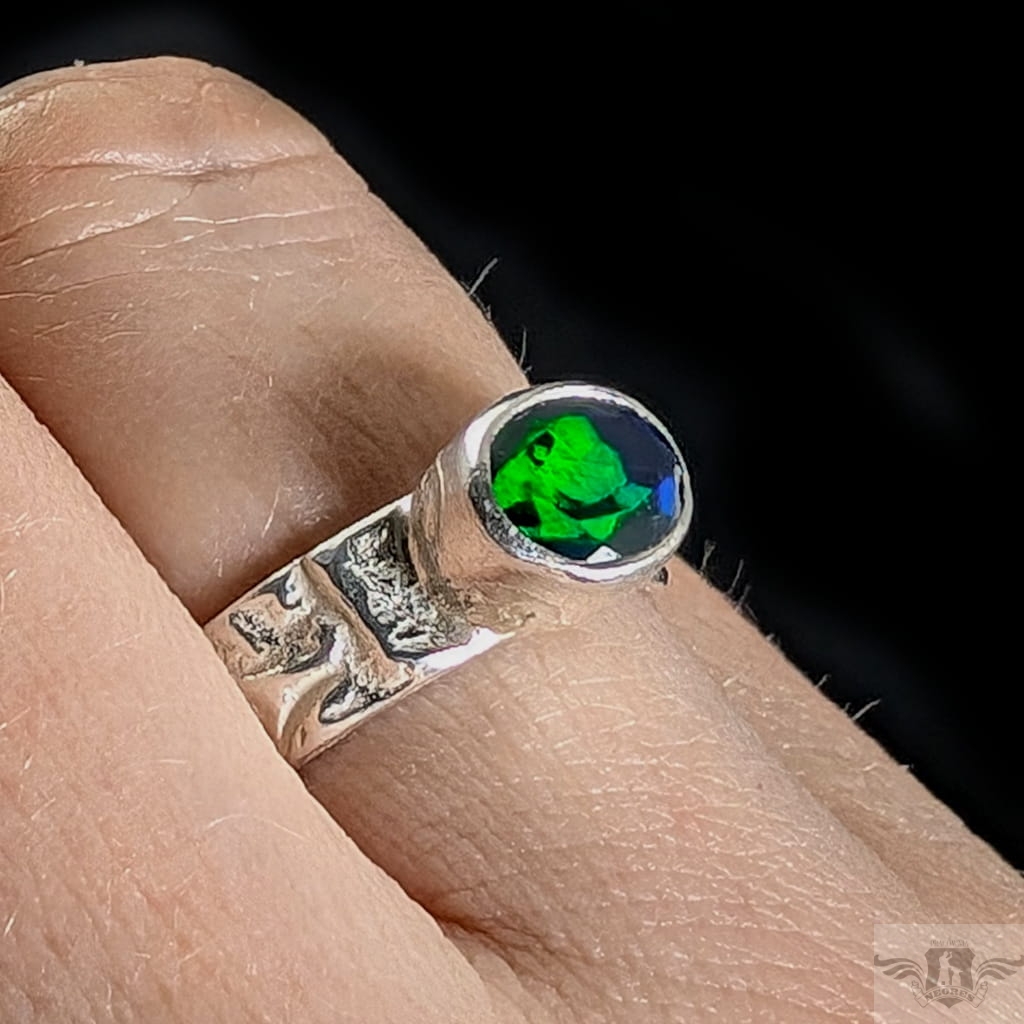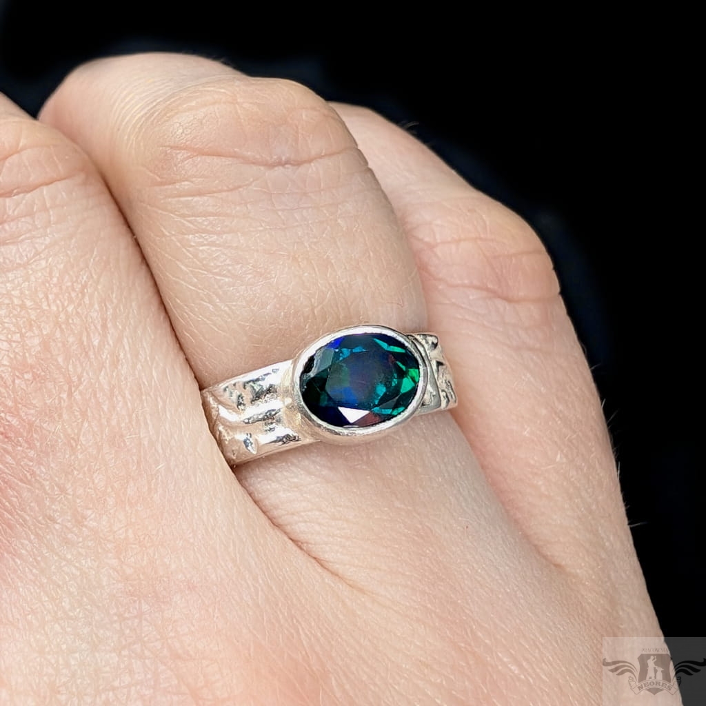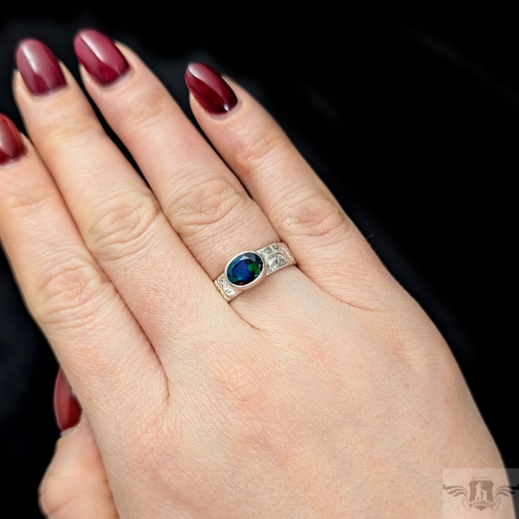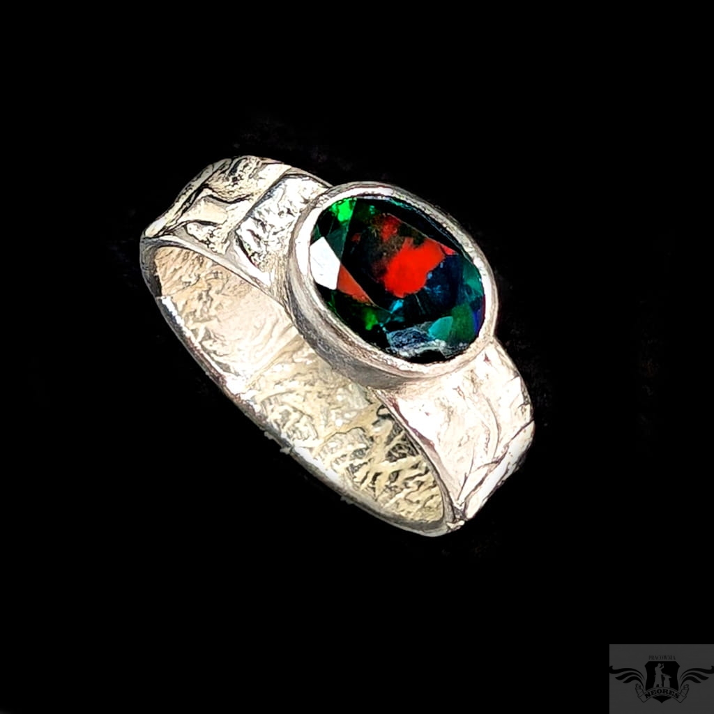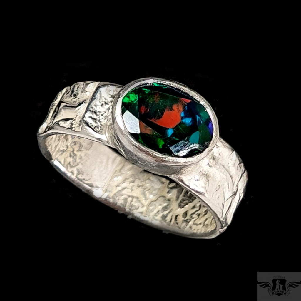 Oryginalny pierścionek z przepięknym czarnym opalem etiopskim oprawionym w srebro 925. Rozmiar jubilerski 14, Możliwe powiększenie do rozmiaru 15. Obrączka ma 5 mm szerokości. Oprawa kamienia 9 x 7 mm. Waga 4,2 g. Pierścień zostanie zapakowany w ozdobne pudełeczko.