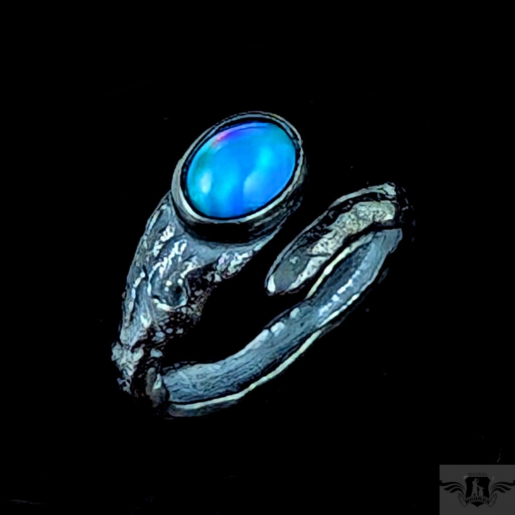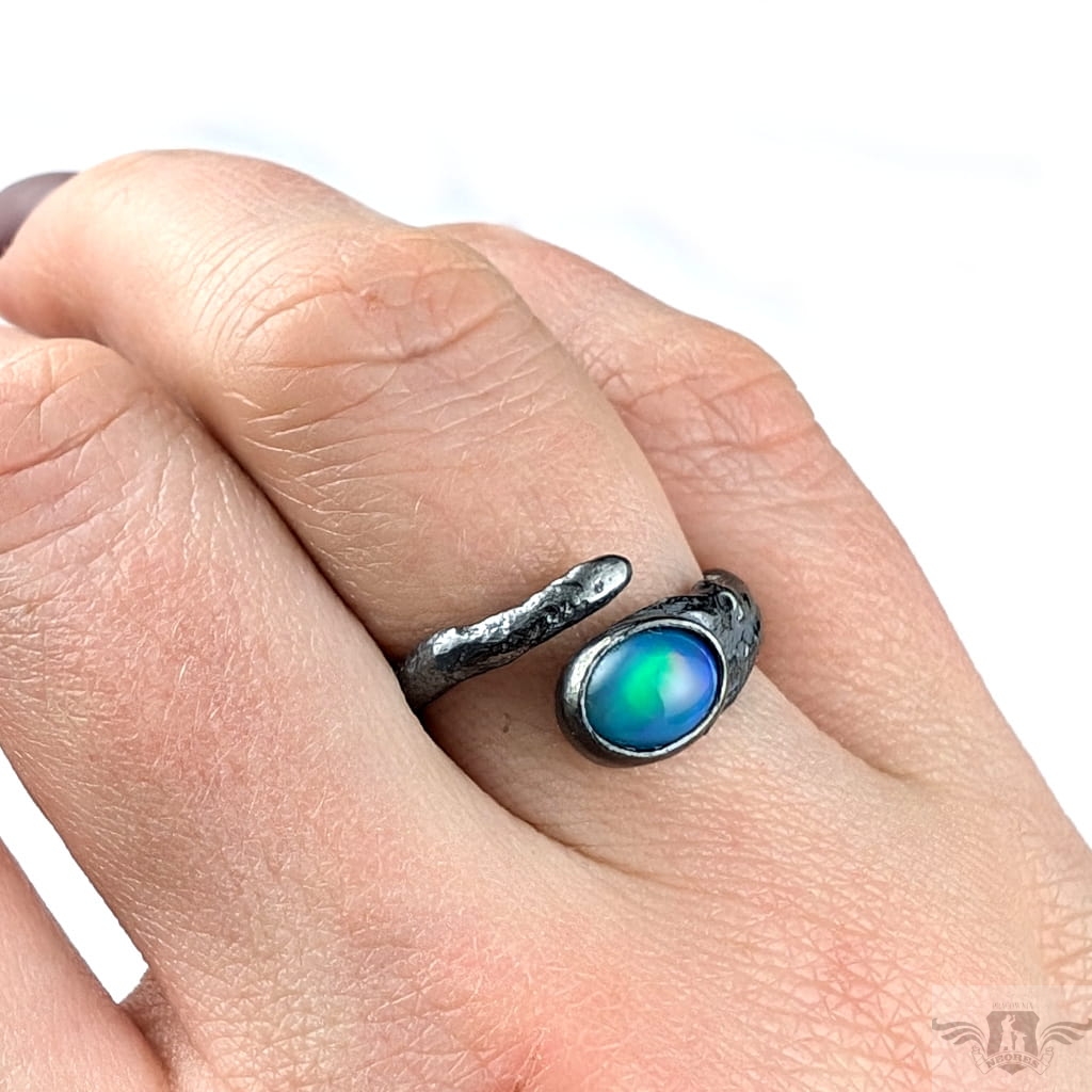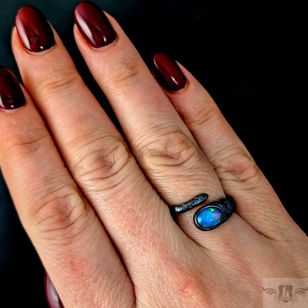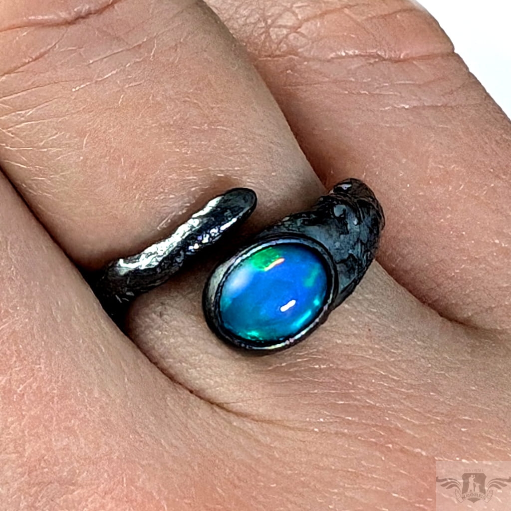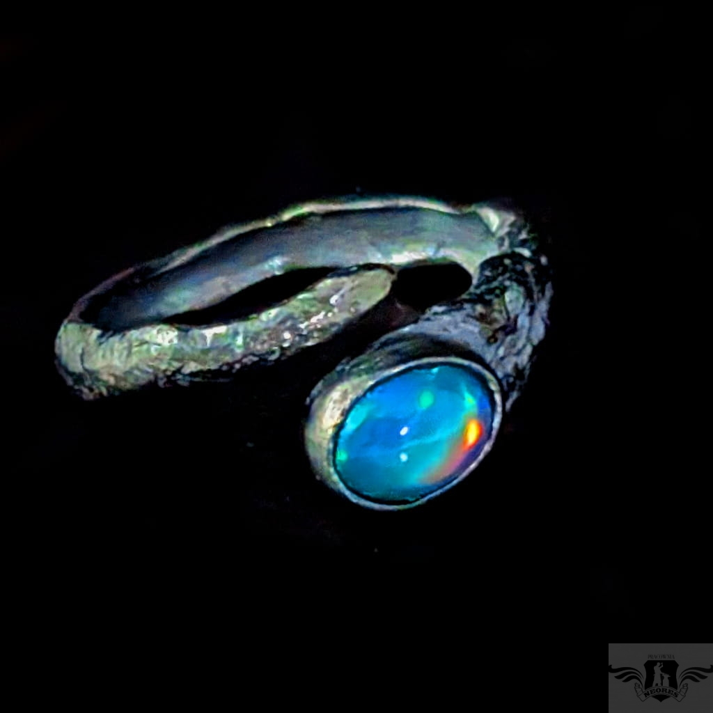 Pierścionek wykonany z oksydowanego srebra próby 925. Rozmiar pierścionka dzięki otwartej podstawie regulowany, mogę dopasować na dowolny rozmiar w zakresie 9-21. Ozdobą pierścionka jest multibarwny, piękny opal z Etiopii. Wymiary oprawy kamienia 9 x 7 mm, szerokość maksymalna obrączki 6 mm, min. 4 mm. Waga 4 g. Pierścień zostanie zapakowany w ozdobne pudełeczko.