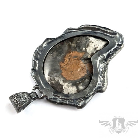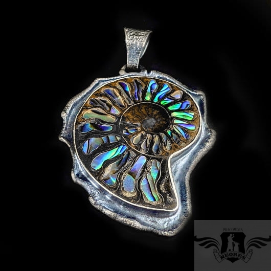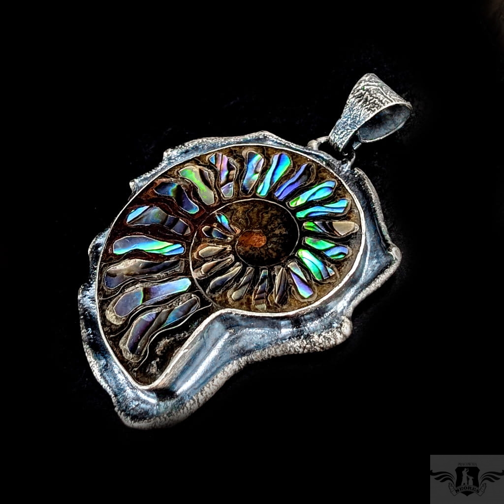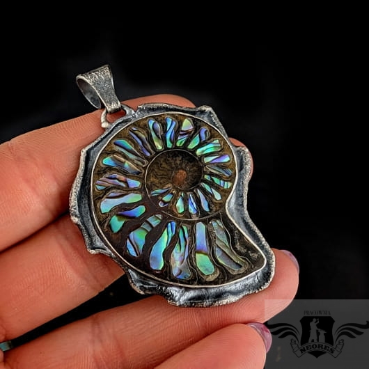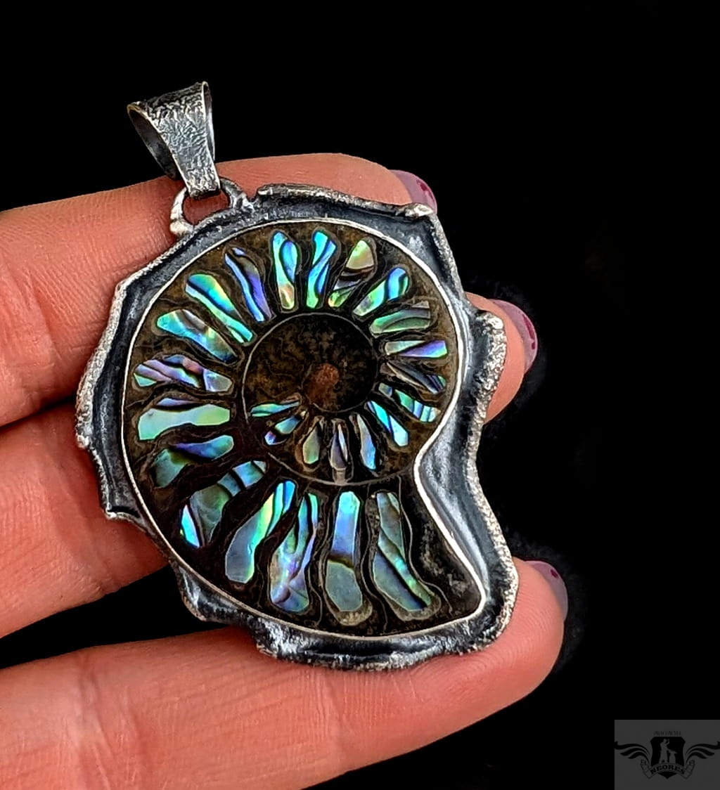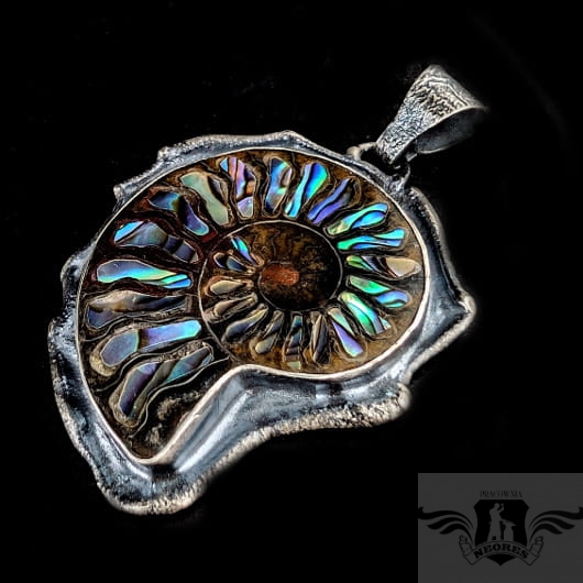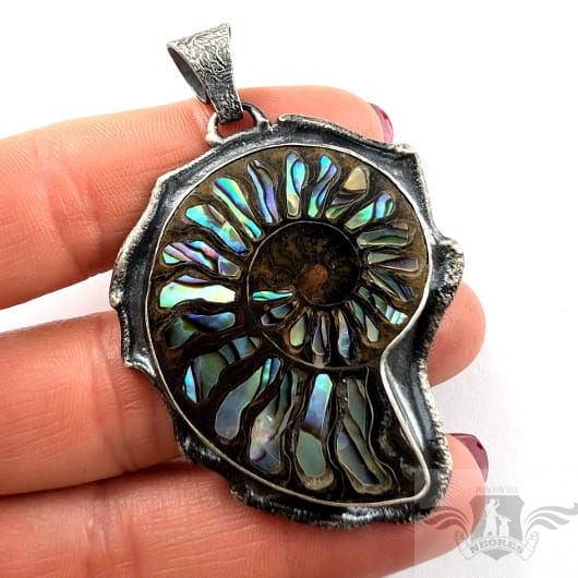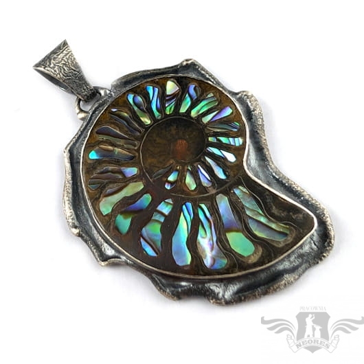 Zjawiskowo piękny wisior zapierający dech, wykonany ze srebra próby 925, które zostało zaoksydowane. Bardzo okazały amonit inkrustowany macicą perłową (masa perłowa). Wymiary oprawy 48 X 43 mm, długość z krawatka 60 mm, 15, 5 g. Polecam, jest niezwykły. Zapakowany w ozdobne pudełeczko.